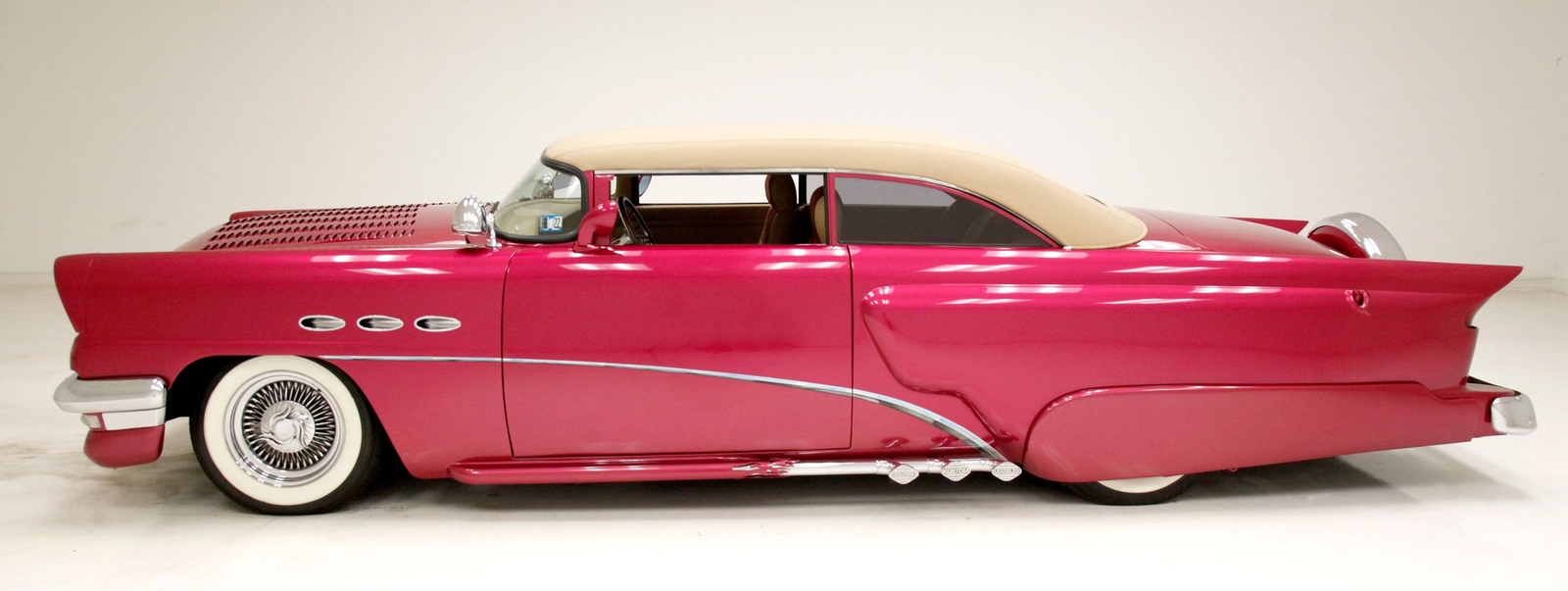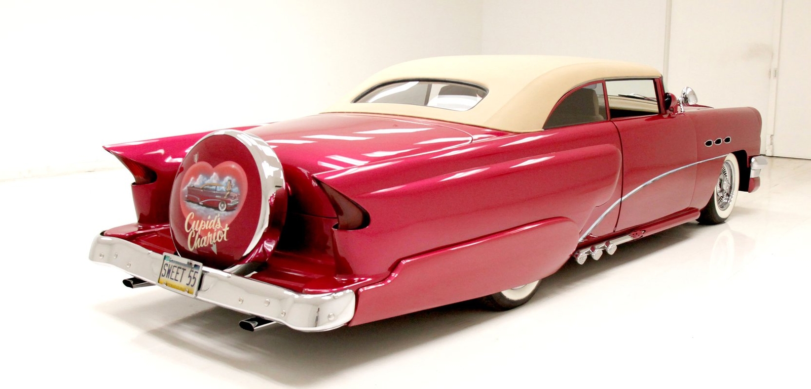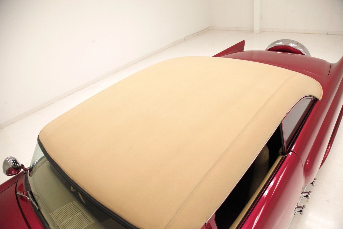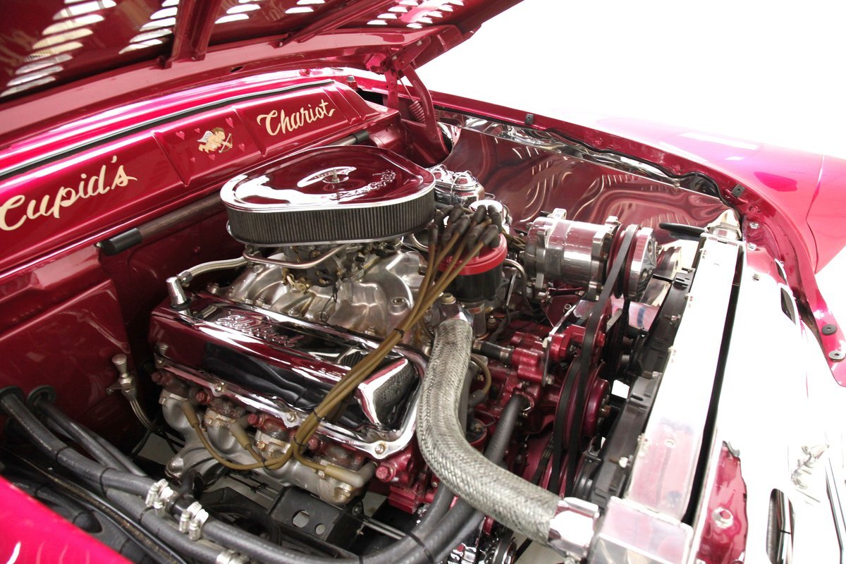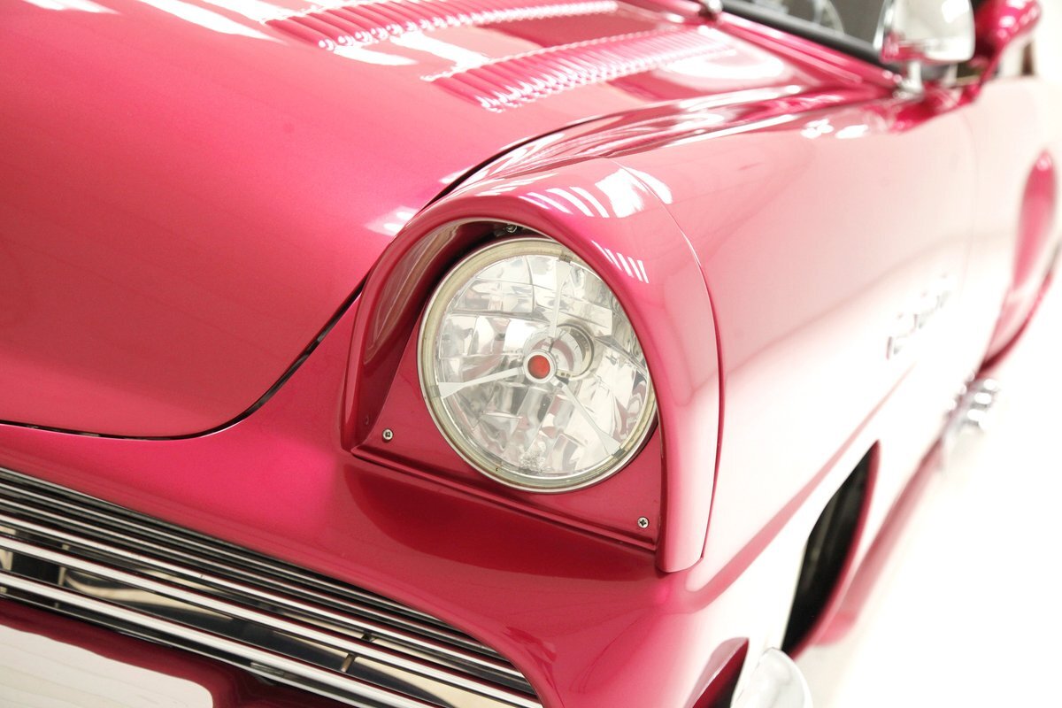 From the custom tube grille to the Packard taillights and continental rear bumper, this consignment oozes cool, and is in the dictionary as an example picture under the word cruiser. Shades of the Batmobile for the custom headlights which are visored and a great beginning to the wonderful Buick porthole styled front quarter. Chromed rods are halved by a large shiny bumper, and below more candy for the chin panel. The hood has been shaved of any badging and has been totally louvered in lieu of a hood scoop. Looking down either side its 50's solid gold design with a chromed diving swoop trim spear, the trio of oval Buick porthole vents just aft of the wheel well. On the back a body bump out replaces what was chrome trimmings and a custom integrated fender skirt seamlessly melts into the rear bumper. The bottom of the rockers are framed with lake pipes, old skool kewl fer sur. All these big steel panels are bathed in custom PPG raspberry or what this writer would lovingly refer to from now on as Flamingo! The top has been chopped and refitted neatly around the wrap-around windshield and it is covered perfectly with Mercedes Benz Natural, (beige), canvas. All trimmings for the glass are in the Flamingo save for the rear glass which came off of a 48 Chevy has weatherstripping. Door handles are shaved, and have teardrop mirrors, and dummy spotlights attached. Looking to the back of course the Continental rear bumper which sports a custom airbrushed artwork of "Cupid's Chariot" which is certainly aptly named because I'm already in love! Frenched taillights are like a 55 Chevy on steroids which have been willingly donated from a Packard. Glistening on all 4 corners are chromed wire wheels with flame motif knockoff hubs. These are wrapped by wide whites and are stunningly beautiful not unlike the rest of the above exterior!