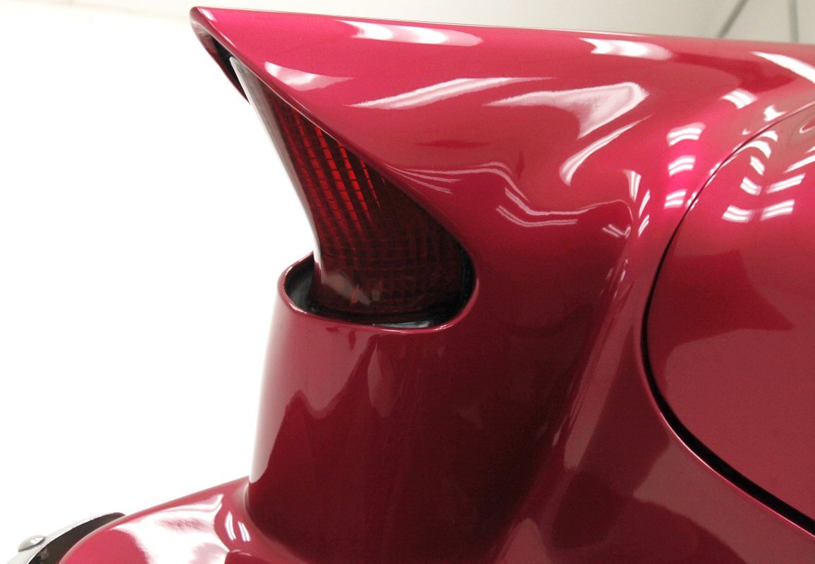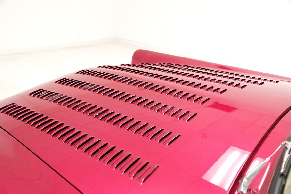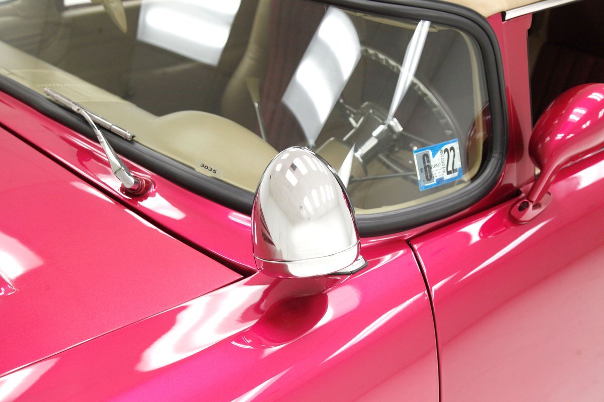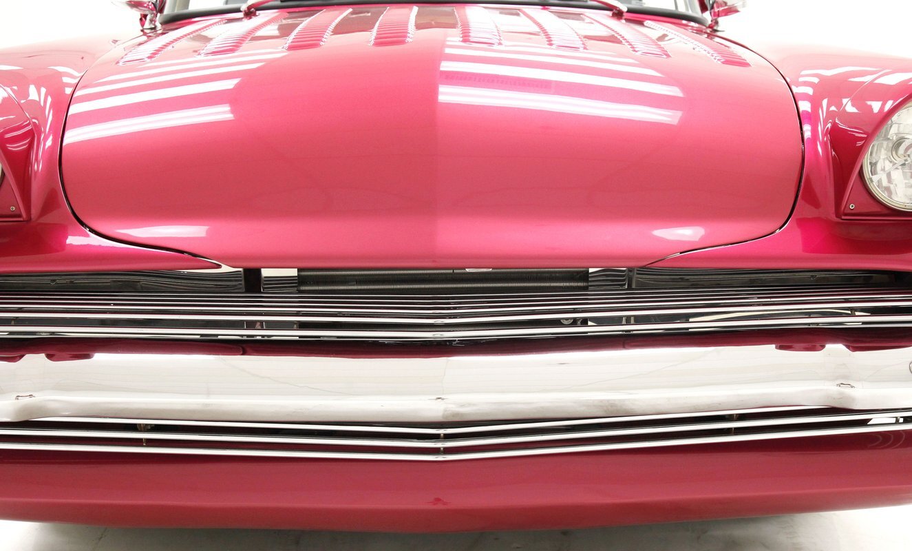 From the custom tube grille to the Packard taillights and continental rear bumper, this consignment oozes cool, and is in the dictionary as an example picture under the word cruiser. Shades of the Batmobile for the custom headlights which are visored and a great beginning to the wonderful Buick porthole styled front quarter. Chromed rods are halved by a large shiny bumper, and below more candy for the chin panel. The hood has been shaved of any badging and has been totally louvered in lieu of a hood scoop. Looking down either side its 50's solid gold design with a chromed diving swoop trim spear, the trio of oval Buick porthole vents just aft of the wheel well. On the back a body bump out replaces what was chrome trimmings and a custom integrated fender skirt seamlessly melts into the rear bumper. The bottom of the rockers are framed with lake pipes, old skool kewl fer sur. All these big steel panels are bathed in custom PPG raspberry or what this writer would lovingly refer to from now on as Flamingo! The top has been chopped and refitted neatly around the wrap-around windshield and it is covered perfectly with Mercedes Benz Natural, (beige), canvas. All trimmings for the glass are in the Flamingo save for the rear glass which came off of a 48 Chevy has weatherstripping. Door handles are shaved, and have teardrop mirrors, and dummy spotlights attached. Looking to the back of course the Continental rear bumper which sports a custom airbrushed artwork of "Cupid's Chariot" which is certainly aptly named because I'm already in love! Frenched taillights are like a 55 Chevy on steroids which have been willingly donated from a Packard. Glistening on all 4 corners are chromed wire wheels with flame motif knockoff hubs. These are wrapped by wide whites and are stunningly beautiful not unlike the rest of the above exterior!