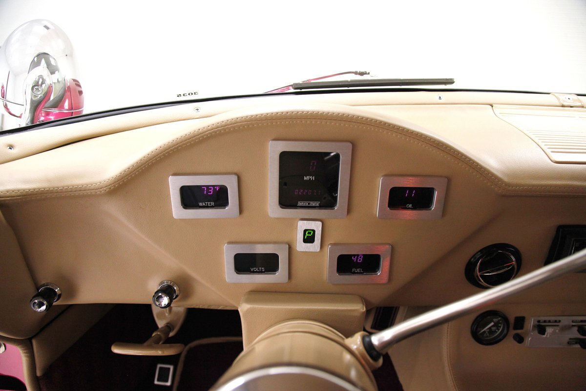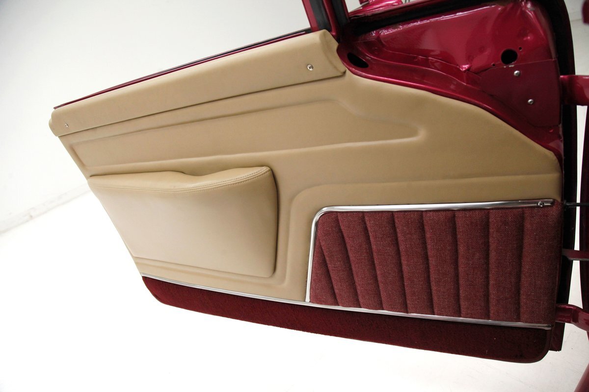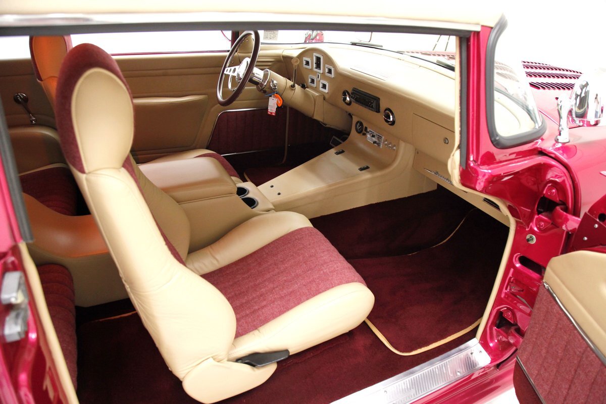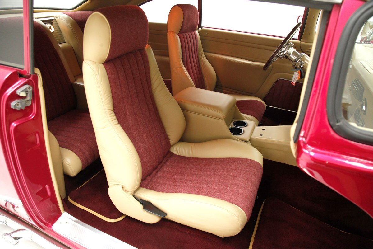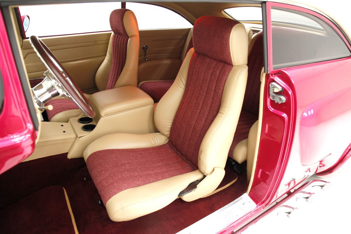 In keeping with the custom theme we pop the shaved doors and see a vertical panel of tuck and roll canvas textured Raspberry broadcloth with a beige panel above and blood red carpeting below. Inside the front buckets use the same with the Raspberry canvas textured tuck and roll inserts, and beige leather bolsters which are smooth as silk. These buckets and a matching rear dual bucket bench-like seat with console all float in a sea of blood red carpeting. The car is halved inside by a V shaped leather covered center console. As it races up to the dash which is also in beige leather, and it is total custom with square and rectangular Dakota Digital gauges. A wood rimmed rally steering wheel fronts this beauty and is a tilting column. Other dash features are power windows, a digital AM/FM/CD player and Vintage Air. We need to give a shout out to the trunk which has also been finished off in the broadcloth tuck and roll and beige leather and has thick blood red carpeting. Hey and it's a trunk!
