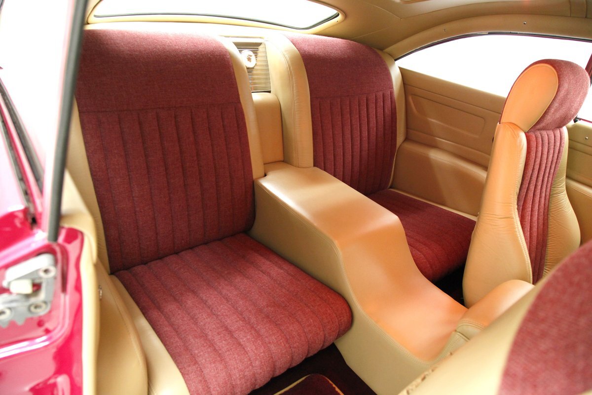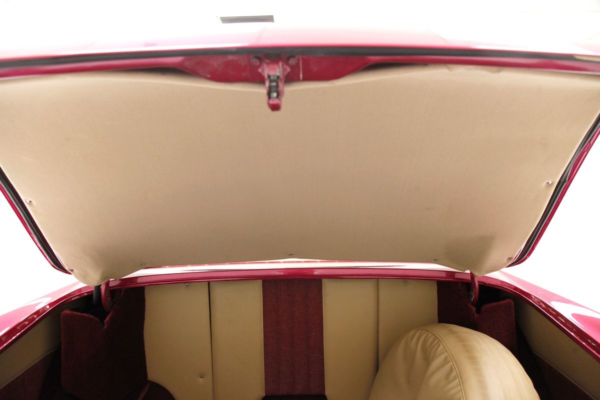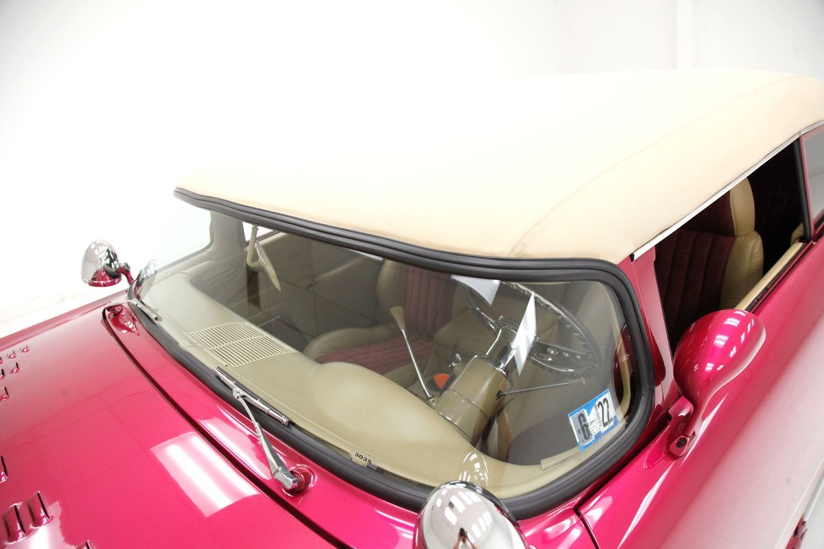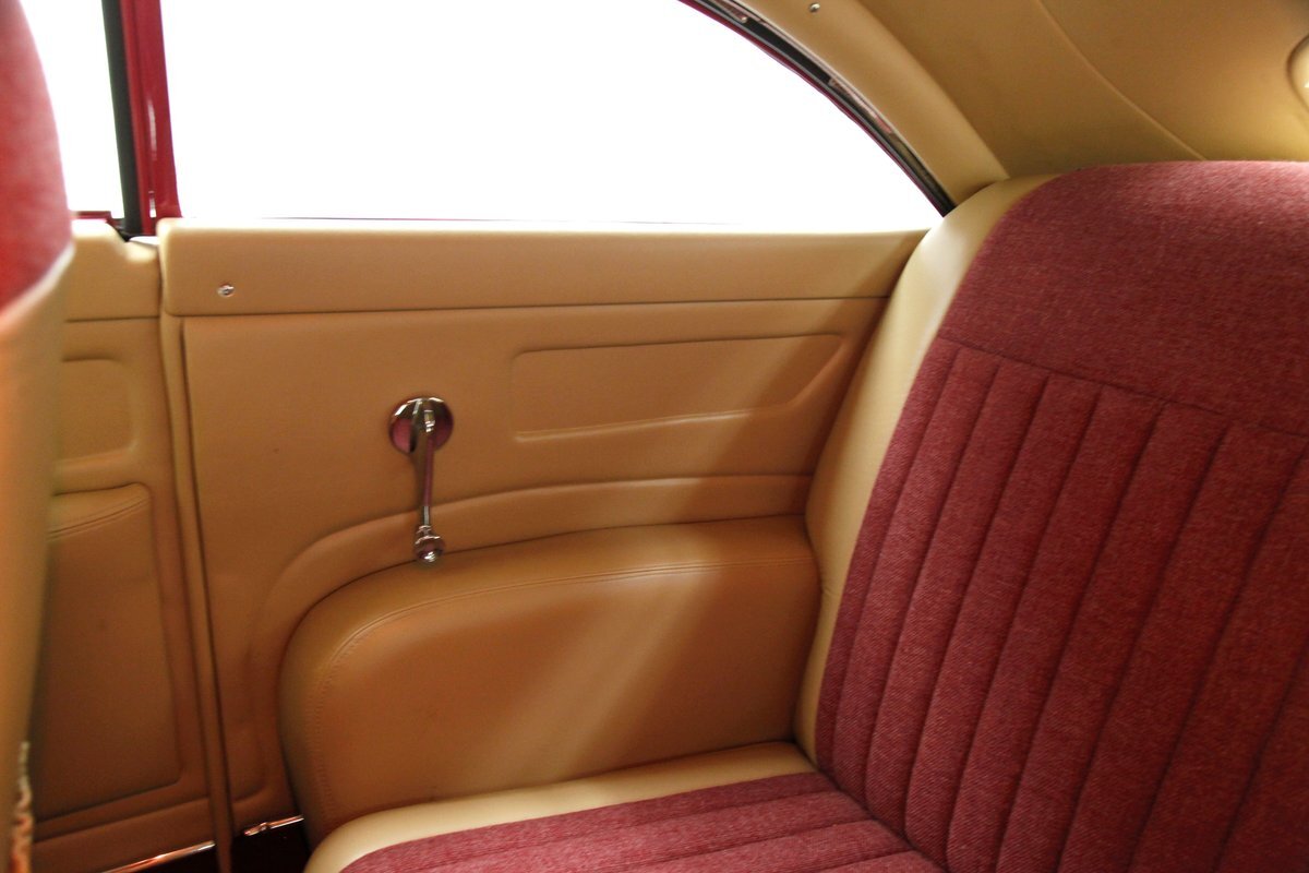 In keeping with the custom theme we pop the shaved doors and see a vertical panel of tuck and roll canvas textured Raspberry broadcloth with a beige panel above and blood red carpeting below. Inside the front buckets use the same with the Raspberry canvas textured tuck and roll inserts, and beige leather bolsters which are smooth as silk. These buckets and a matching rear dual bucket bench-like seat with console all float in a sea of blood red carpeting. The car is halved inside by a V shaped leather covered center console. As it races up to the dash which is also in beige leather, and it is total custom with square and rectangular Dakota Digital gauges. A wood rimmed rally steering wheel fronts this beauty and is a tilting column. Other dash features are power windows, a digital AM/FM/CD player and Vintage Air. We need to give a shout out to the trunk which has also been finished off in the broadcloth tuck and roll and beige leather and has thick blood red carpeting. Hey and it's a trunk!