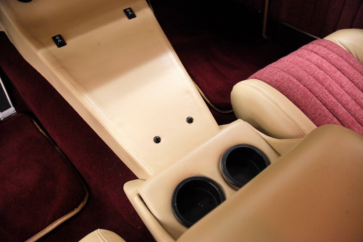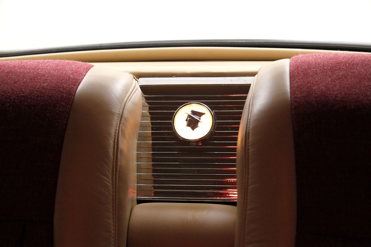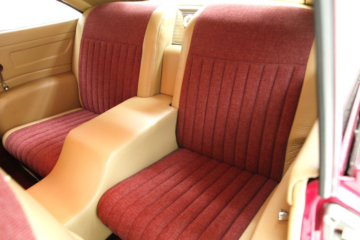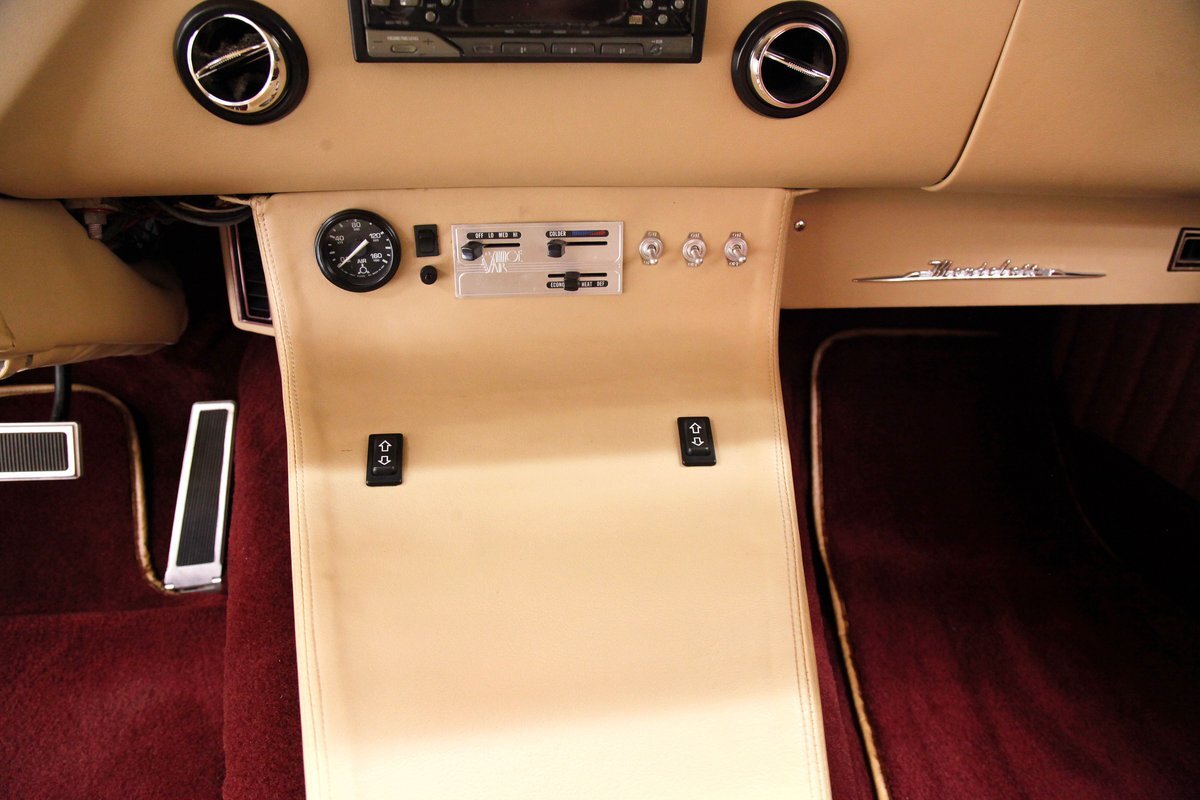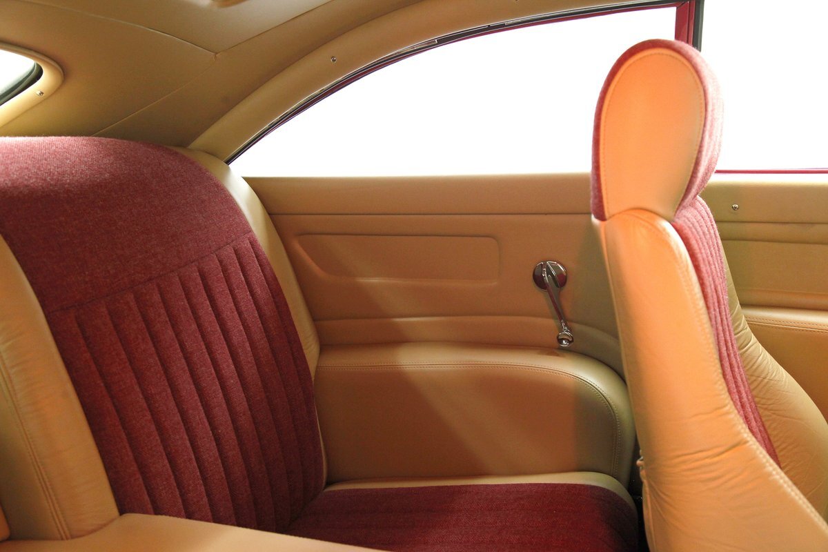 In keeping with the custom theme we pop the shaved doors and see a vertical panel of tuck and roll canvas textured Raspberry broadcloth with a beige panel above and blood red carpeting below. Inside the front buckets use the same with the Raspberry canvas textured tuck and roll inserts, and beige leather bolsters which are smooth as silk. These buckets and a matching rear dual bucket bench-like seat with console all float in a sea of blood red carpeting. The car is halved inside by a V shaped leather covered center console. As it races up to the dash which is also in beige leather, and it is total custom with square and rectangular Dakota Digital gauges. A wood rimmed rally steering wheel fronts this beauty and is a tilting column. Other dash features are power windows, a digital AM/FM/CD player and Vintage Air. We need to give a shout out to the trunk which has also been finished off in the broadcloth tuck and roll and beige leather and has thick blood red carpeting. Hey and it's a trunk!