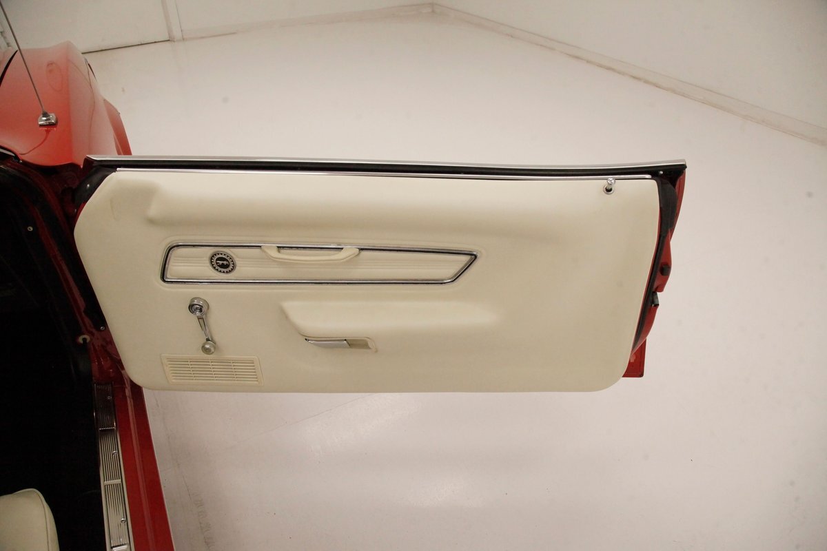Swinging one of the two doors open we are met with 2 sporty recovered high back buckets with white textured inserts and smooth white vinyl bolsters. In back is a matching bench stretching across the back. These seats are recovered with standard vinyl upholstery instead of the upscale XR-7 leather. Molded white vinyl makes up the door panels with nice chrome trimmed leather inserts, window cranks and a mirror joystick on the driver's door. Being a XR-7 the dash has a nice burl walnut applique with 4 deeply inset gauge pods. This applique panel continues partially across the dash and surrounds some auxiliary gauge pods as well as heater/AC vents. Below is a black horizontal panel that has a few toggles and chrome pull knobs. In the center dash we note the temperature slides and the factory AM/FM stereo. This central part of the dash cascades down to meet the short black center console complete with the chrome armed Hurst shifter. Clean black carpet floods the floors and is looking factory fresh.