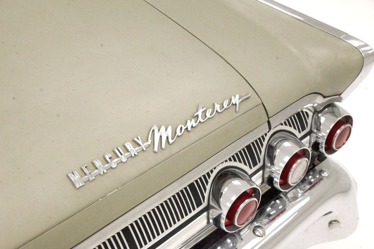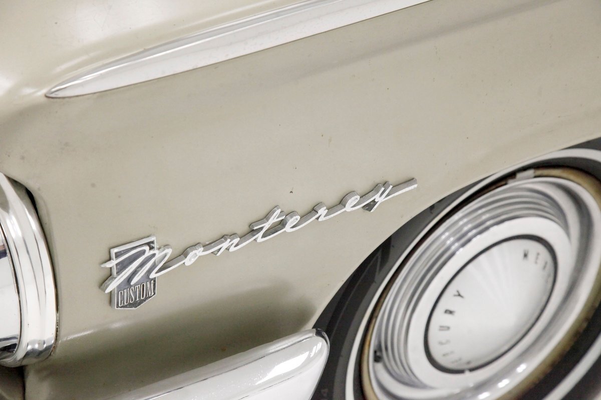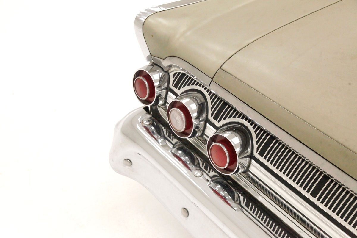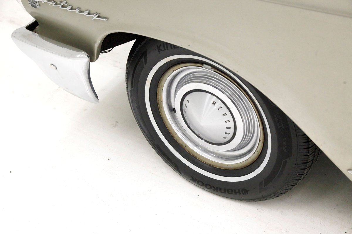 A chromed inward V shaver style front grille has dual wide bezel headlights on either side and it leads the way proudly. A wide curved wrap around bumper is below and now we can talk about the steel, of which I can mention has no rust, plenty of patina as it is original Castilian Gold paint from the factory. The gaps are well minded, the doors have nice chromed window framing and the roofline is truly unique in its own cool way particularly on that B pillar. A long, LONG trunk line sporting a tasteful fin on either side frames another "shaver" styled back end chrome piece that has 3 Dixie cup shaped tail lights on either edge and a near perfect chromed bumper below. Badging looks just fab and oh that roll down rear glass, no other car that was even remotely successful can tout having that. This, a pre A/C car that boosted Mercury sales in '63. The car rides on 14-inch wheels wrapped in 215/75R14 thin whitewall, (like the ties of the era), tires. Groovy and hip in a West Coast kinda way. Also showing some success in life, as it's a Mercury.