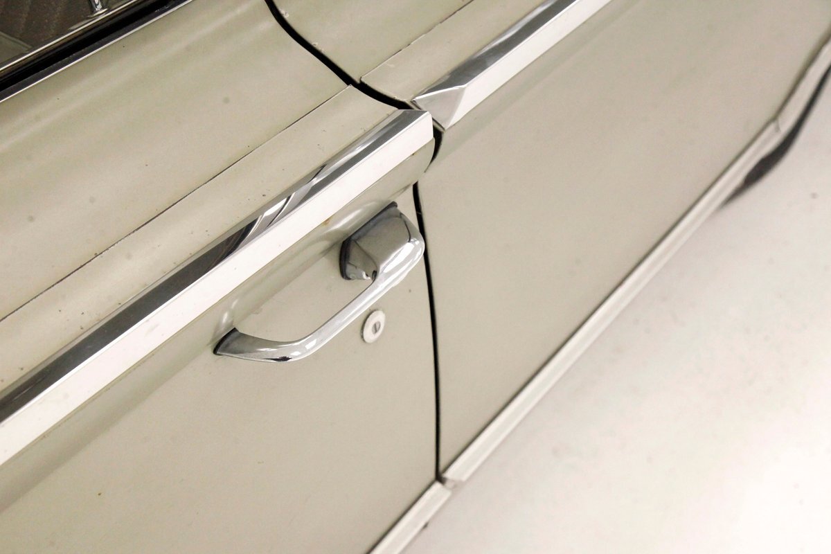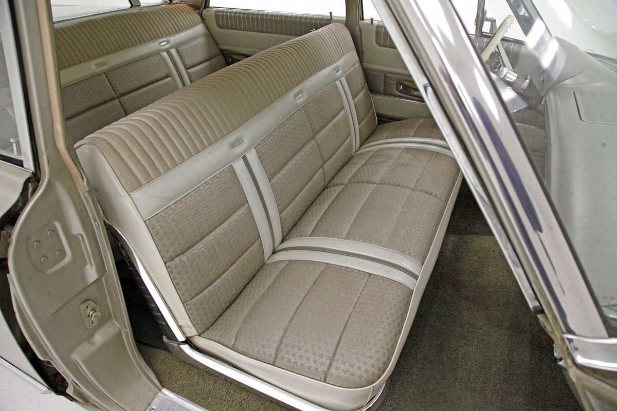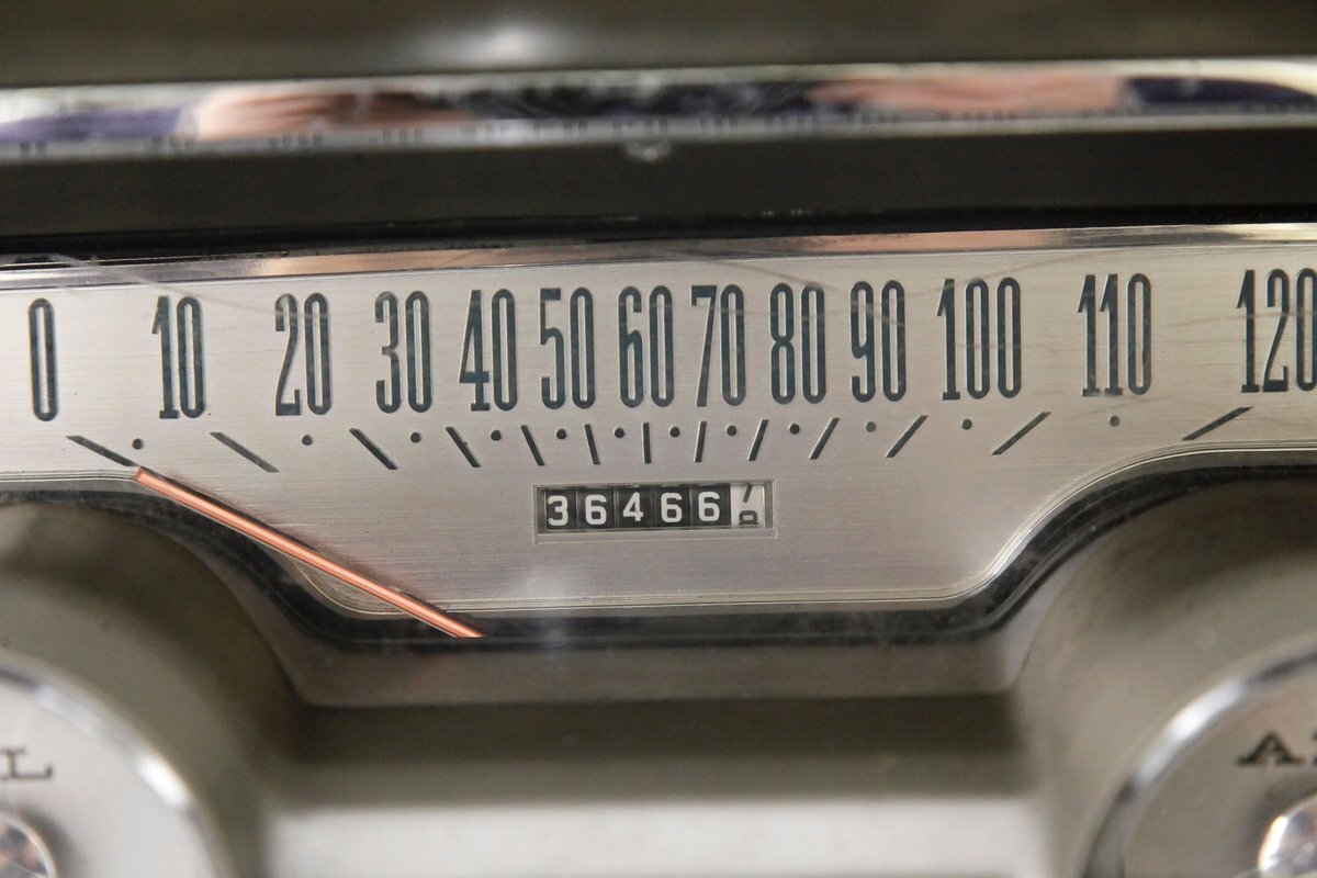 Now we're talking' as we swing the doors, it's the money shot with panels that interplay gold stitched tuck and roll vinyl with a warm cream vinyl and thin chrome strips as delineations. Rich looking shiny cranks and the paddle actuator in the front of the armrest complete the package. Take a deep breath and breathe it in, (I mean the 60's are about to flood your senses), as we sit upon probably the coolest retro seat coverings my bottom has experienced! Yes kids we are talking stitched with metal thread in gold tuck and roll vertical and square pattern for the seats and backs in broadcloth. On the tops, a thinner tuck and roll broadcloth in gold make an appearance. Breaking up these gold panels are the warm cream vinyl with just enough width to add interest that you cannot look away from. On the center of these "stripes" is a gold thin vinyl piece to break it up as well...just genius. And let me tell you this seating is just beautifully preserved, (do I sound like a used car salesman??!), I'm just in love! Ok, on to the dash where I'm on the stick of the Millennium Falcon when I look through the two tone plastic cream and gold steering wheel, very large and in charge. I see a curved speedo within a brushed aluminum field, those low original miles on the odometer, and just below a lineup of round visored chrome bezel gauges. And below that more candy for the eyes with a curved inward ribbed chrome background panel housing the ignition, and a lineup of 60's style pulls and knobs. All this mounted in a gold metal shaped dash front. The chrome and ribbed curved action continues as we move across the dash to the temp sliders, radio, and clock all with in more vertical ribbed chrome, ( I almost can't take it!), and finally to the glovebox with ....you guessed it vertical ribbed chrome and a metal gold painted bottom and that just the door. Ahhhhh I'm ready for a cigarette! Actually I need to tell you that the floors have clean gold carpeting and the headliner is a tight warm white stitched broadcloth. Now hand me that match.