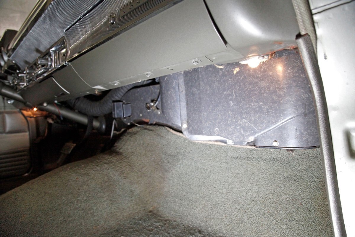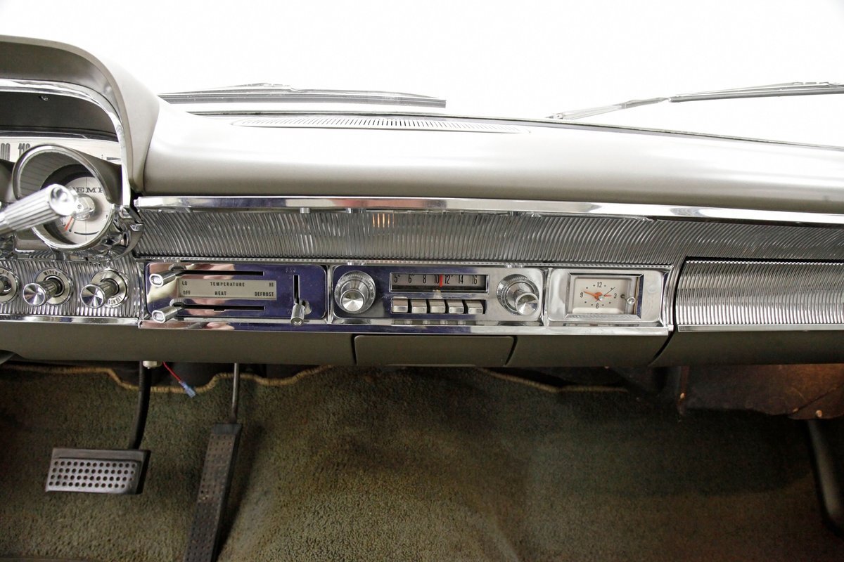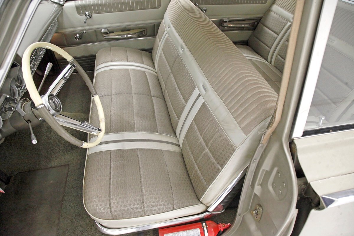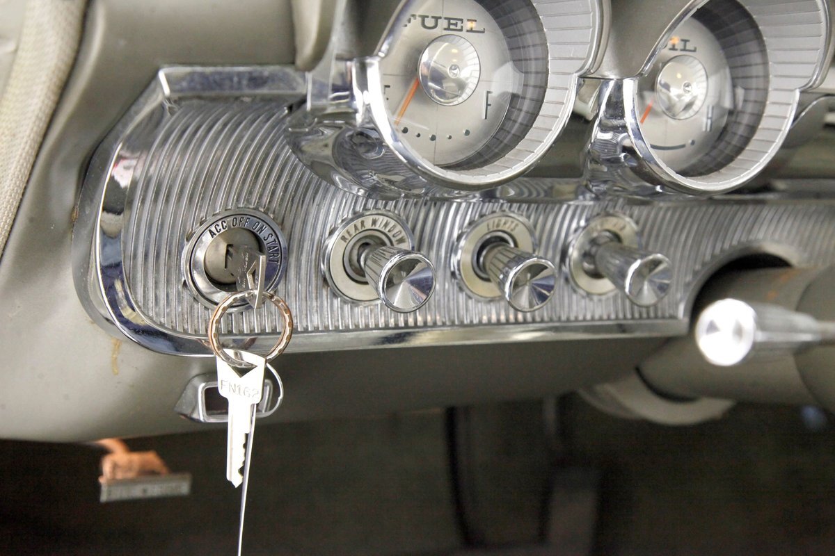 Now we're talking' as we swing the doors, it's the money shot with panels that interplay gold stitched tuck and roll vinyl with a warm cream vinyl and thin chrome strips as delineations. Rich looking shiny cranks and the paddle actuator in the front of the armrest complete the package. Take a deep breath and breathe it in, (I mean the 60's are about to flood your senses), as we sit upon probably the coolest retro seat coverings my bottom has experienced! Yes kids we are talking stitched with metal thread in gold tuck and roll vertical and square pattern for the seats and backs in broadcloth. On the tops, a thinner tuck and roll broadcloth in gold make an appearance. Breaking up these gold panels are the warm cream vinyl with just enough width to add interest that you cannot look away from. On the center of these "stripes" is a gold thin vinyl piece to break it up as well...just genius. And let me tell you this seating is just beautifully preserved, (do I sound like a used car salesman??!), I'm just in love! Ok, on to the dash where I'm on the stick of the Millennium Falcon when I look through the two tone plastic cream and gold steering wheel, very large and in charge. I see a curved speedo within a brushed aluminum field, those low original miles on the odometer, and just below a lineup of round visored chrome bezel gauges. And below that more candy for the eyes with a curved inward ribbed chrome background panel housing the ignition, and a lineup of 60's style pulls and knobs. All this mounted in a gold metal shaped dash front. The chrome and ribbed curved action continues as we move across the dash to the temp sliders, radio, and clock all with in more vertical ribbed chrome, ( I almost can't take it!), and finally to the glovebox with ....you guessed it vertical ribbed chrome and a metal gold painted bottom and that just the door. Ahhhhh I'm ready for a cigarette! Actually I need to tell you that the floors have clean gold carpeting and the headliner is a tight warm white stitched broadcloth. Now hand me that match.