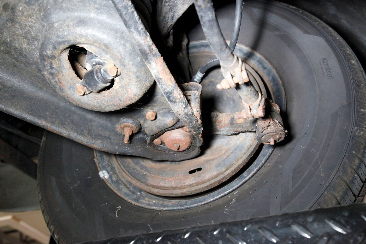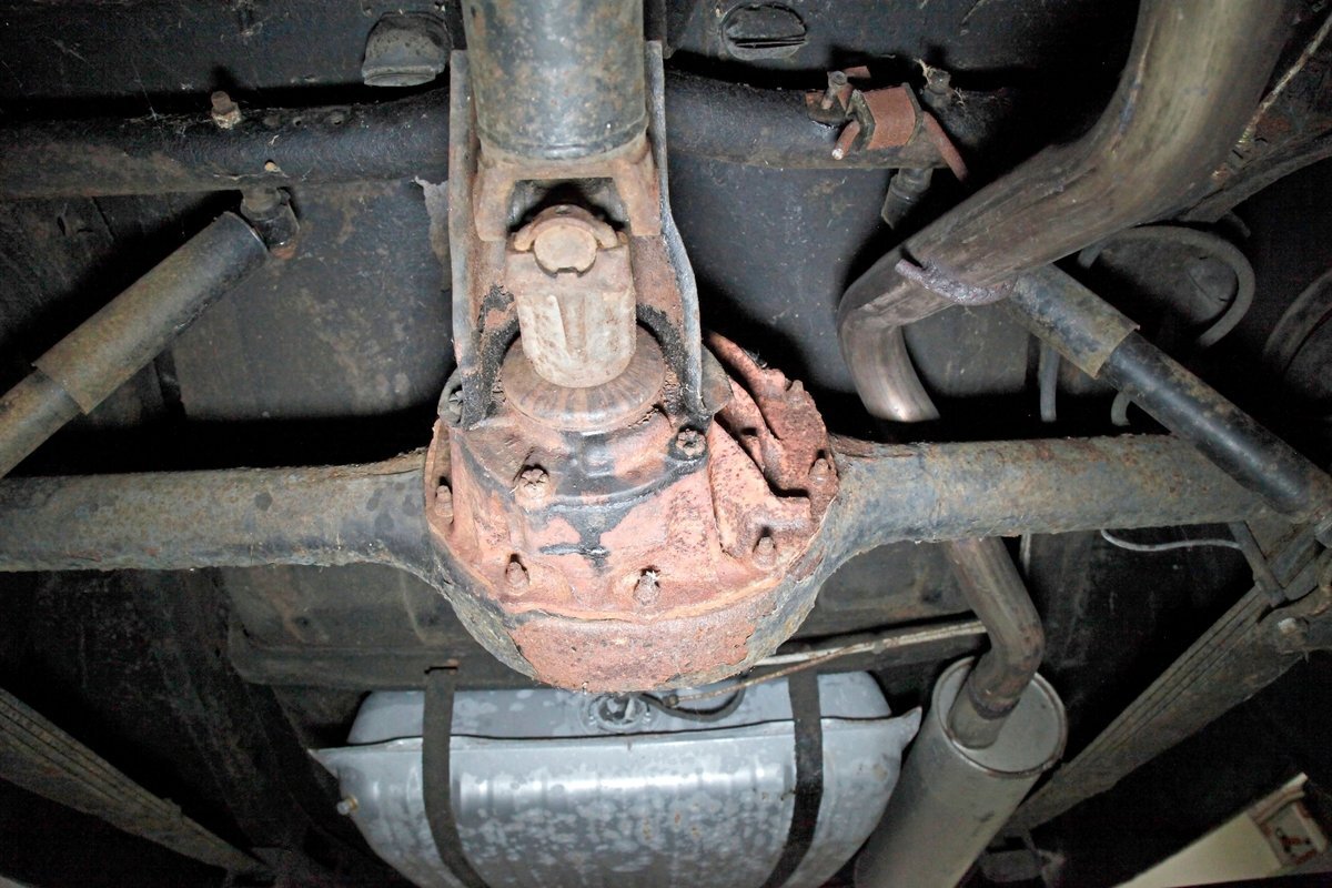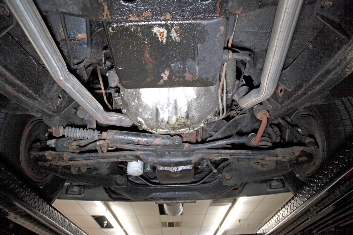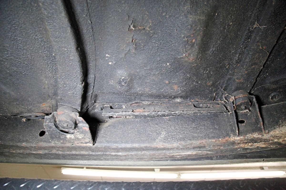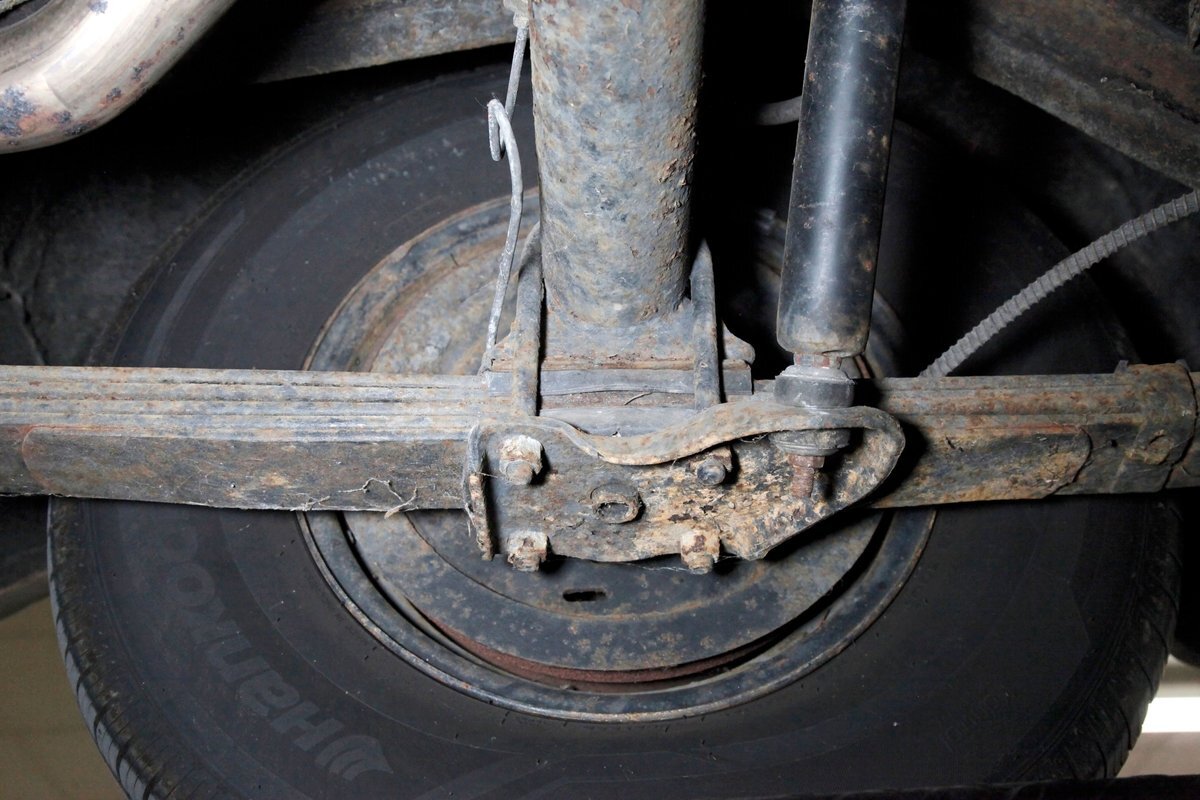 To the lift Batman! And here we see some surface rust, slight peel off of the undercoating, and lots of patina. A new fuel tank is on, and the floor pans and rockers are structurally sound. Some road dirt has embedded itself in the suspension which is front independent coil springs and rear leaf springs. Drum brakes are all around.