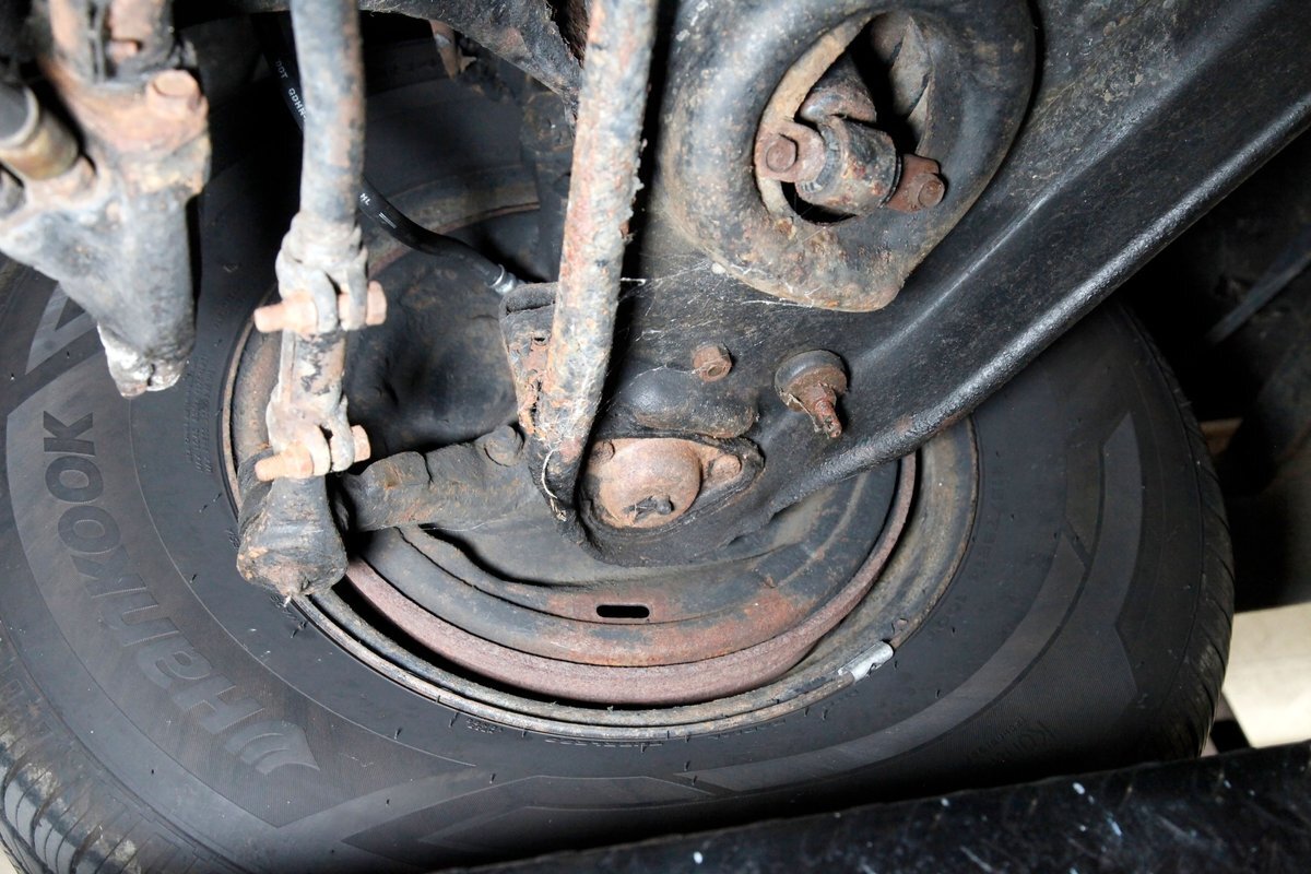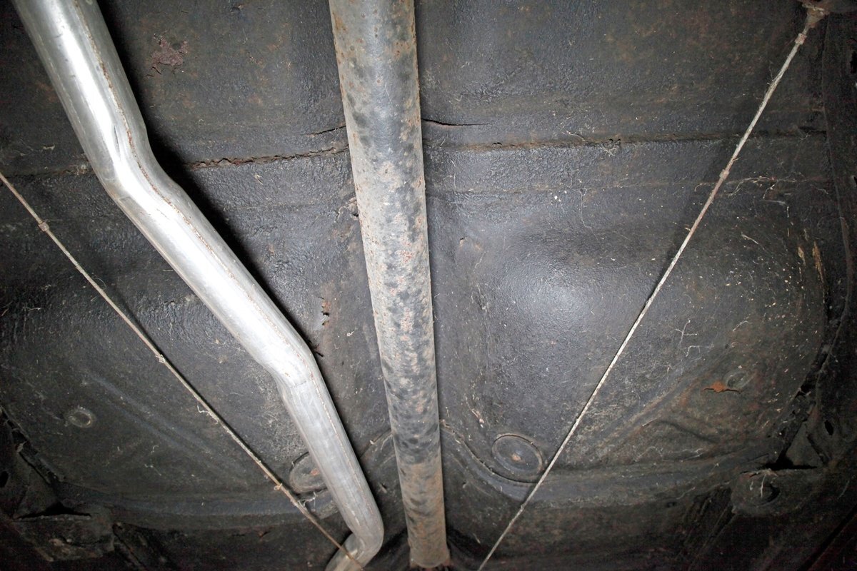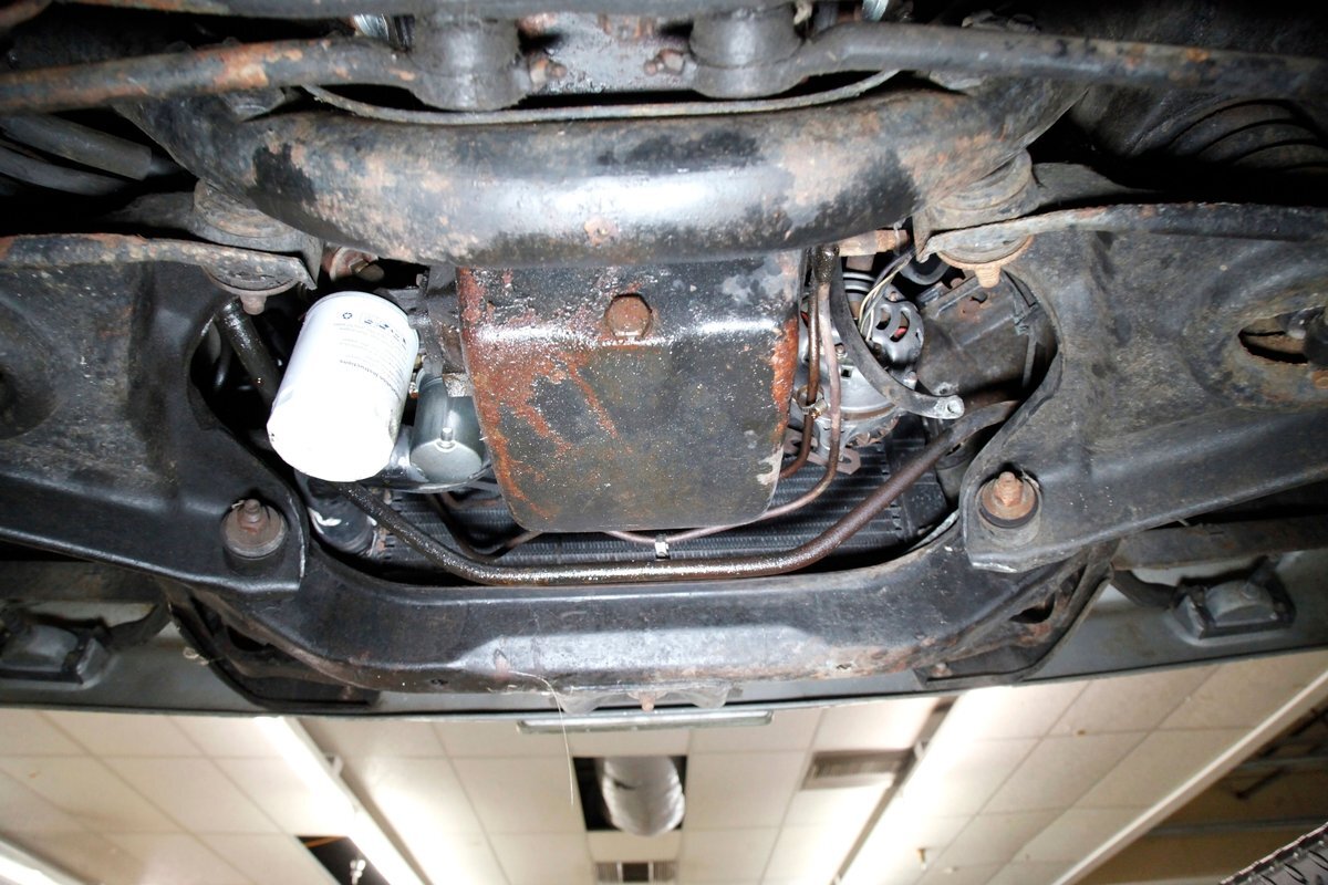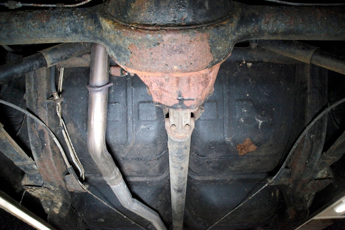 To the lift Batman! And here we see some surface rust, slight peel off of the undercoating, and lots of patina. A new fuel tank is on, and the floor pans and rockers are structurally sound. Some road dirt has embedded itself in the suspension which is front independent coil springs and rear leaf springs. Drum brakes are all around.