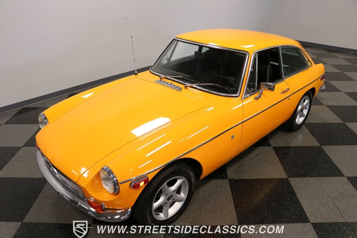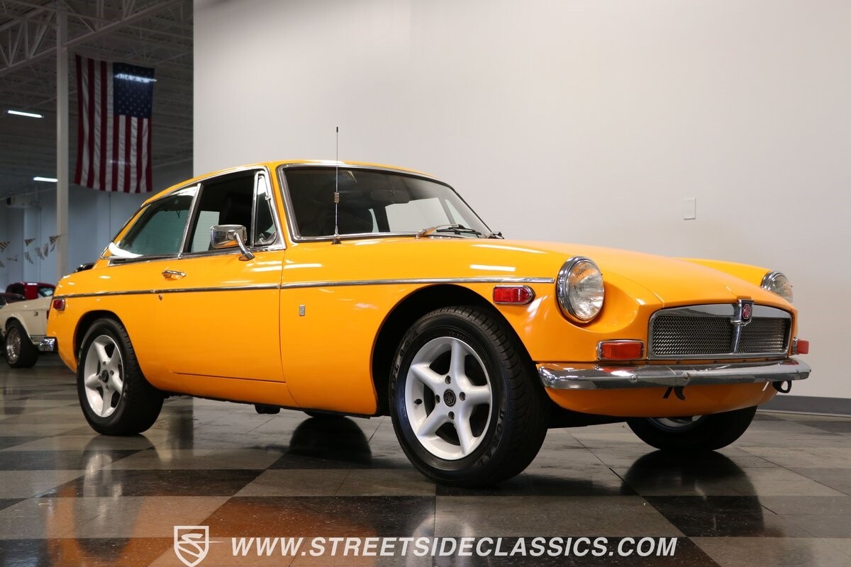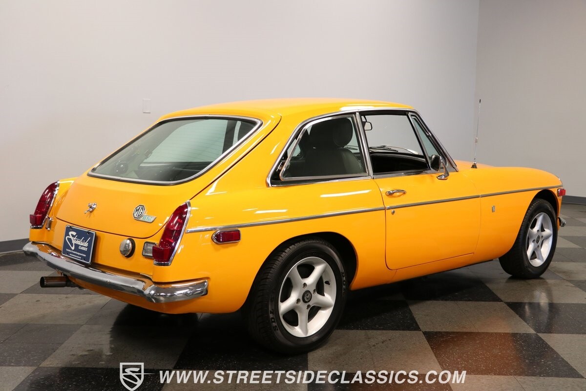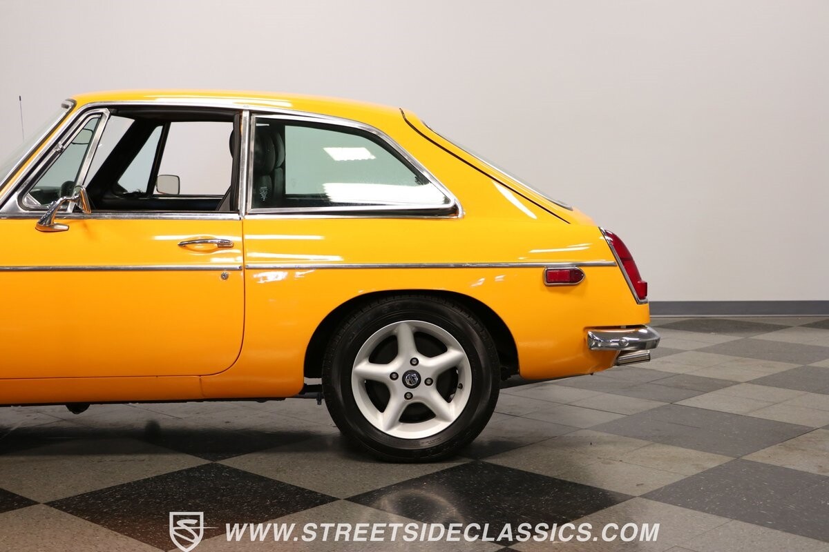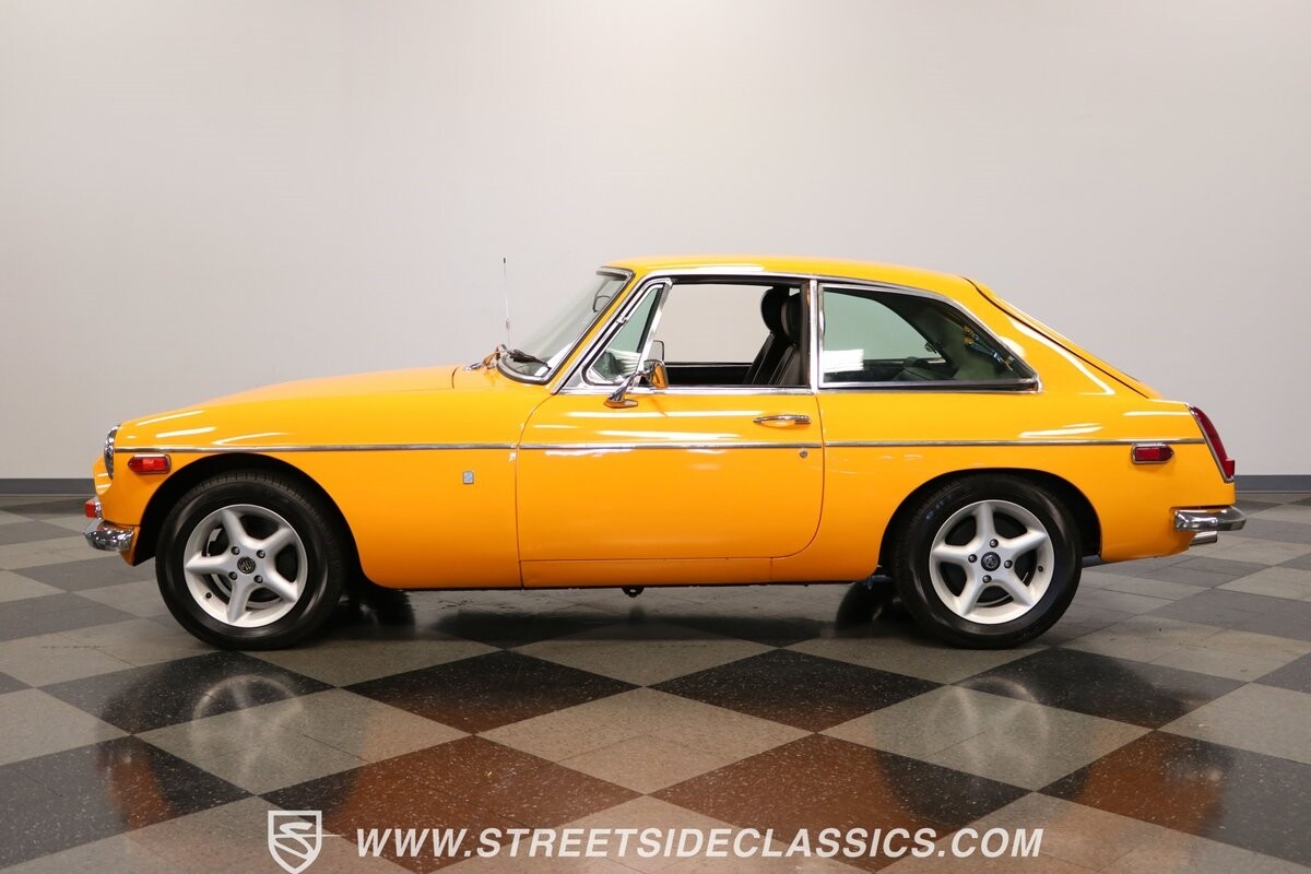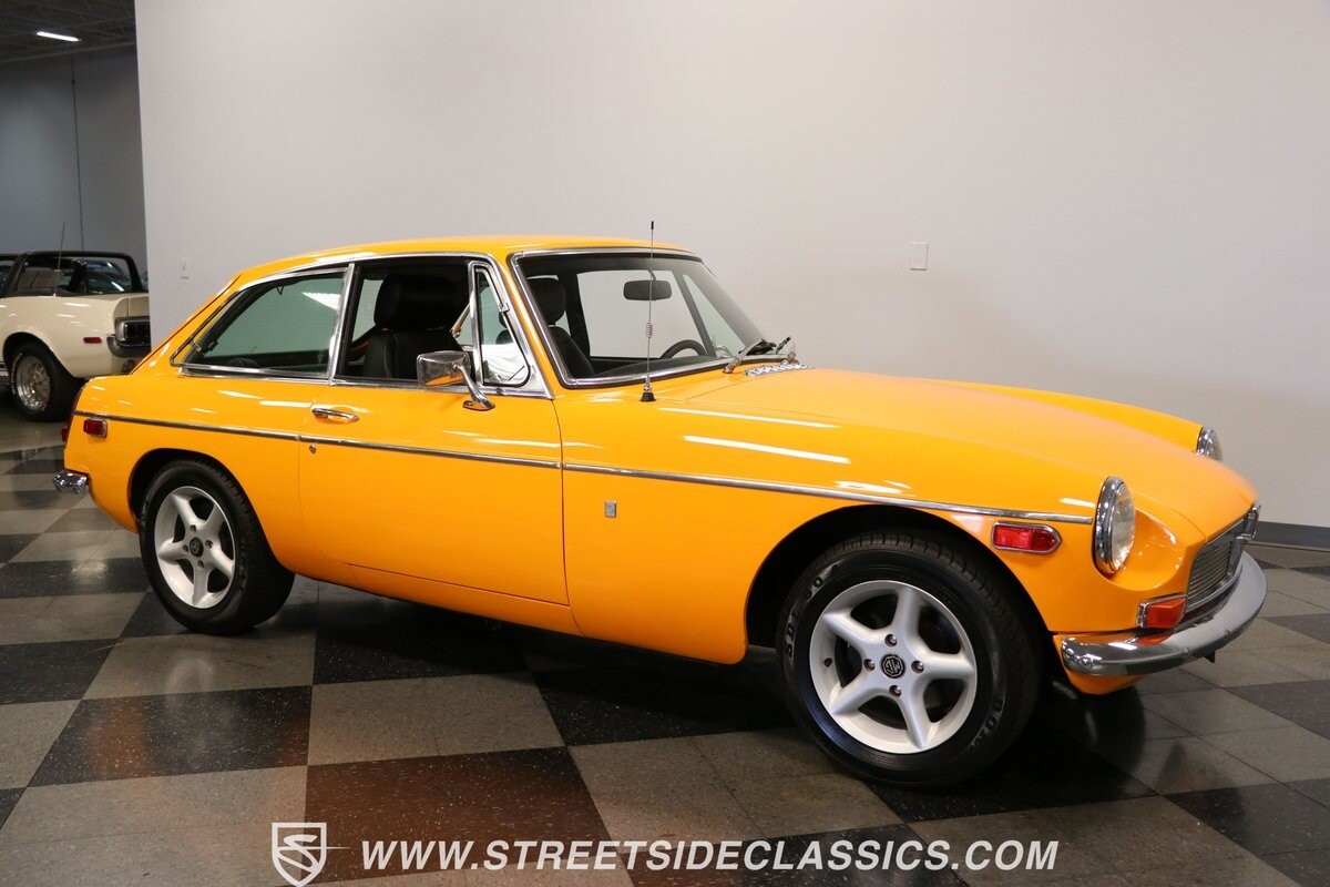 We love the shade of yellow/orange on this car because a vibrant color like this seems appropriate. After all, these hatchback coupes had a bit more flair than the roadsters, thanks to the Pininfarina restyle. But beyond this Italian update is the British style we all love. The sleek lines with just the right chrome give these earlier MGBs a confidently regal appearance like this one. The later cars trade in their chrome grille and chrome rear bumpers for black plastic units, so this one appreciates its history with well-maintained brightwork. This is a driver's car, so the finish is attractive but road-ready. And you can tell this is an overall quality car when you look at how well the panels line up and how the sweeping trim line runs unbroken over the whole profile. Plus, those upgraded alloys have the clean look of a car that wants to have fun on the road.