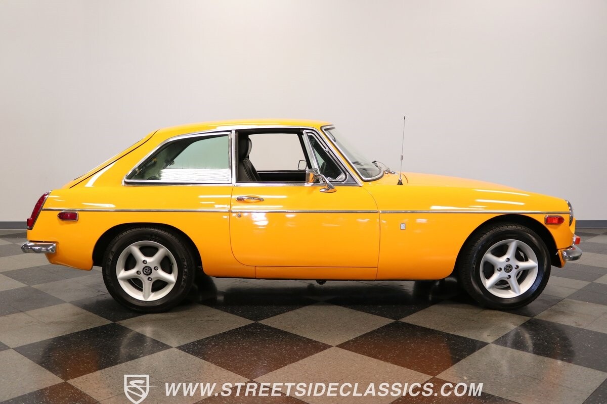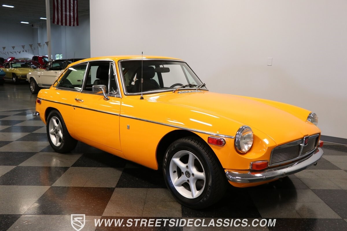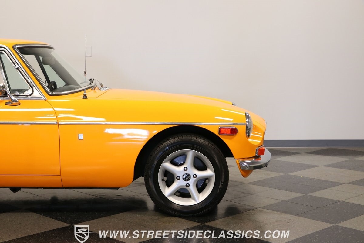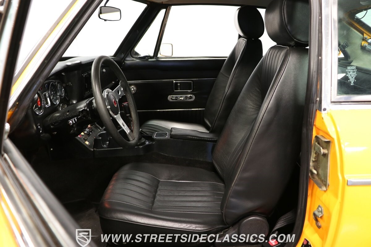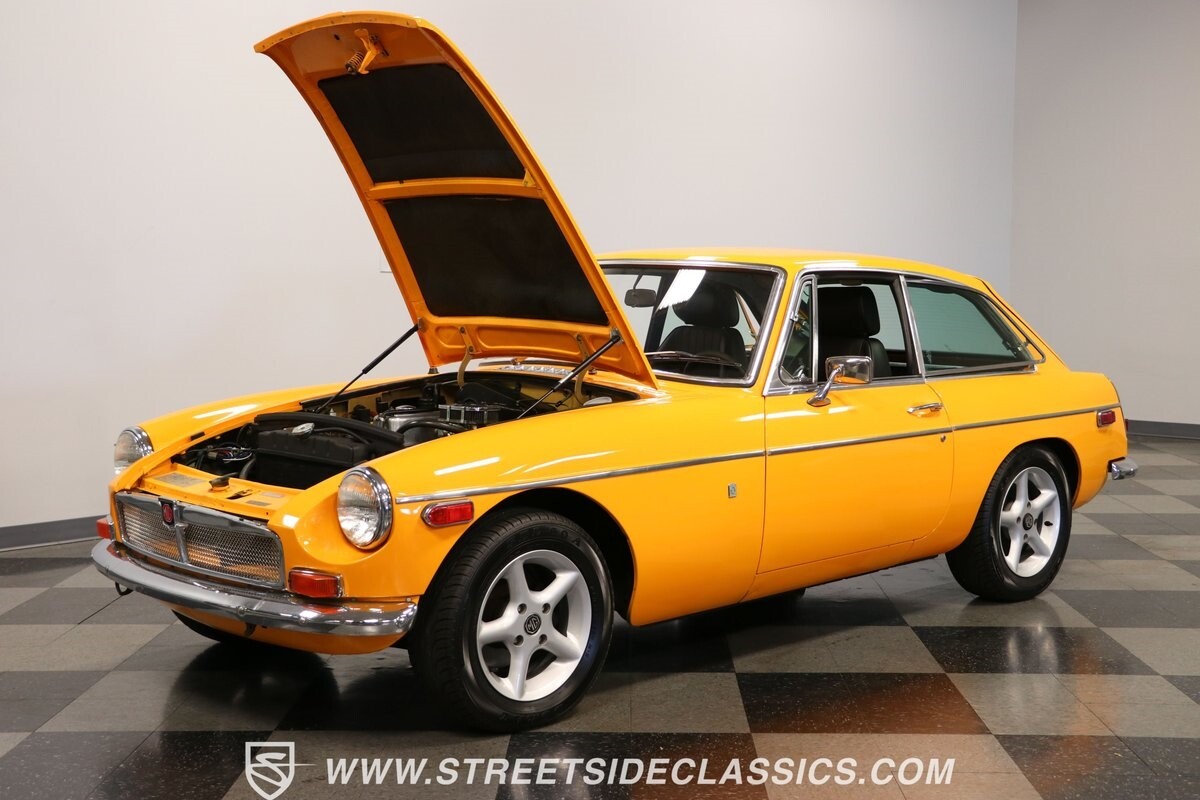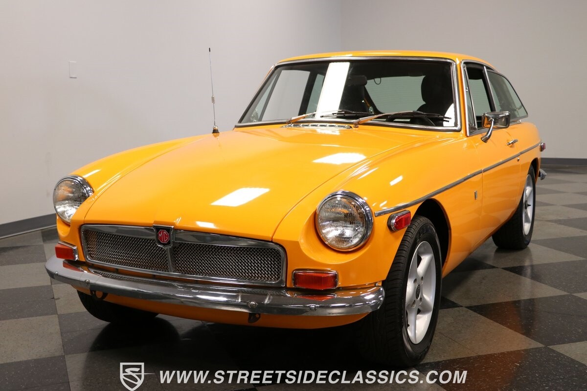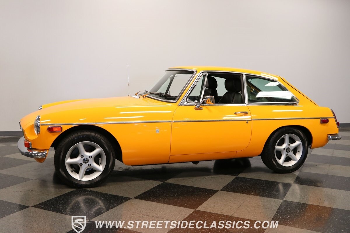We love the shade of yellow/orange on this car because a vibrant color like this seems appropriate. After all, these hatchback coupes had a bit more flair than the roadsters, thanks to the Pininfarina restyle. But beyond this Italian update is the British style we all love. The sleek lines with just the right chrome give these earlier MGBs a confidently regal appearance like this one. The later cars trade in their chrome grille and chrome rear bumpers for black plastic units, so this one appreciates its history with well-maintained brightwork. This is a driver's car, so the finish is attractive but road-ready. And you can tell this is an overall quality car when you look at how well the panels line up and how the sweeping trim line runs unbroken over the whole profile. Plus, those upgraded alloys have the clean look of a car that wants to have fun on the road.