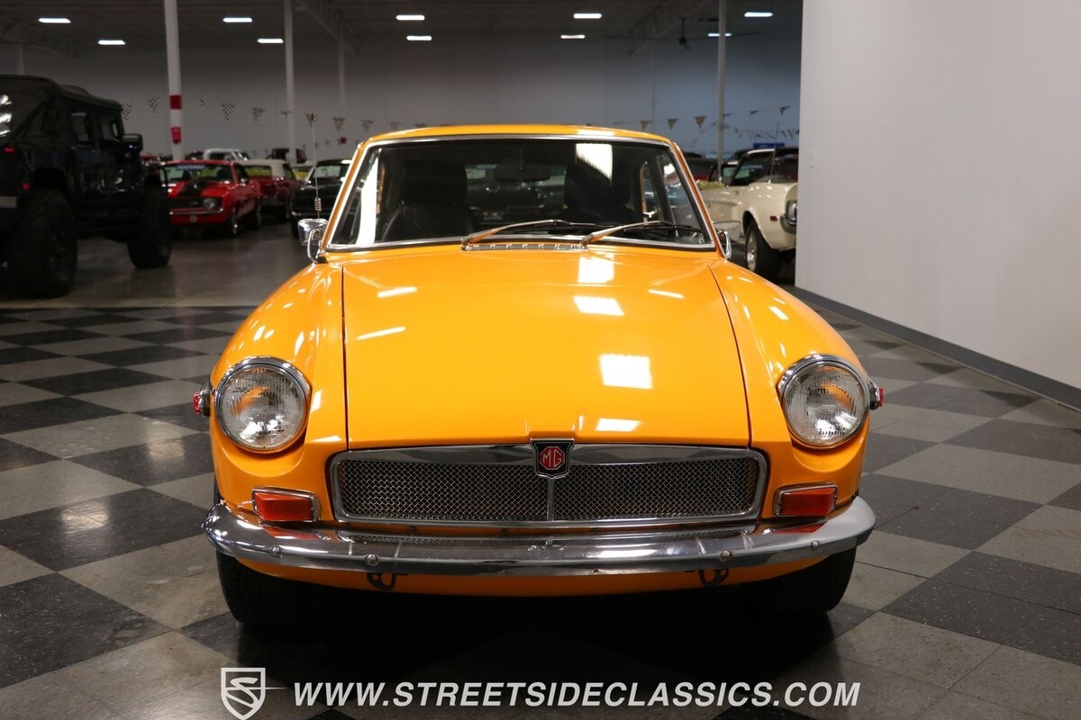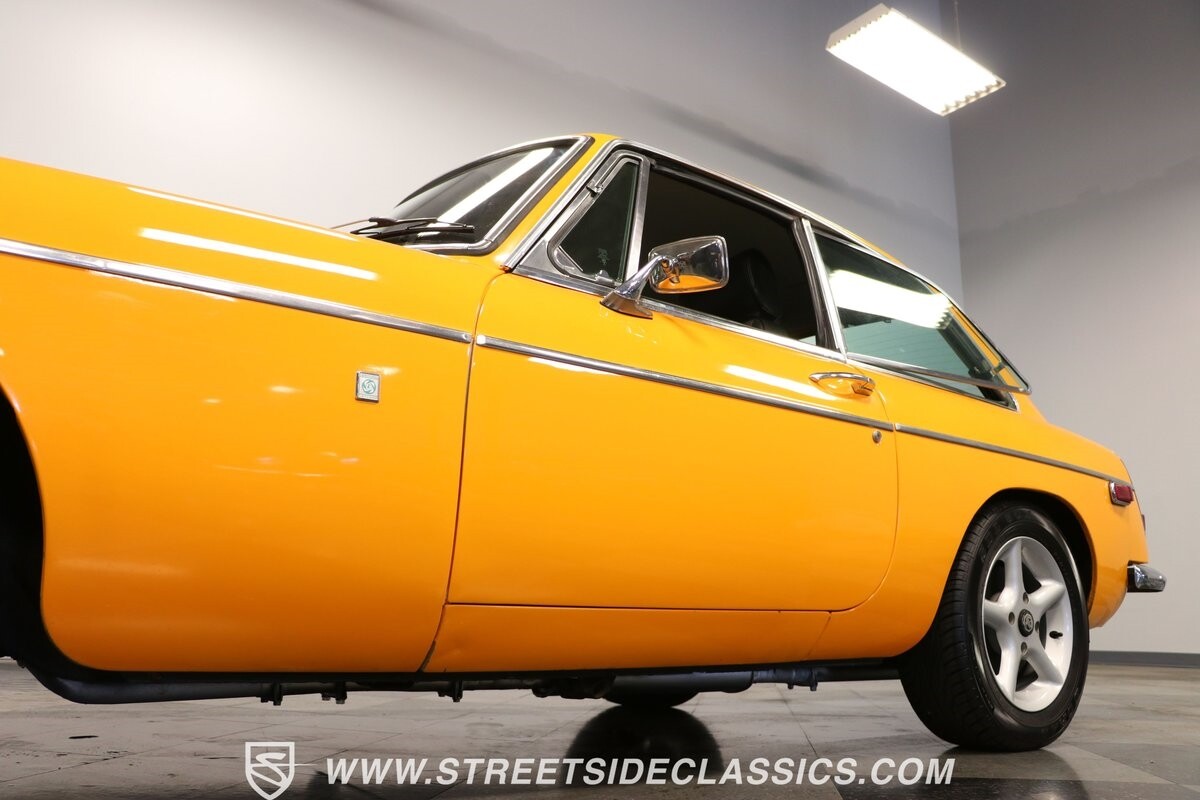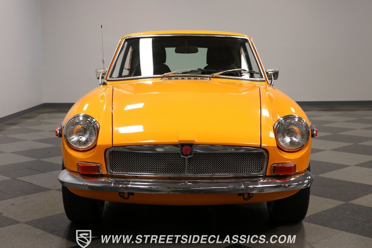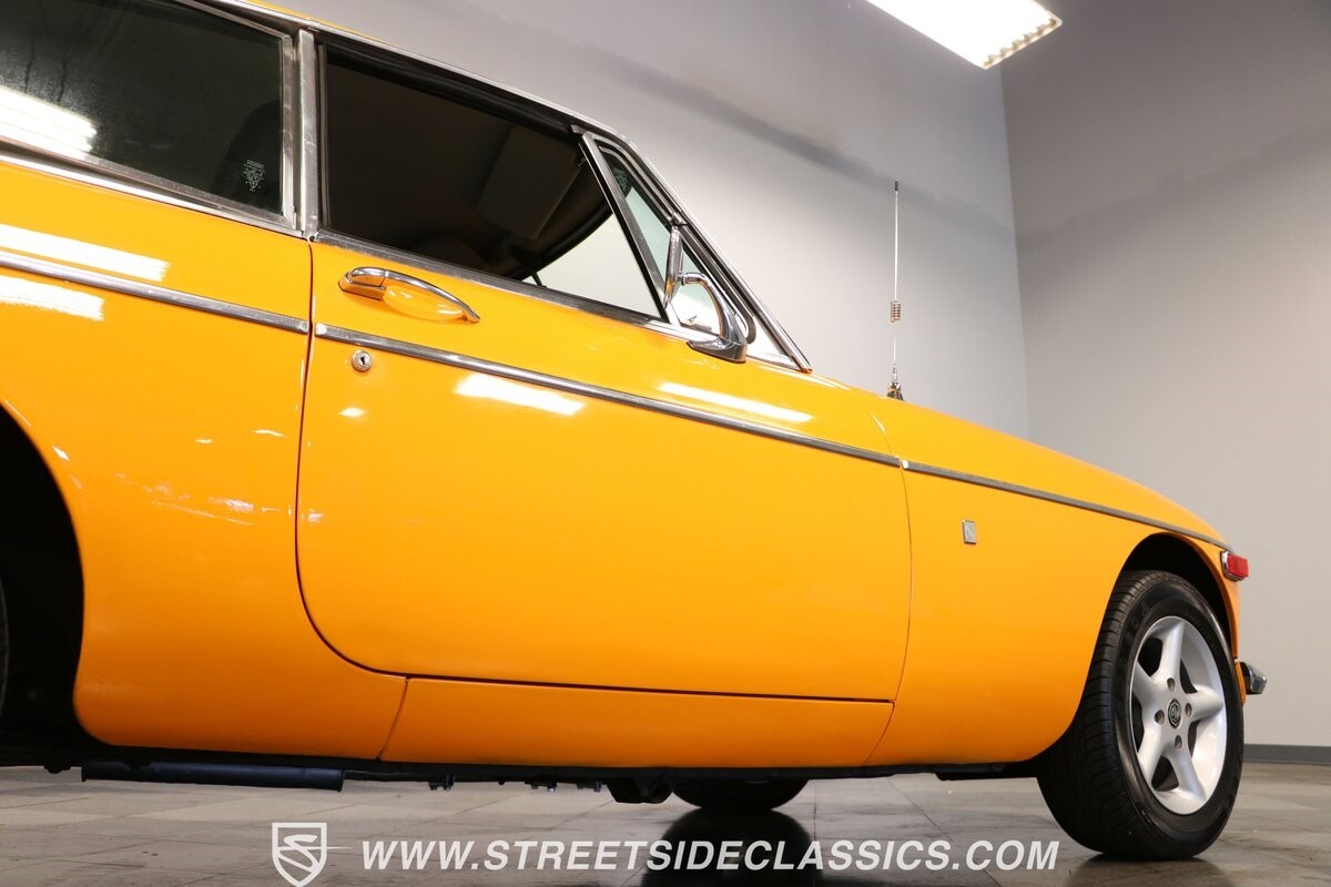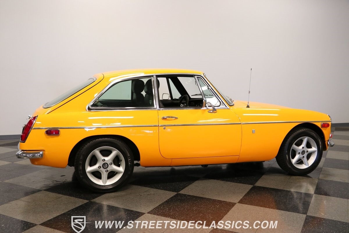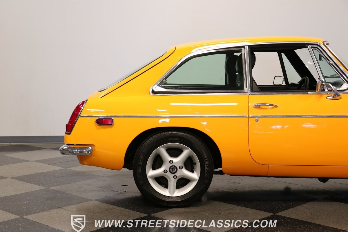 We love the shade of yellow/orange on this car because a vibrant color like this seems appropriate. After all, these hatchback coupes had a bit more flair than the roadsters, thanks to the Pininfarina restyle. But beyond this Italian update is the British style we all love. The sleek lines with just the right chrome give these earlier MGBs a confidently regal appearance like this one. The later cars trade in their chrome grille and chrome rear bumpers for black plastic units, so this one appreciates its history with well-maintained brightwork. This is a driver's car, so the finish is attractive but road-ready. And you can tell this is an overall quality car when you look at how well the panels line up and how the sweeping trim line runs unbroken over the whole profile. Plus, those upgraded alloys have the clean look of a car that wants to have fun on the road.