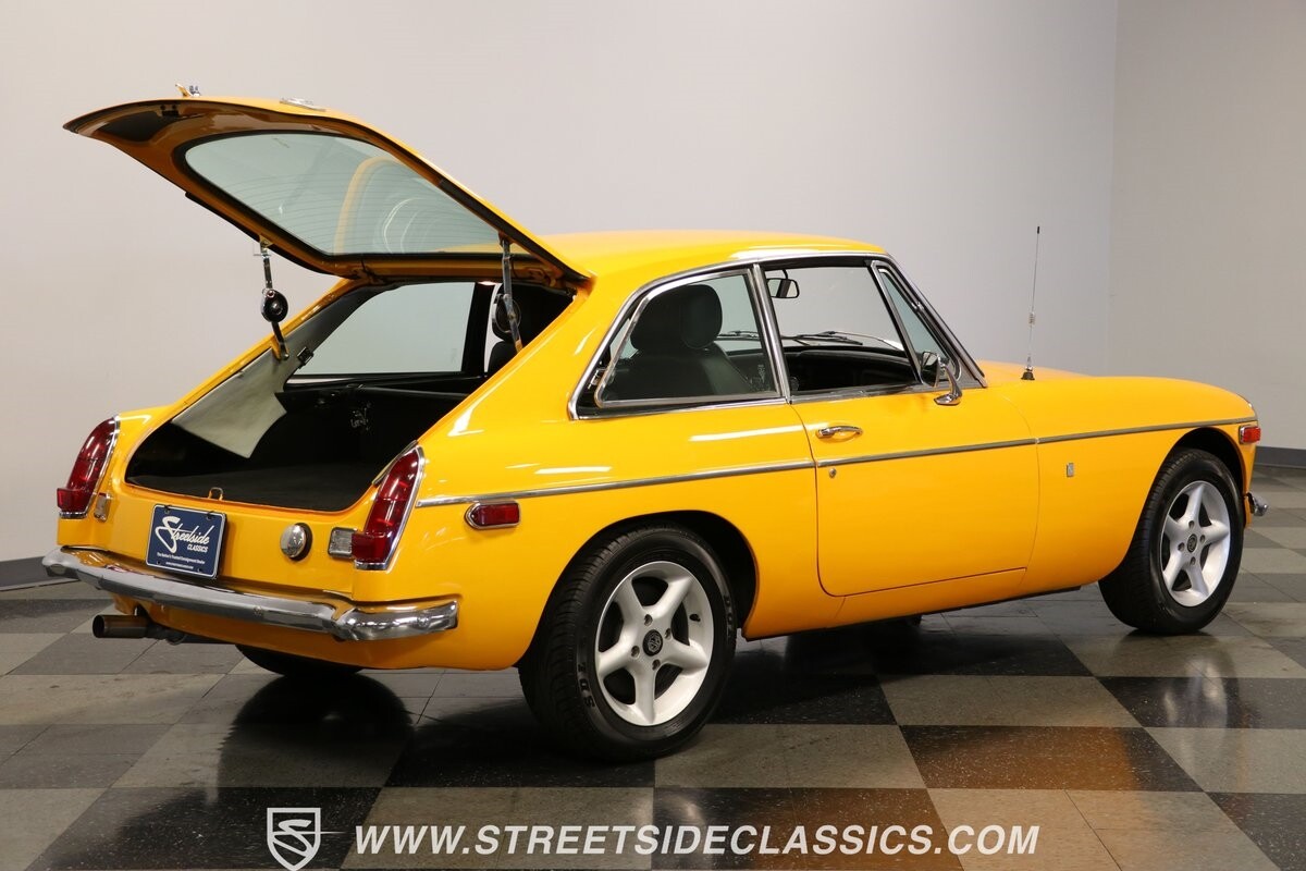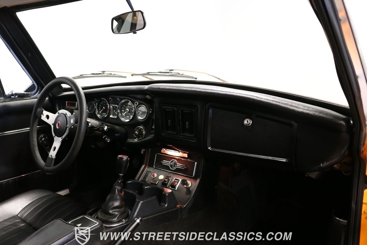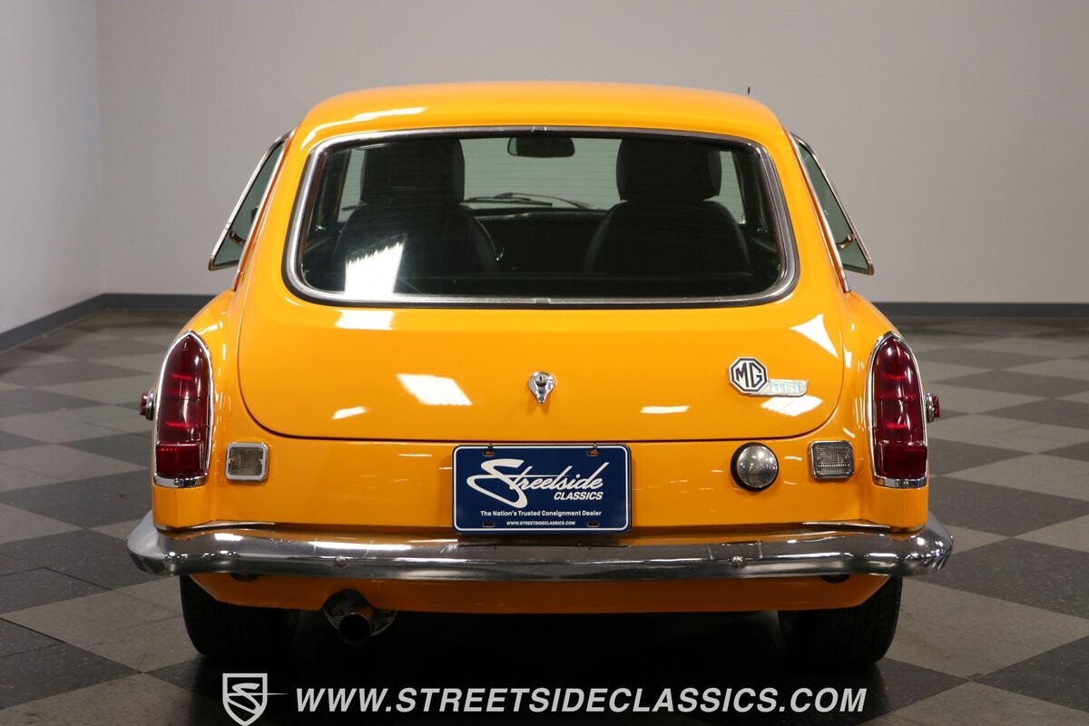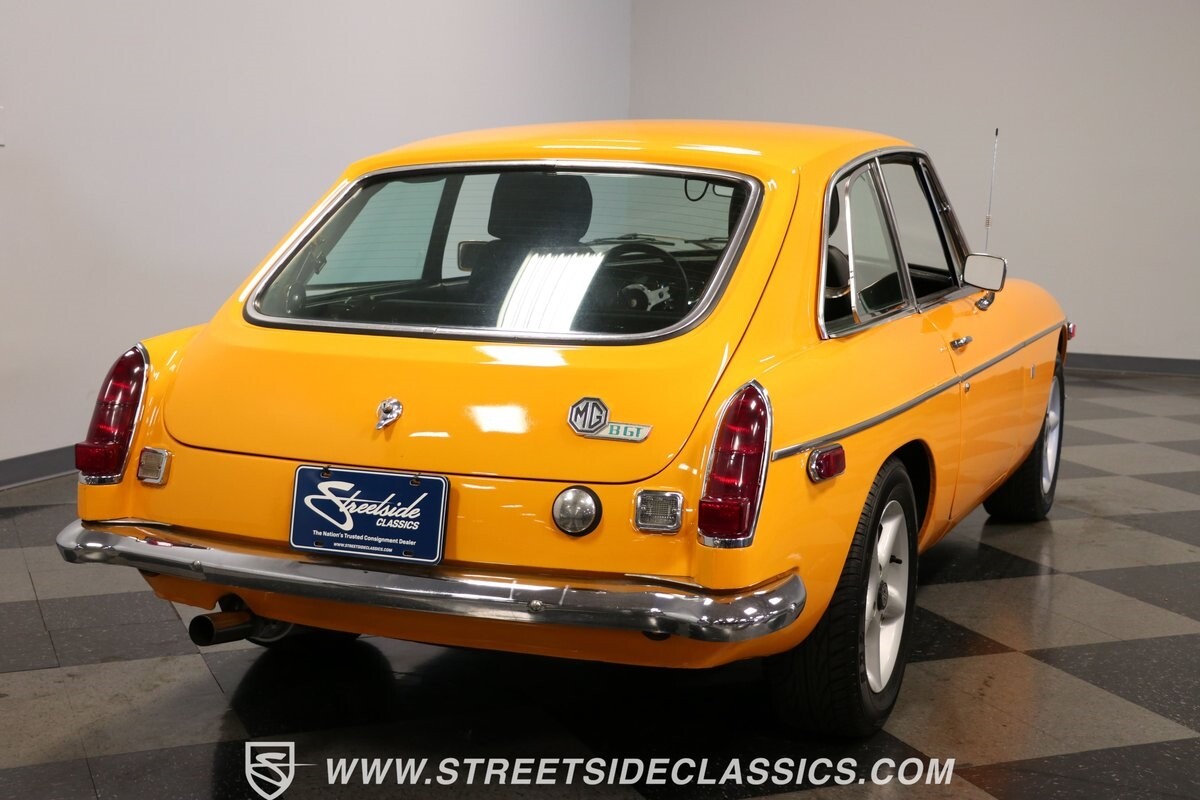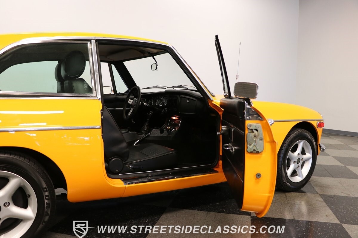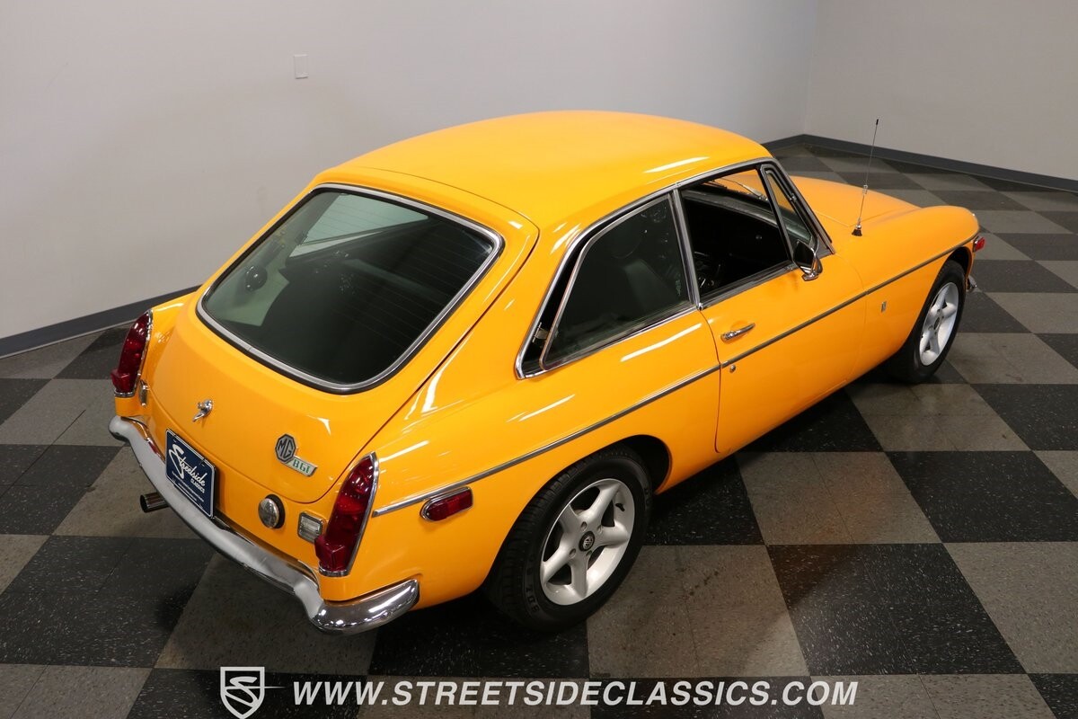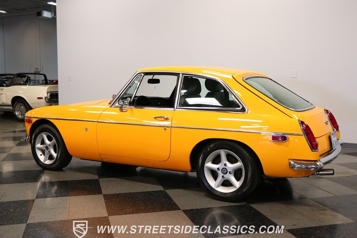 We love the shade of yellow/orange on this car because a vibrant color like this seems appropriate. After all, these hatchback coupes had a bit more flair than the roadsters, thanks to the Pininfarina restyle. But beyond this Italian update is the British style we all love. The sleek lines with just the right chrome give these earlier MGBs a confidently regal appearance like this one. The later cars trade in their chrome grille and chrome rear bumpers for black plastic units, so this one appreciates its history with well-maintained brightwork. This is a driver's car, so the finish is attractive but road-ready. And you can tell this is an overall quality car when you look at how well the panels line up and how the sweeping trim line runs unbroken over the whole profile. Plus, those upgraded alloys have the clean look of a car that wants to have fun on the road.