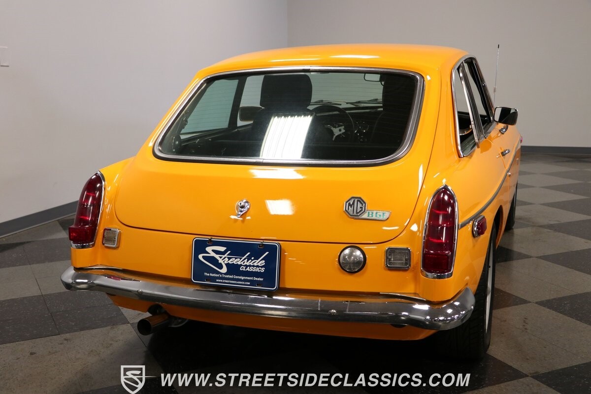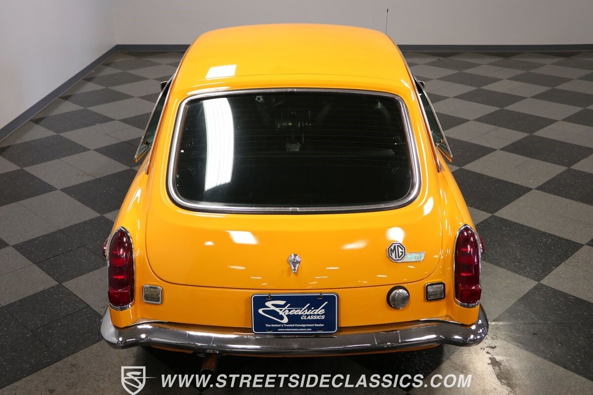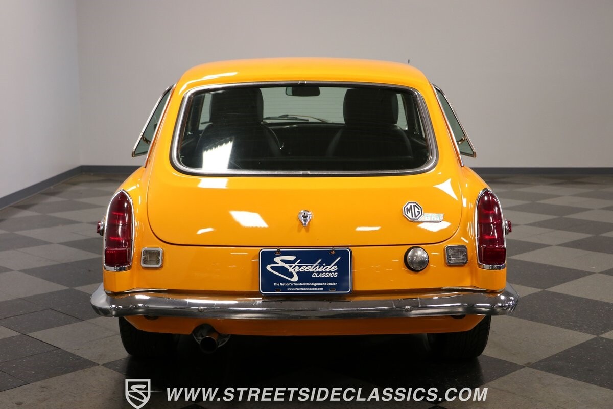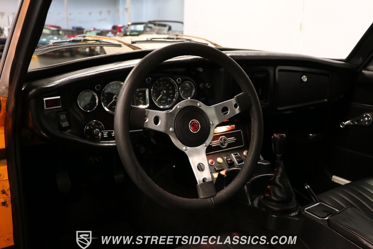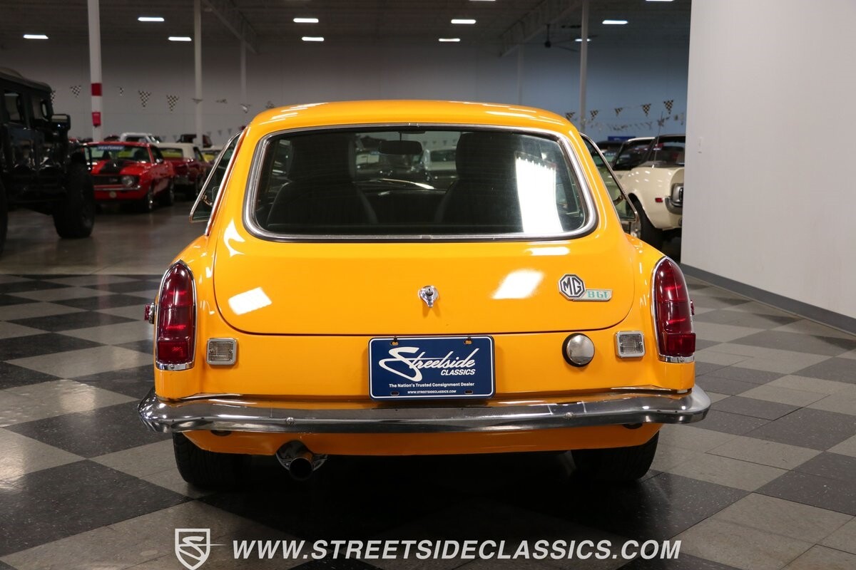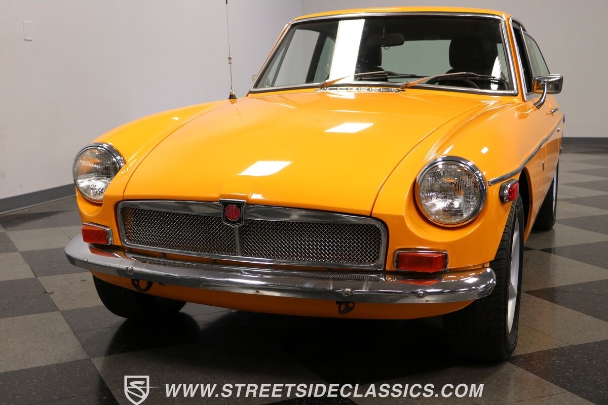 We love the shade of yellow/orange on this car because a vibrant color like this seems appropriate. After all, these hatchback coupes had a bit more flair than the roadsters, thanks to the Pininfarina restyle. But beyond this Italian update is the British style we all love. The sleek lines with just the right chrome give these earlier MGBs a confidently regal appearance like this one. The later cars trade in their chrome grille and chrome rear bumpers for black plastic units, so this one appreciates its history with well-maintained brightwork. This is a driver's car, so the finish is attractive but road-ready. And you can tell this is an overall quality car when you look at how well the panels line up and how the sweeping trim line runs unbroken over the whole profile. Plus, those upgraded alloys have the clean look of a car that wants to have fun on the road.