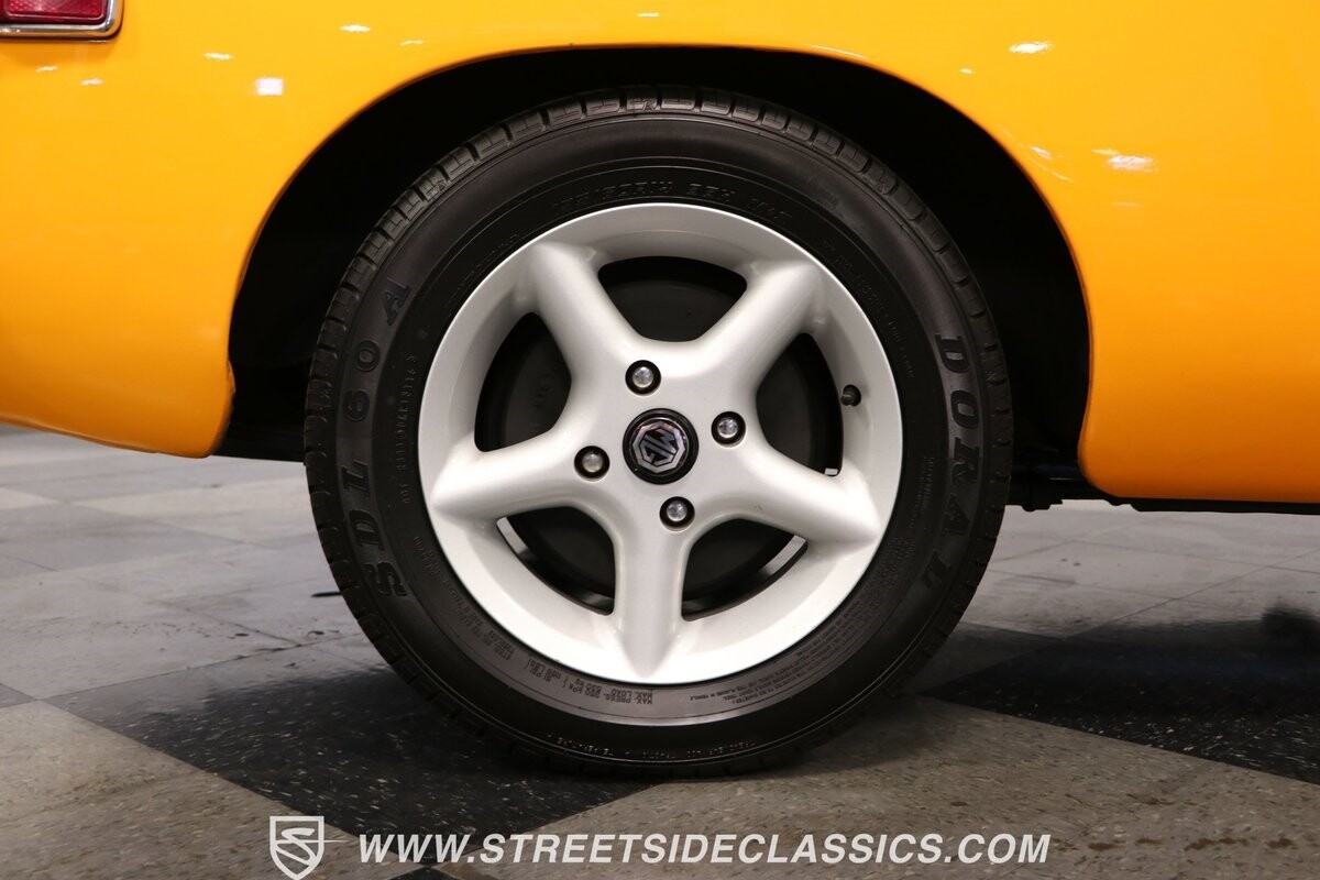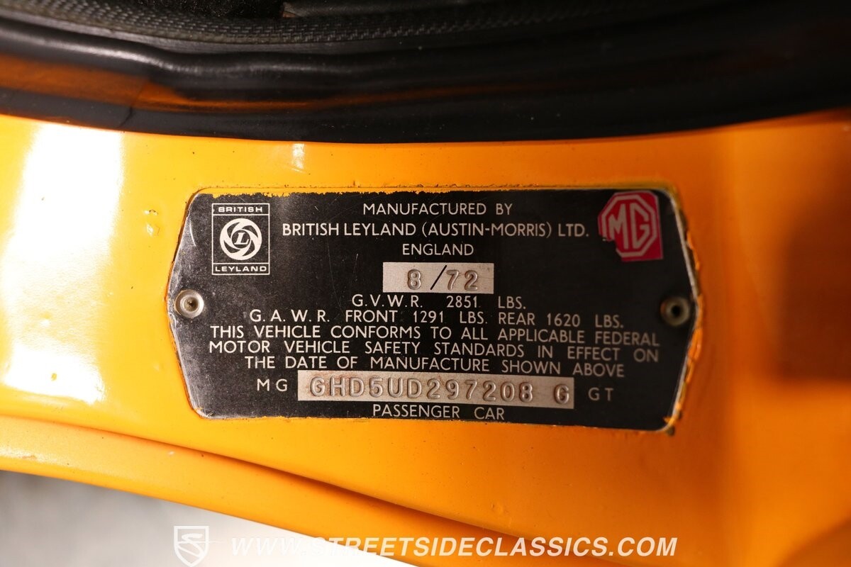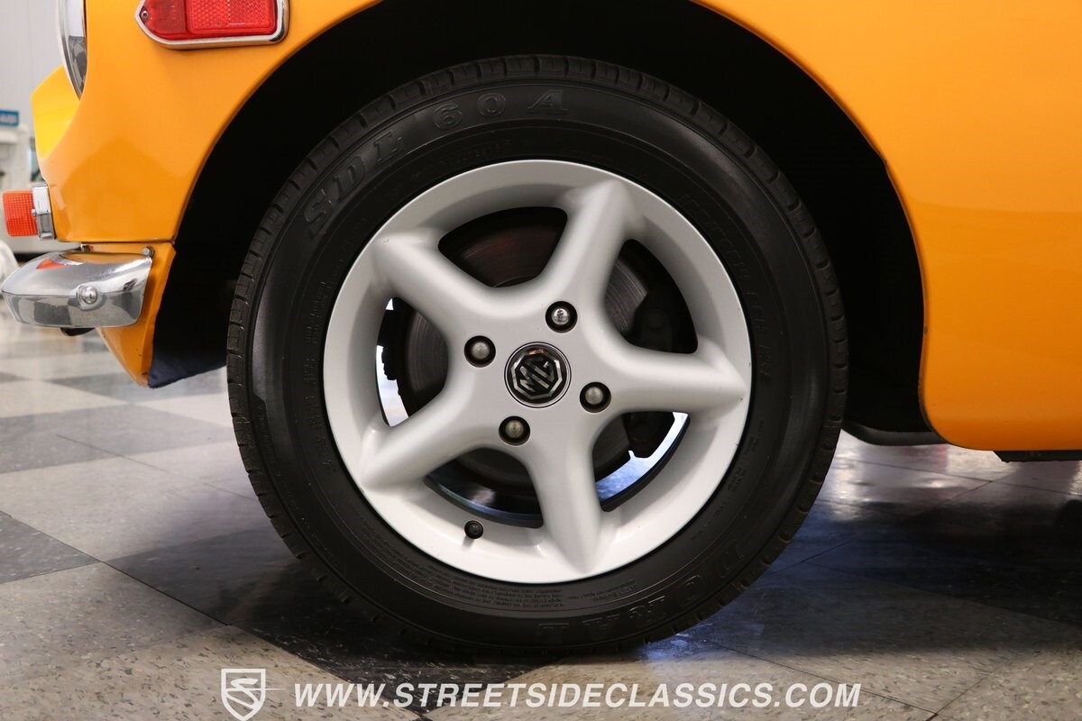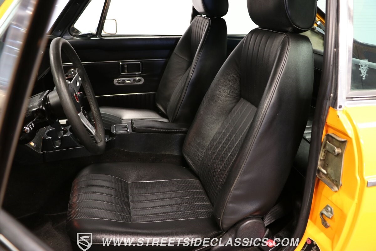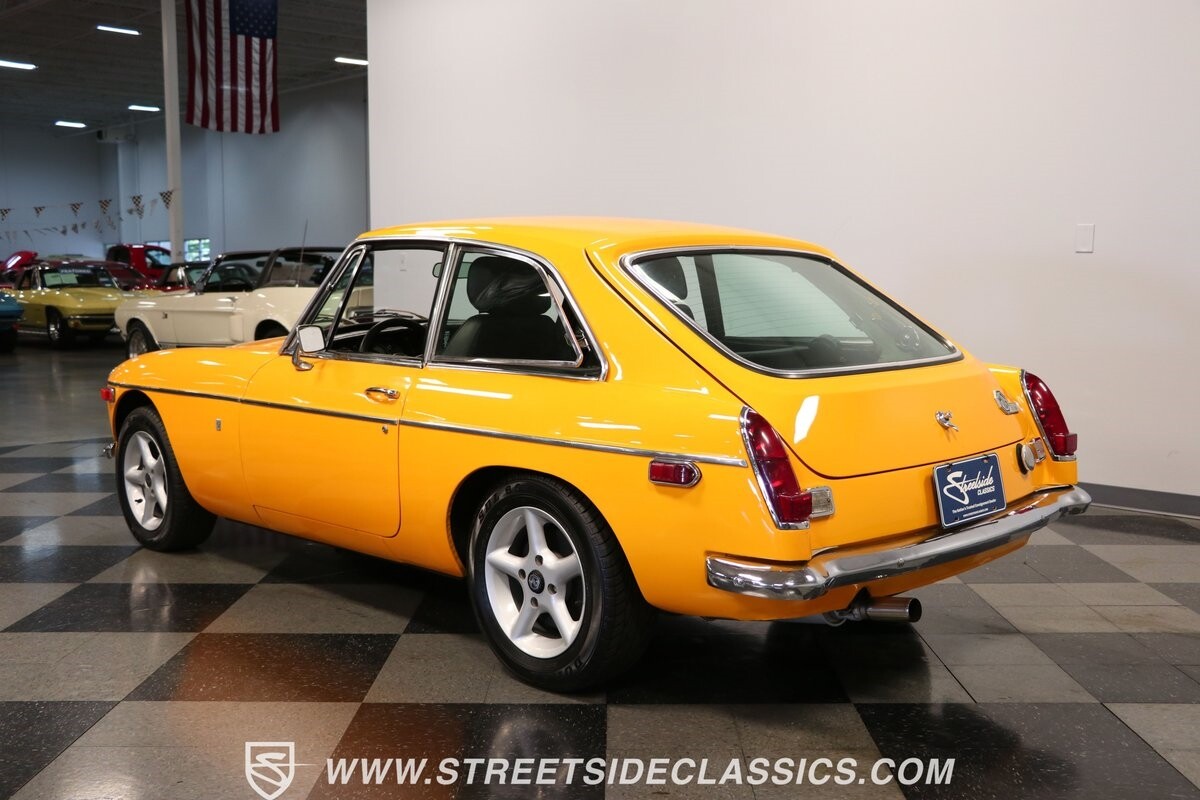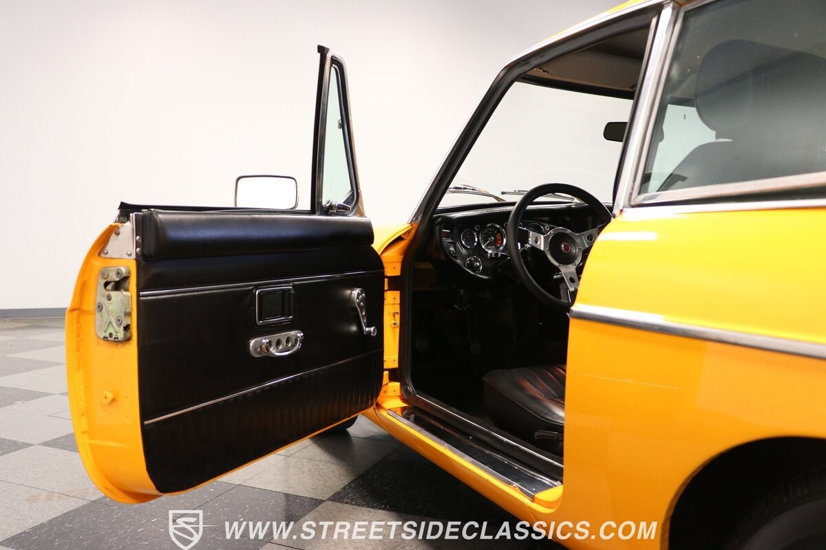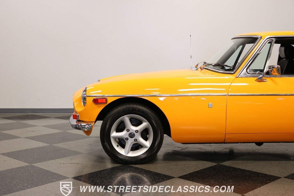 We love the shade of yellow/orange on this car because a vibrant color like this seems appropriate. After all, these hatchback coupes had a bit more flair than the roadsters, thanks to the Pininfarina restyle. But beyond this Italian update is the British style we all love. The sleek lines with just the right chrome give these earlier MGBs a confidently regal appearance like this one. The later cars trade in their chrome grille and chrome rear bumpers for black plastic units, so this one appreciates its history with well-maintained brightwork. This is a driver's car, so the finish is attractive but road-ready. And you can tell this is an overall quality car when you look at how well the panels line up and how the sweeping trim line runs unbroken over the whole profile. Plus, those upgraded alloys have the clean look of a car that wants to have fun on the road.