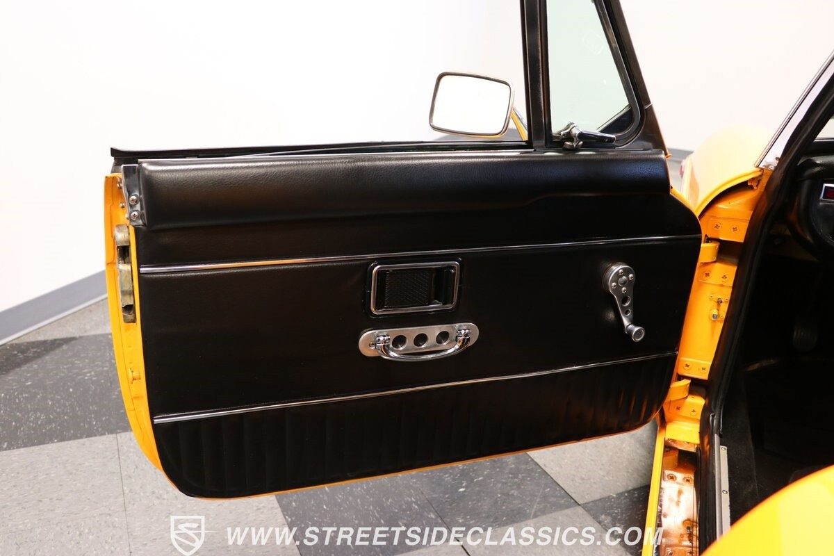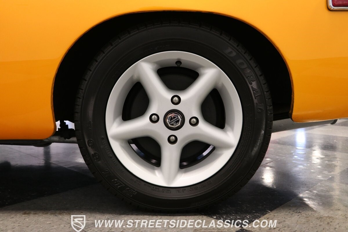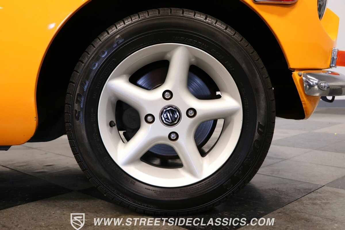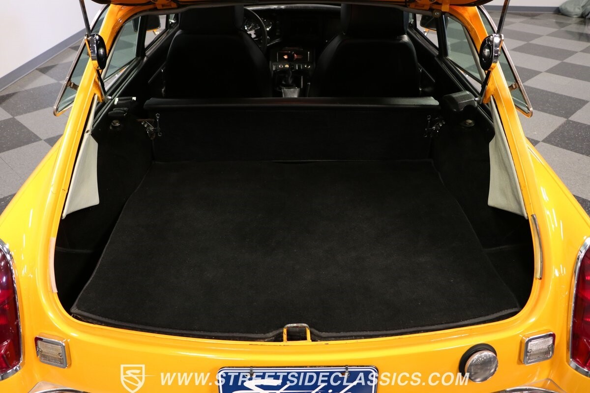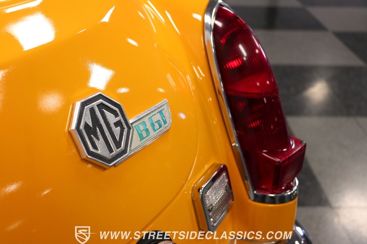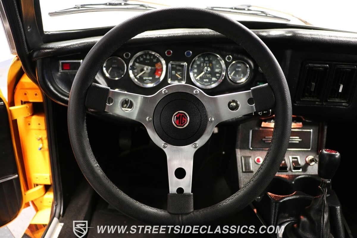 We love the shade of yellow/orange on this car because a vibrant color like this seems appropriate. After all, these hatchback coupes had a bit more flair than the roadsters, thanks to the Pininfarina restyle. But beyond this Italian update is the British style we all love. The sleek lines with just the right chrome give these earlier MGBs a confidently regal appearance like this one. The later cars trade in their chrome grille and chrome rear bumpers for black plastic units, so this one appreciates its history with well-maintained brightwork. This is a driver's car, so the finish is attractive but road-ready. And you can tell this is an overall quality car when you look at how well the panels line up and how the sweeping trim line runs unbroken over the whole profile. Plus, those upgraded alloys have the clean look of a car that wants to have fun on the road.
