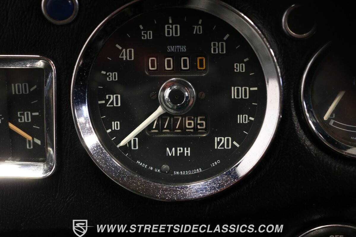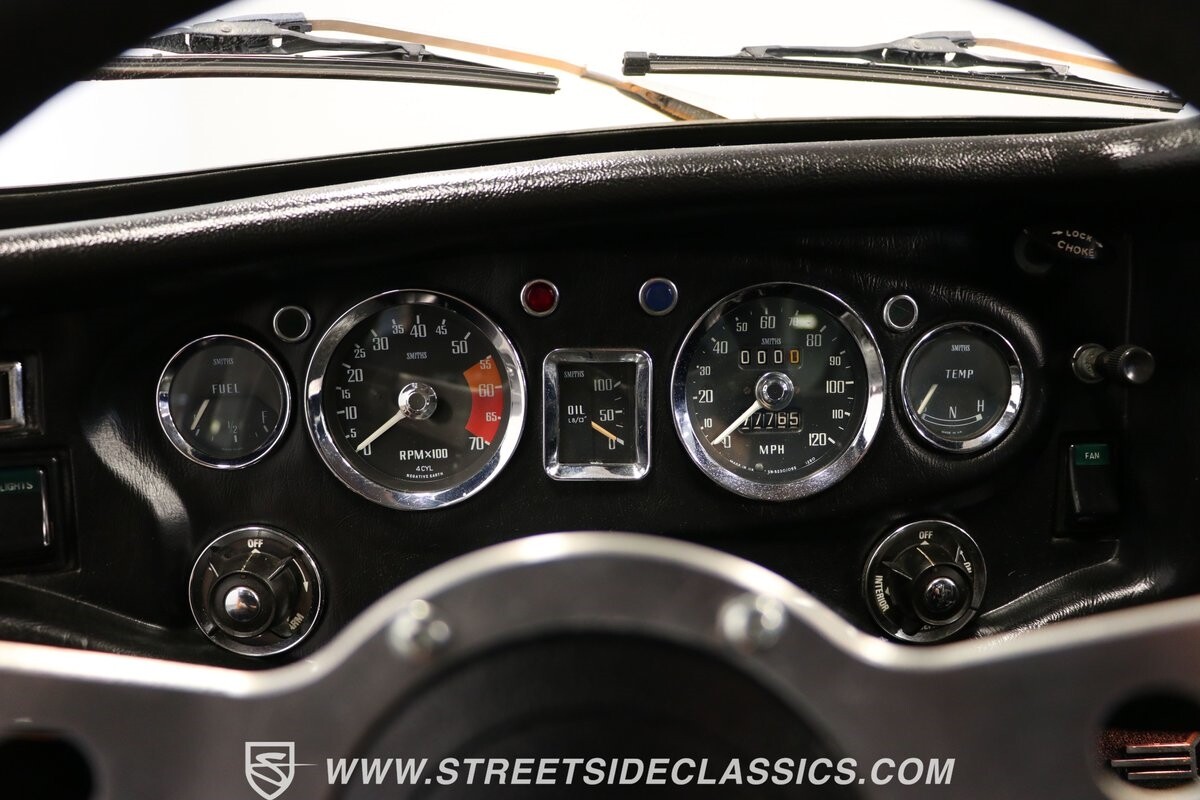 The black interior has a clean and complete style that's quite inviting. Even the dash light still greets you when the door opens. Those familiar with the roadster will feel at home hopping into the GT. The entire inside envelops the driver like a second skin. The space between the three-spoke wheel and the shifter is exceptionally close for comfortable and quick performance. And they are both finished in wood for that ideal vintage feel. The driver gets a set of Smiths gauges, including a handy tach. The black vinyl bucket seats look especially nice, and what makes the GT distinctive is behind these. There is a rear seat for a true 2+2 experience, and the hatchback gives you genuine luggage space and versatility that the roadster never could. So while the interior is too nice for us to suggest you make Home Deport runs, we know you're considering packing a bit more into your weekend getaways.