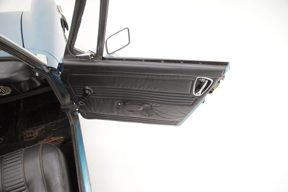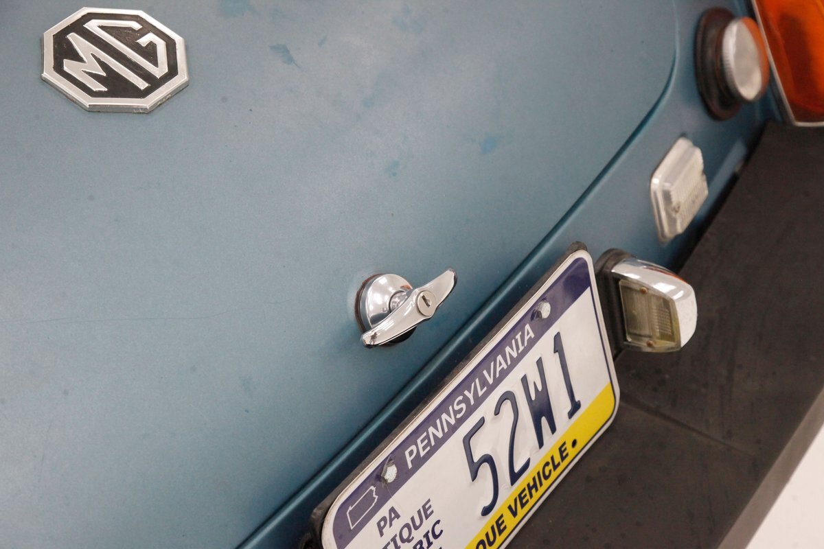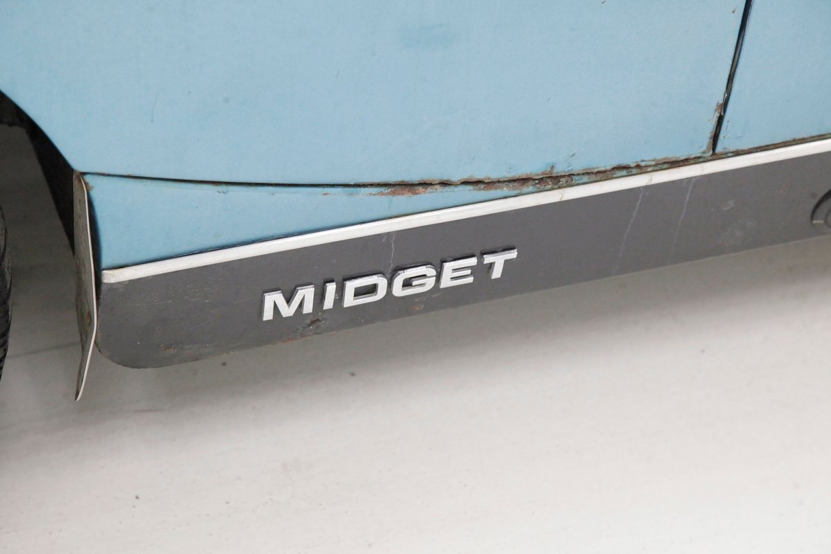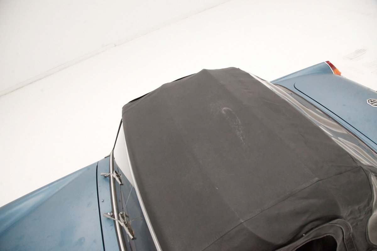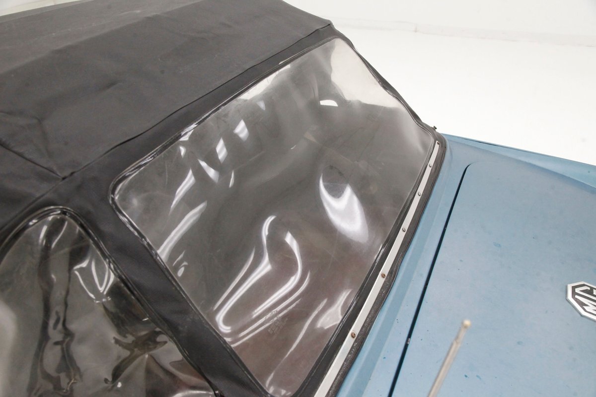 Nice straight steel panels with decently minded gaps are bolted on to a miniature frame, and adorned "Sabrina" rubber crash bumpers and chrome bezels for your visual enjoyment. Faded teal paint is on to these panels giving an unrestored but alluring finish to the body. Rust, some surface and some on the invasive end of the spectrum is seen and a black rocker painting adds nice contrast to the teal and goes with the black convertible top. This top is showing some age with a few notable tears and shows light hazing and yellowing for the plastic windows. A simple mouthlike opening is in the front of the large rubber bumper with a centered octagonal MG badge. Sparse but effective trimmings for the side mirrors, window surrounds, rocker trim, and door handles show nicely. On the back is another "Sabrina" mandated crash rear bumper, and large vertical taillights on either corner. Another octagonal MG badge seen on the boot lid. Sporty mag style silver highlighted wheels are on all 4 corners, and all have a black background.