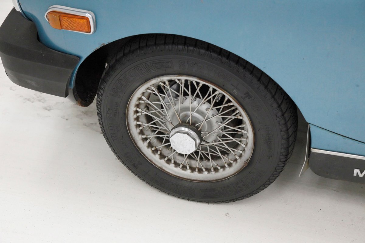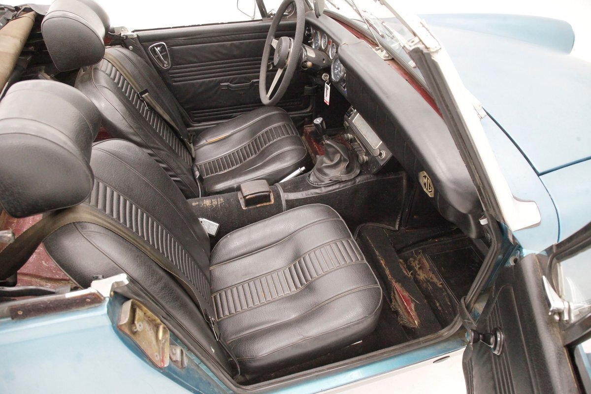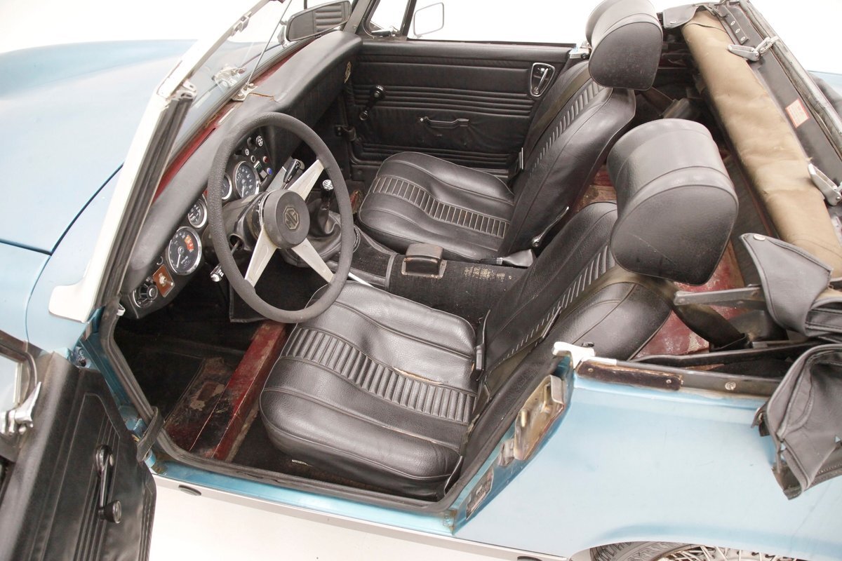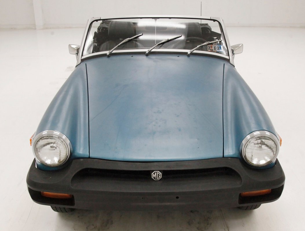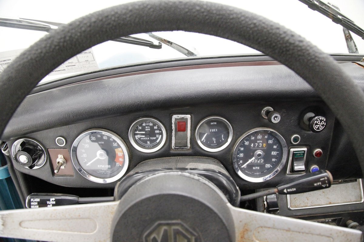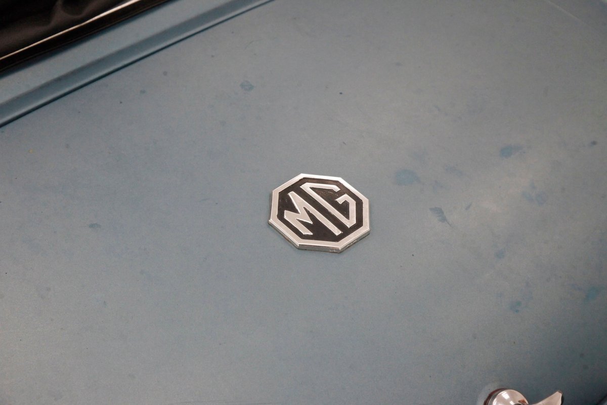 Nice straight steel panels with decently minded gaps are bolted on to a miniature frame, and adorned "Sabrina" rubber crash bumpers and chrome bezels for your visual enjoyment. Faded teal paint is on to these panels giving an unrestored but alluring finish to the body. Rust, some surface and some on the invasive end of the spectrum is seen and a black rocker painting adds nice contrast to the teal and goes with the black convertible top. This top is showing some age with a few notable tears and shows light hazing and yellowing for the plastic windows. A simple mouthlike opening is in the front of the large rubber bumper with a centered octagonal MG badge. Sparse but effective trimmings for the side mirrors, window surrounds, rocker trim, and door handles show nicely. On the back is another "Sabrina" mandated crash rear bumper, and large vertical taillights on either corner. Another octagonal MG badge seen on the boot lid. Sporty mag style silver highlighted wheels are on all 4 corners, and all have a black background.
