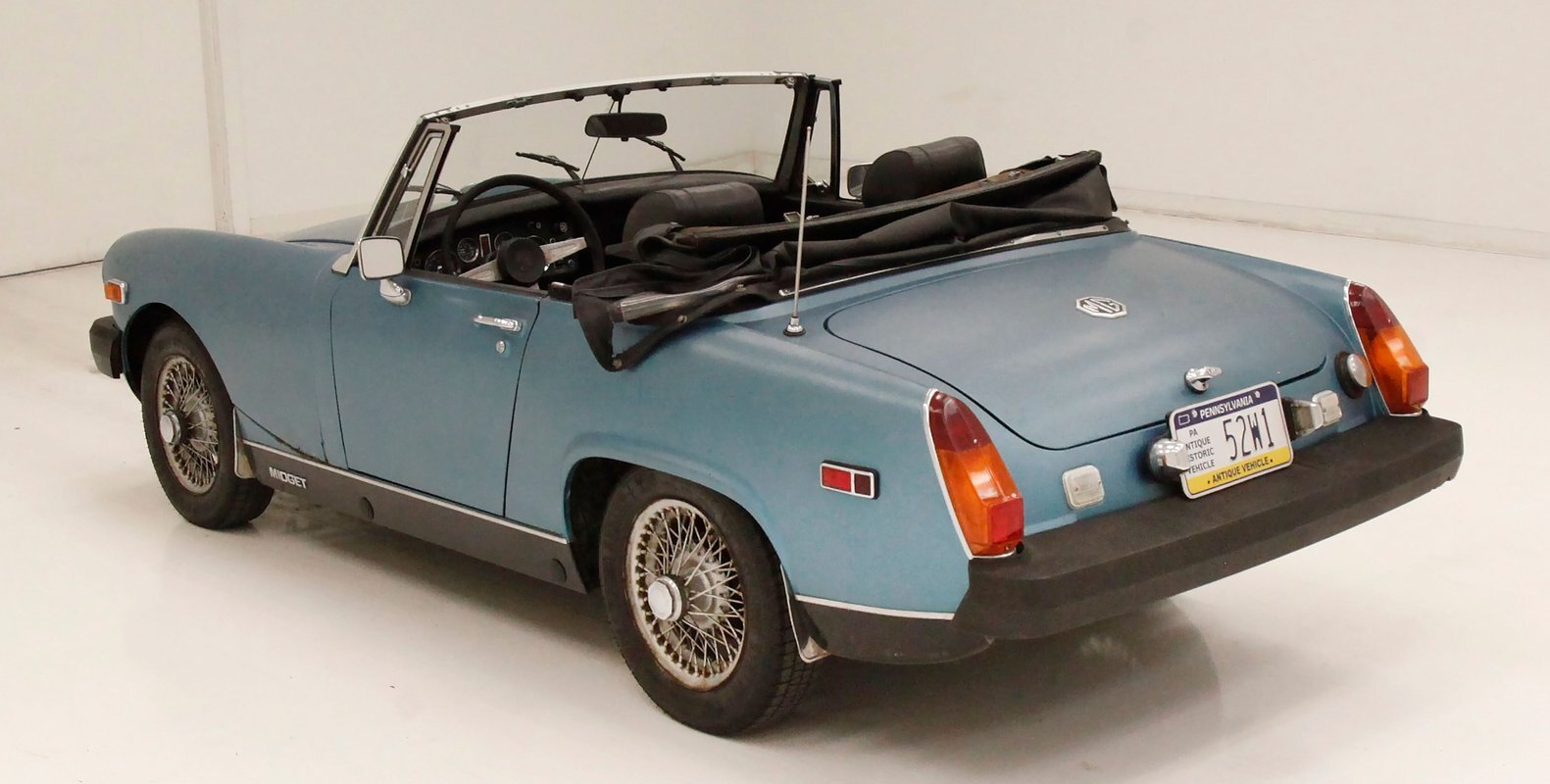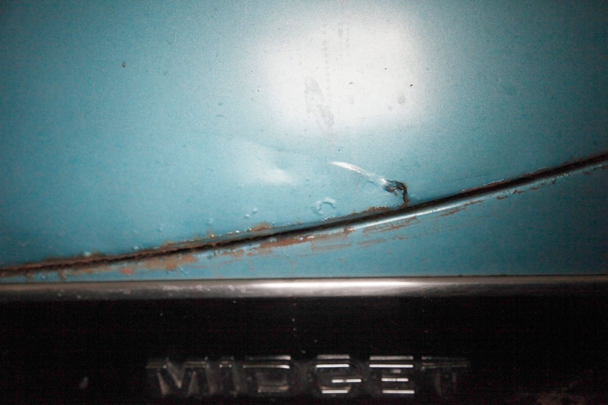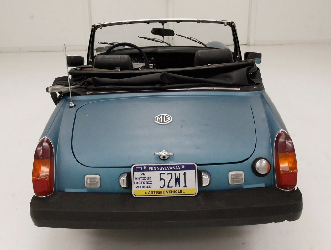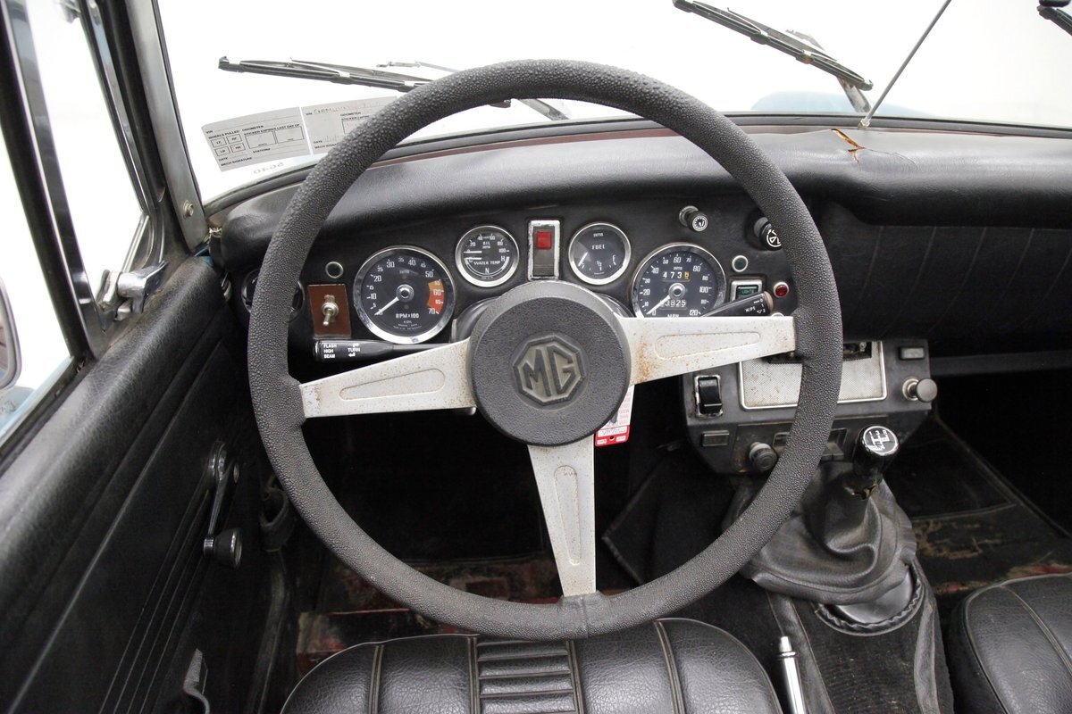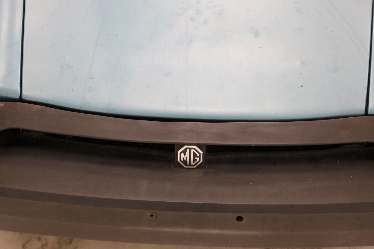 Nice straight steel panels with decently minded gaps are bolted on to a miniature frame, and adorned "Sabrina" rubber crash bumpers and chrome bezels for your visual enjoyment. Faded teal paint is on to these panels giving an unrestored but alluring finish to the body. Rust, some surface and some on the invasive end of the spectrum is seen and a black rocker painting adds nice contrast to the teal and goes with the black convertible top. This top is showing some age with a few notable tears and shows light hazing and yellowing for the plastic windows. A simple mouthlike opening is in the front of the large rubber bumper with a centered octagonal MG badge. Sparse but effective trimmings for the side mirrors, window surrounds, rocker trim, and door handles show nicely. On the back is another "Sabrina" mandated crash rear bumper, and large vertical taillights on either corner. Another octagonal MG badge seen on the boot lid. Sporty mag style silver highlighted wheels are on all 4 corners, and all have a black background.