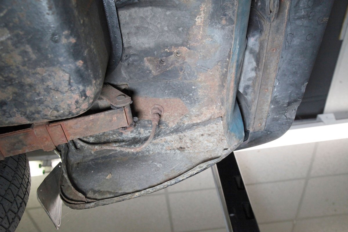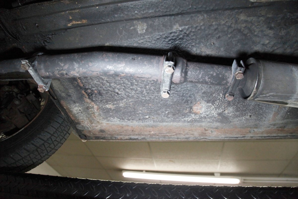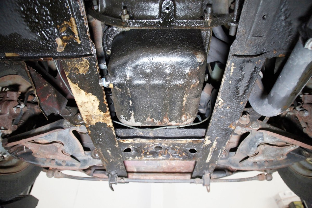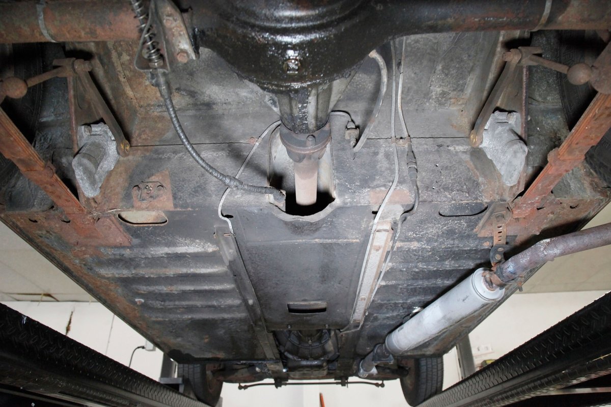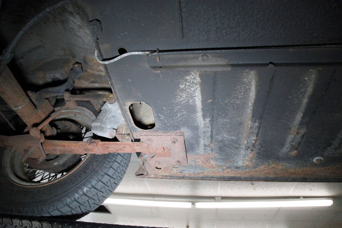 Underneath we note some surface rust, on suspension parts and the edges of the unibody where the floor pans and rockers meet. Front disc brakes are on with drums in the rear and the exhaust has a stock style muffler. Providing the sporty and surefooted ride is an independent coil spring front suspension that works with a leaf spring suspension in the rear and things are looking just cracking amid the patina finished undercarriage.