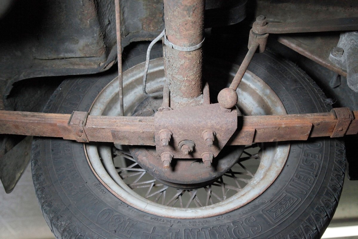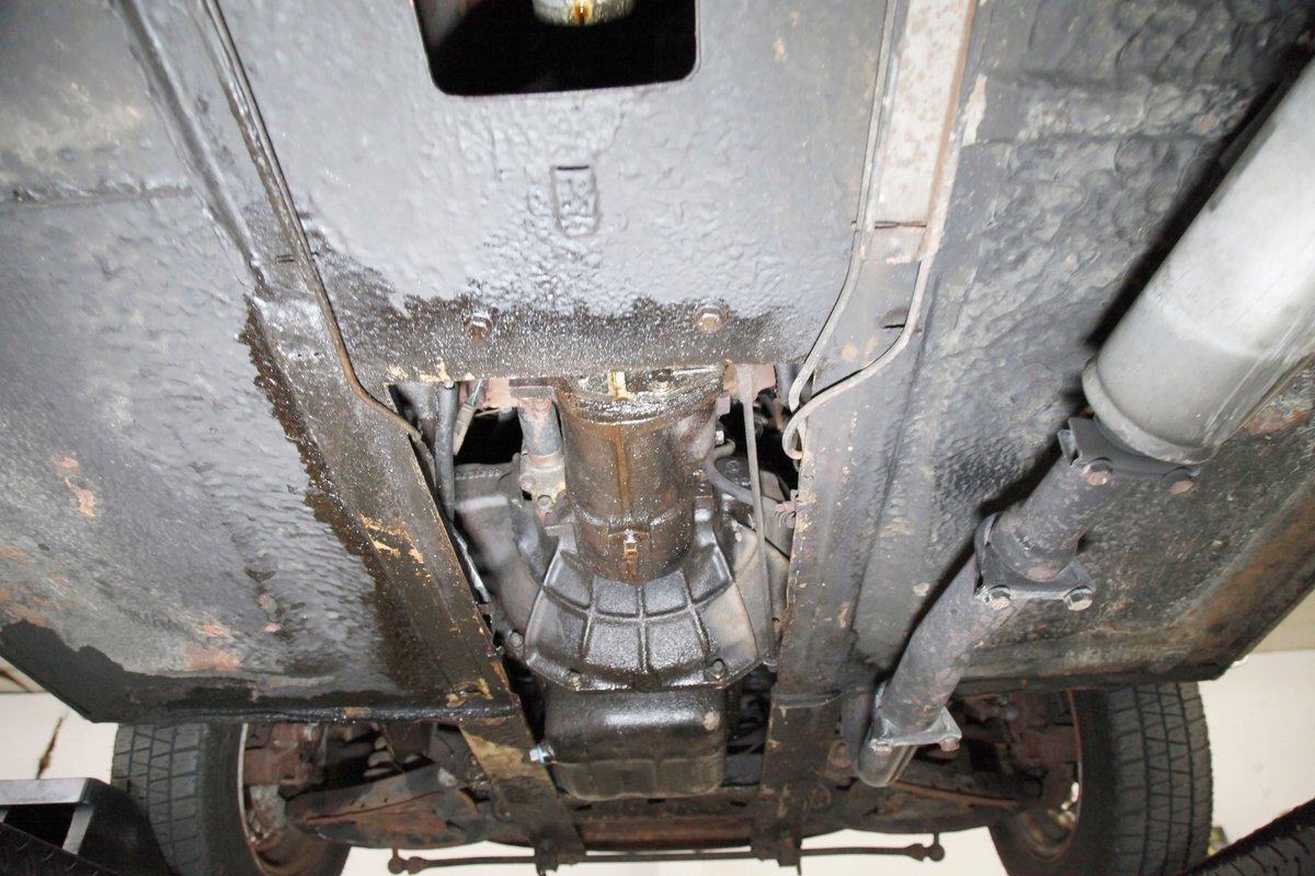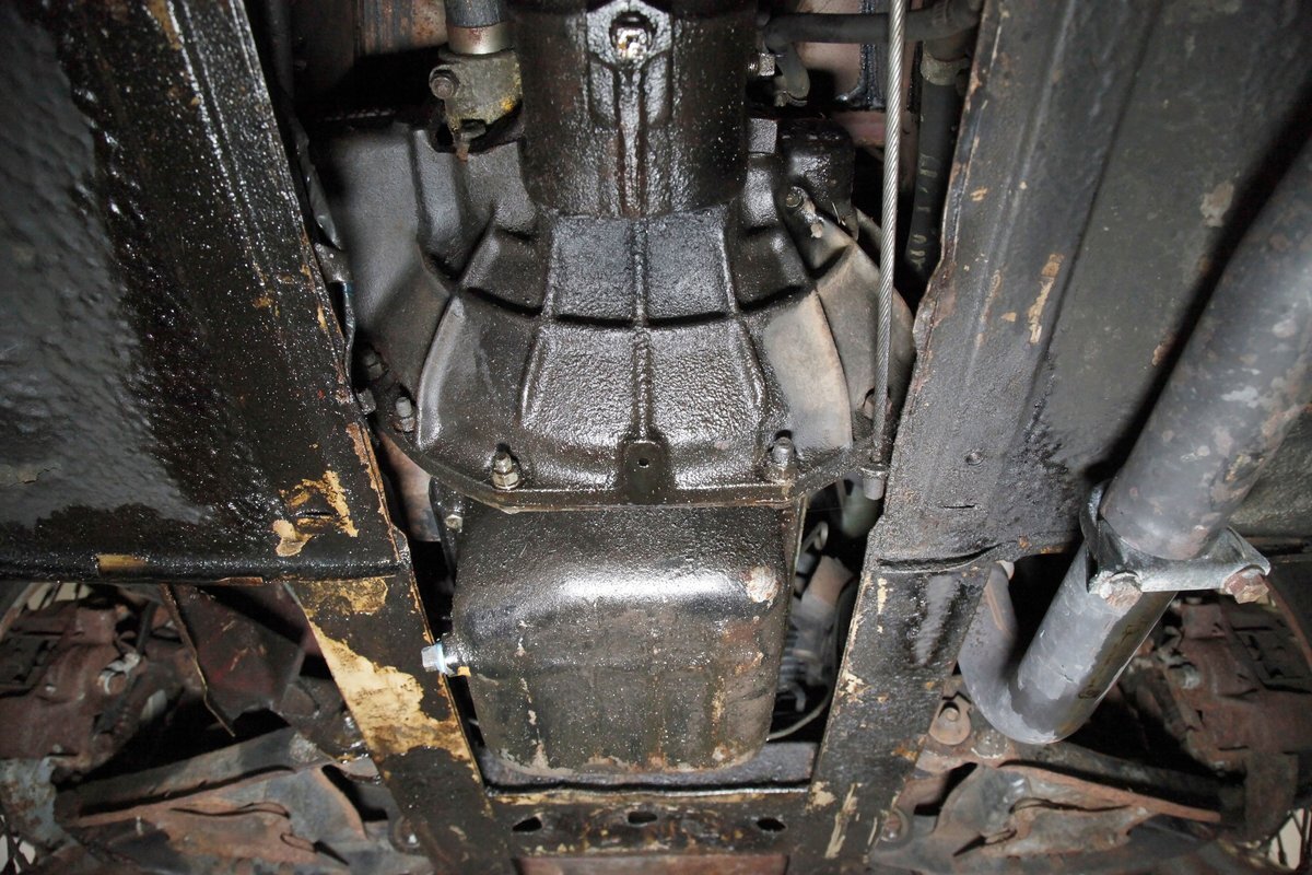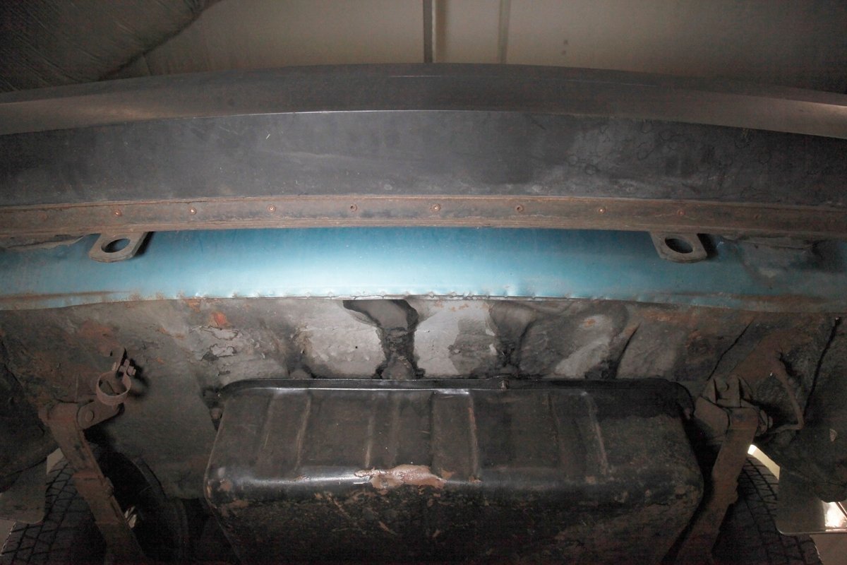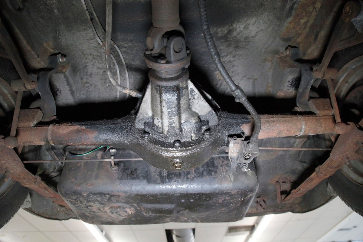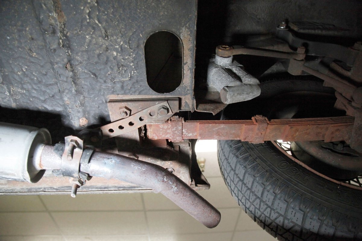 Underneath we note some surface rust, on suspension parts and the edges of the unibody where the floor pans and rockers meet. Front disc brakes are on with drums in the rear and the exhaust has a stock style muffler. Providing the sporty and surefooted ride is an independent coil spring front suspension that works with a leaf spring suspension in the rear and things are looking just cracking amid the patina finished undercarriage.