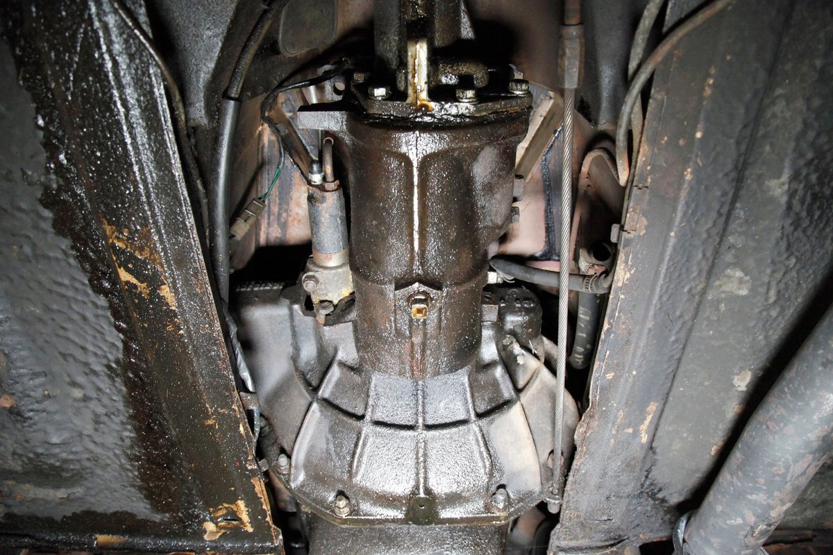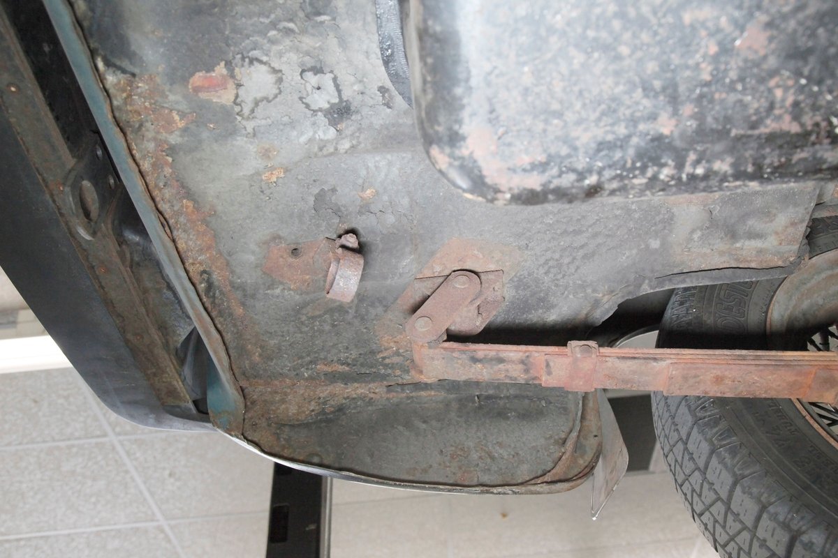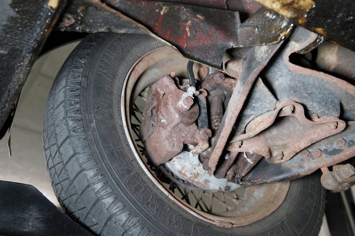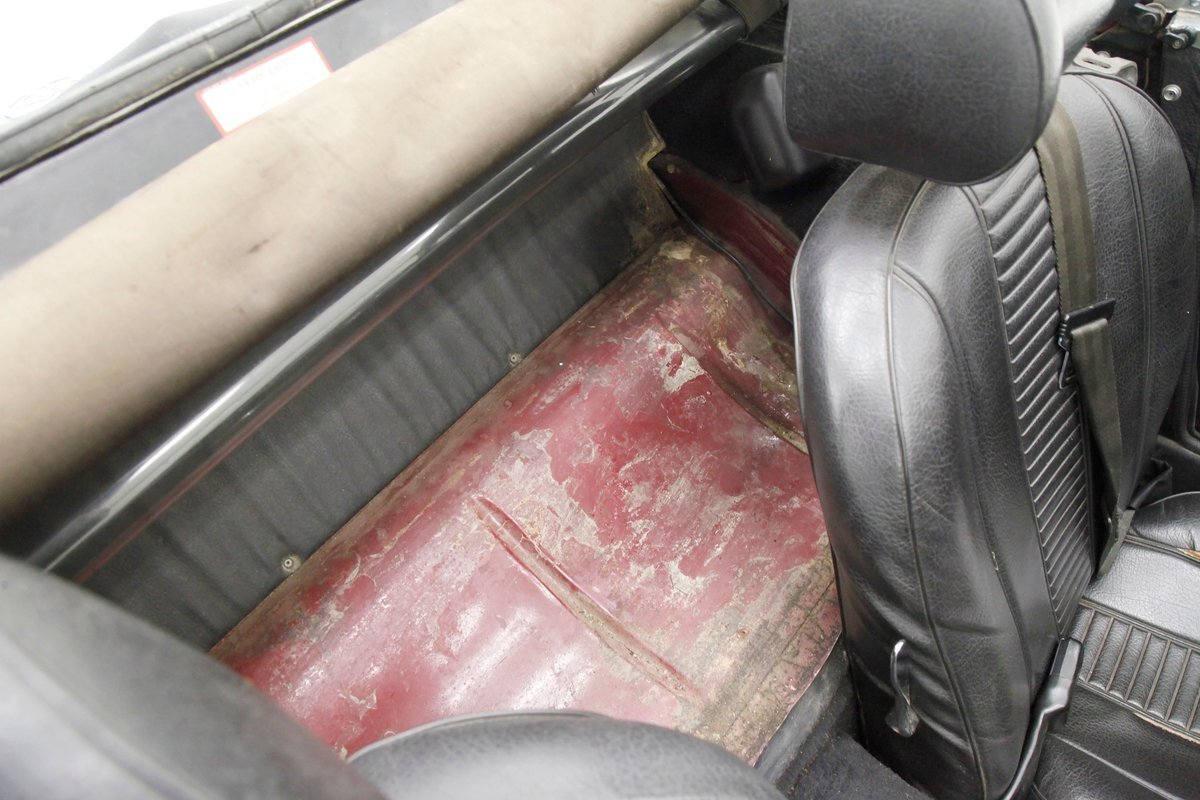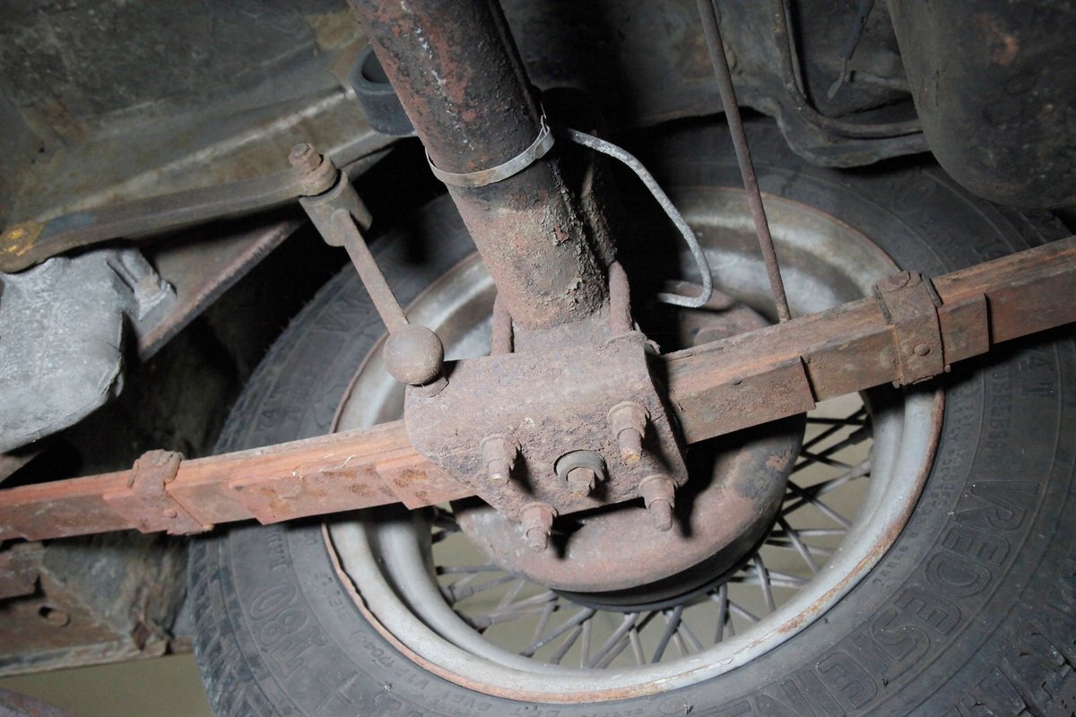 Underneath we note some surface rust, on suspension parts and the edges of the unibody where the floor pans and rockers meet. Front disc brakes are on with drums in the rear and the exhaust has a stock style muffler. Providing the sporty and surefooted ride is an independent coil spring front suspension that works with a leaf spring suspension in the rear and things are looking just cracking amid the patina finished undercarriage.