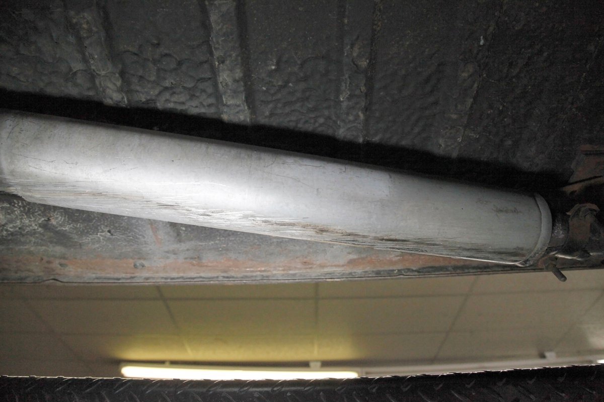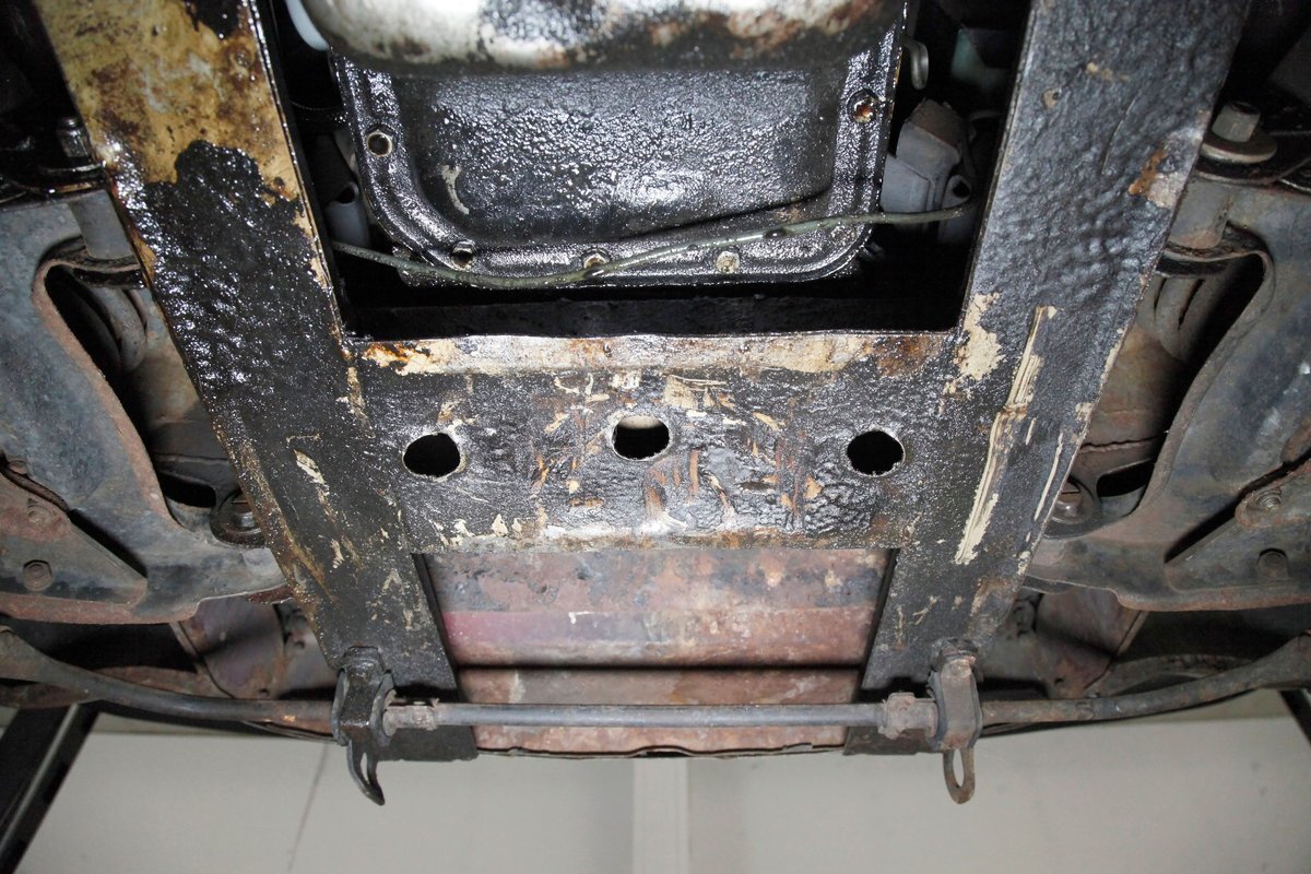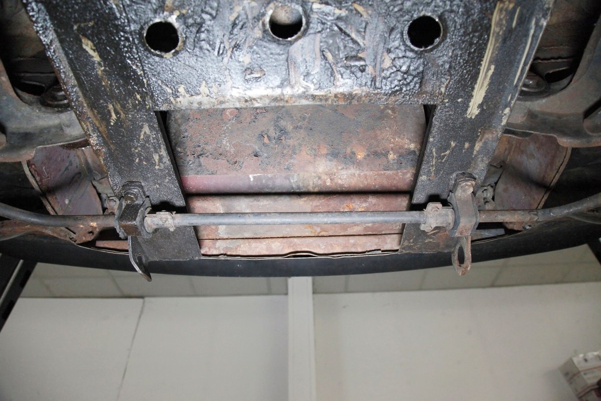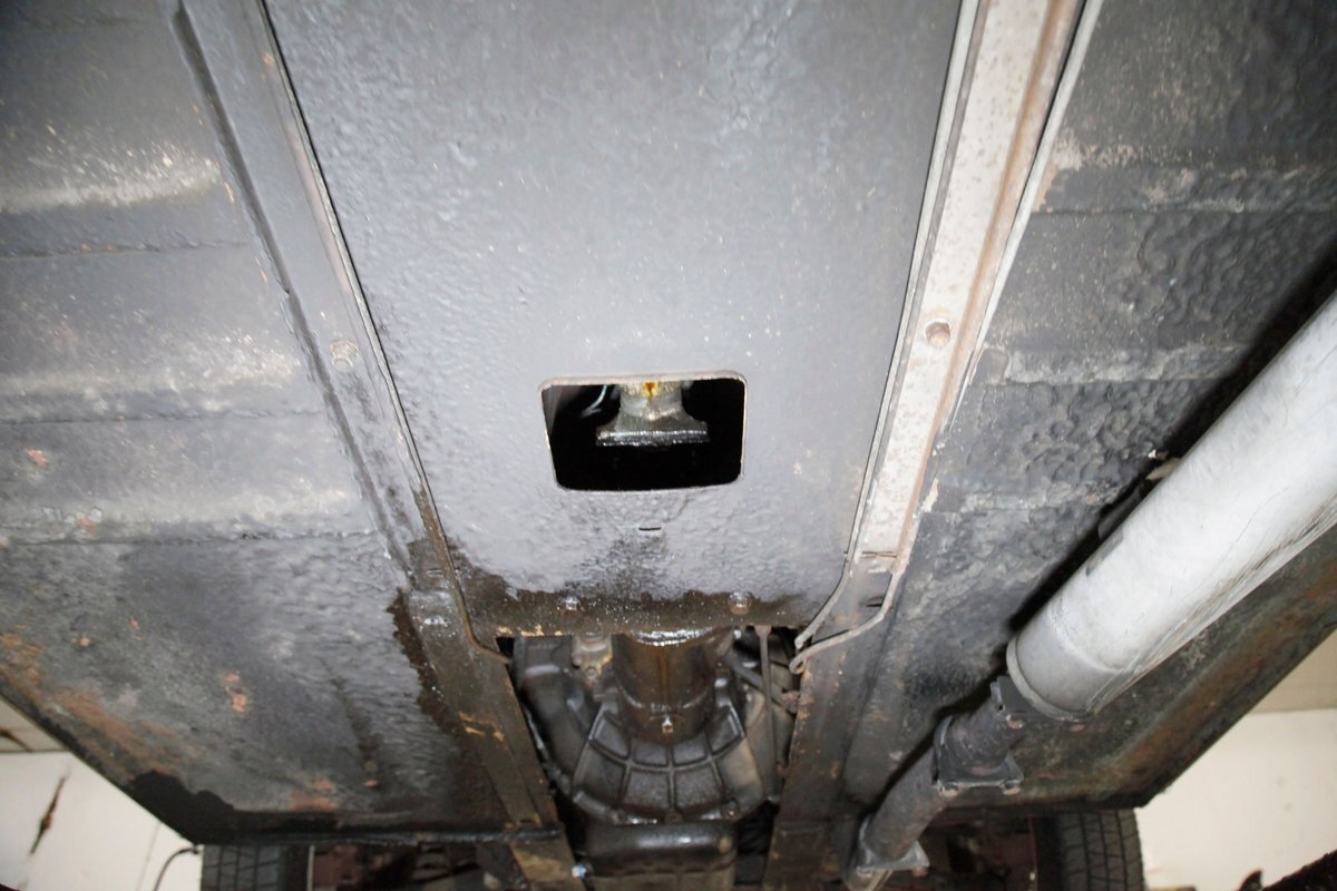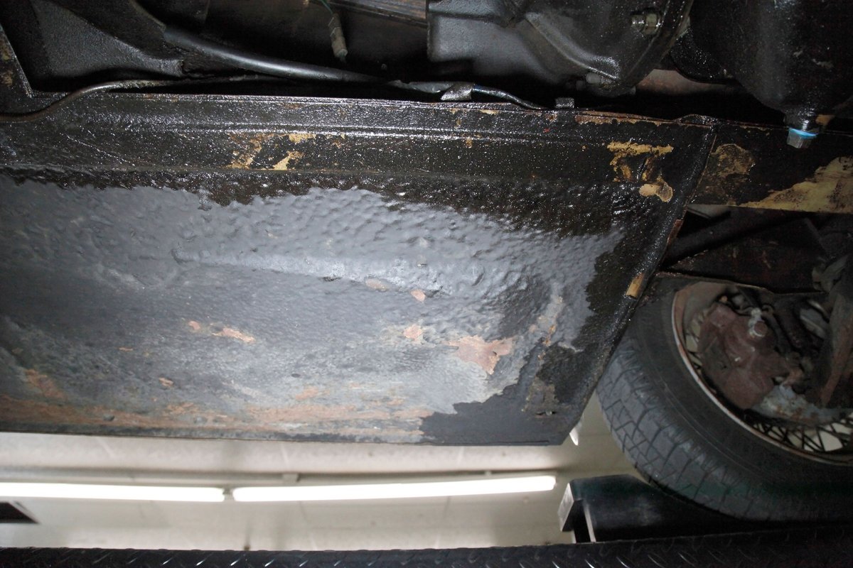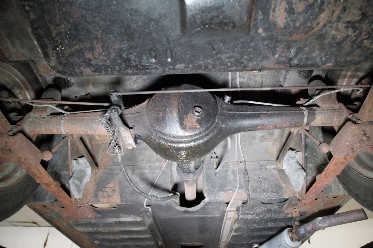 Underneath we note some surface rust, on suspension parts and the edges of the unibody where the floor pans and rockers meet. Front disc brakes are on with drums in the rear and the exhaust has a stock style muffler. Providing the sporty and surefooted ride is an independent coil spring front suspension that works with a leaf spring suspension in the rear and things are looking just cracking amid the patina finished undercarriage.