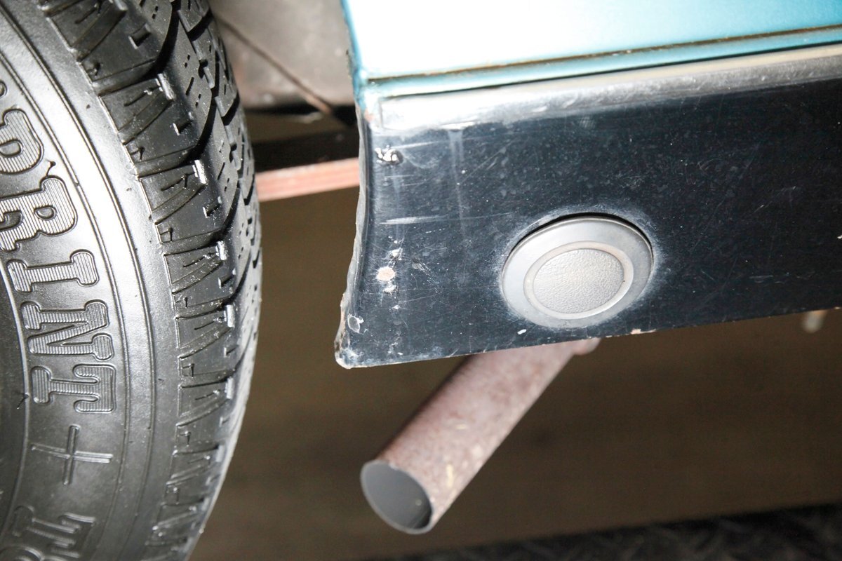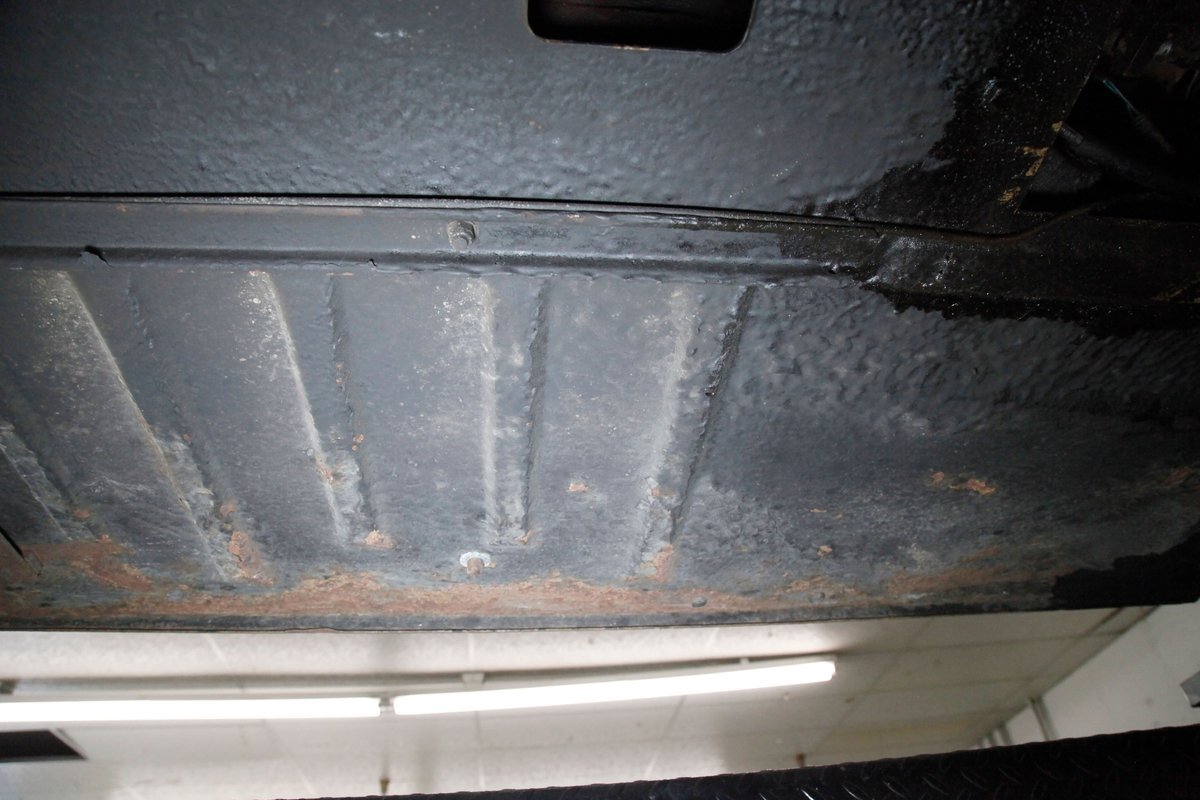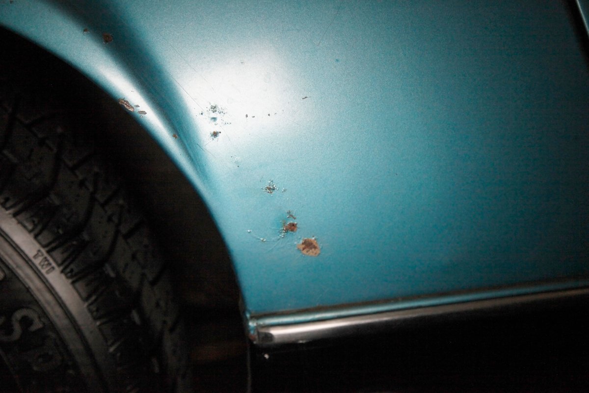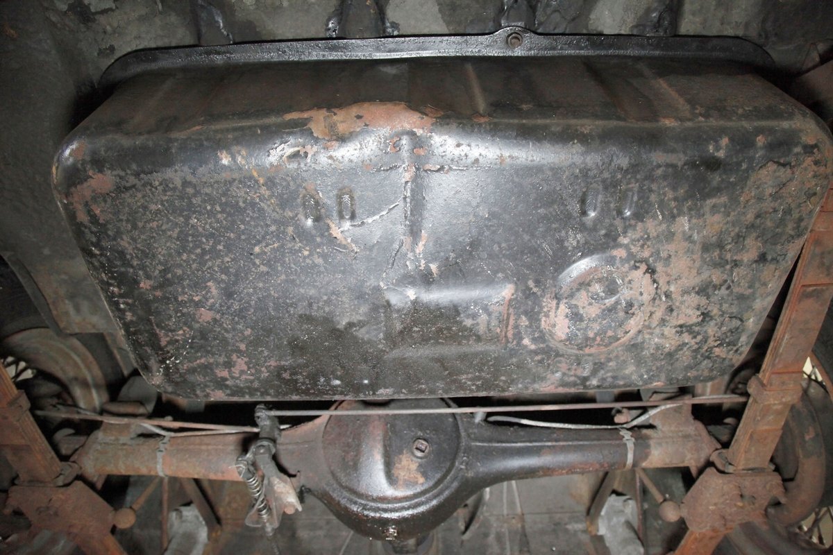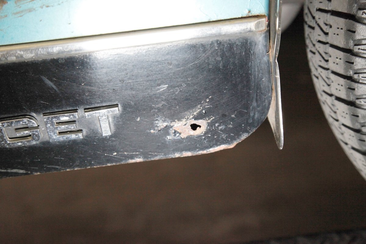 Underneath we note some surface rust, on suspension parts and the edges of the unibody where the floor pans and rockers meet. Front disc brakes are on with drums in the rear and the exhaust has a stock style muffler. Providing the sporty and surefooted ride is an independent coil spring front suspension that works with a leaf spring suspension in the rear and things are looking just cracking amid the patina finished undercarriage.