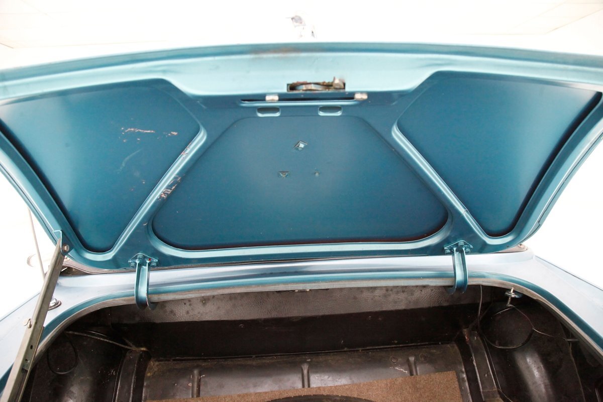 A swing of the doors and we have black vinyl for the door panels. These are showing a bit of wrinkling and are peppered with black knobs and chrome pulls for the door release. The buckets are in black vinyl with a central ribbed pattern to compliment the textured grain. The original dash is upfront and in splendid condition save for the cracked black padded topper. Overall this is in very nice condition with original gauges and a nice center console in black with an ashtray and the shift lever with a watch like knob topper. The factory AM/FM radio hangs below the chrome trimmed and mesh grilled speaker. Faded and torn black carpet covers the floors and behind the seats the carpeting has been removed showing the original burgundy finish. A peek into the trunk shows black finished metal, some brown Berber carpeting and an extra wire knock off spare wheel.