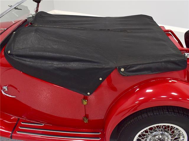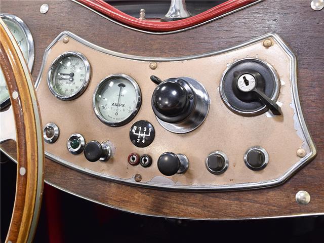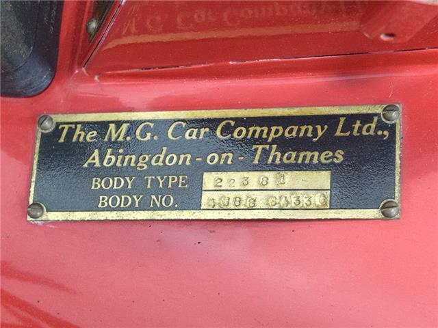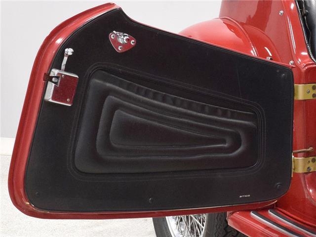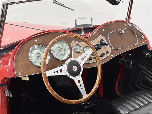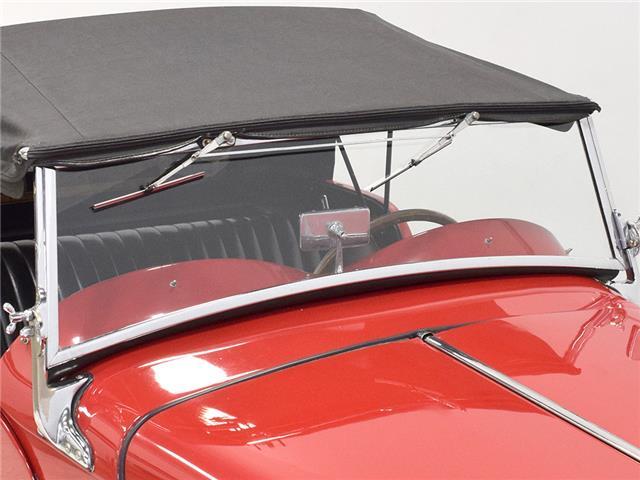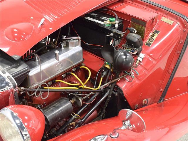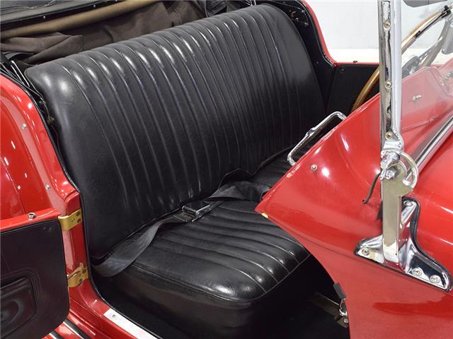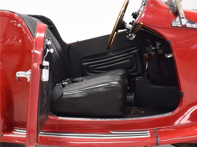 The interior is trimmed in black vinyl that’s durable and comfortable, with a traditional look that suggests old world craftsmanship. Interestingly, MG used individual lower seat cushions but one single backrest, which is adjustable for angle, so it’s easy to get comfortable, even for taller drivers. There’s also a steering column that’s adjustable for reach, which is a nice feature on an early car like this. The seating surfaces are supple and smooth with only moderate signs of use on the driver’s cushion, and the door panels are beautifully fitted with built-in map pockets. The lovely wood-rimmed steering wheel was replaced during the restoration and all those lovely green-faced gauges were rebuilt and remain fully functional. The other switches are familiar, from the pull-out starter knob to the rotating headlight switch. For weather protection, this car has a nicely fitted black canvas convertible top that folds and stows behind the seat, as well as a full set of side curtains and a full tonneau for the passenger compartment. There is no trunk, but the area behind the seat is neatly finished and includes a narrow compartment for storage.