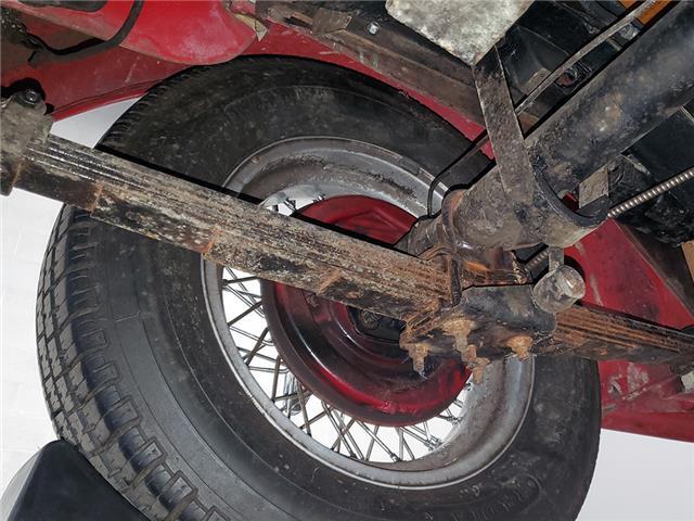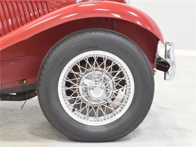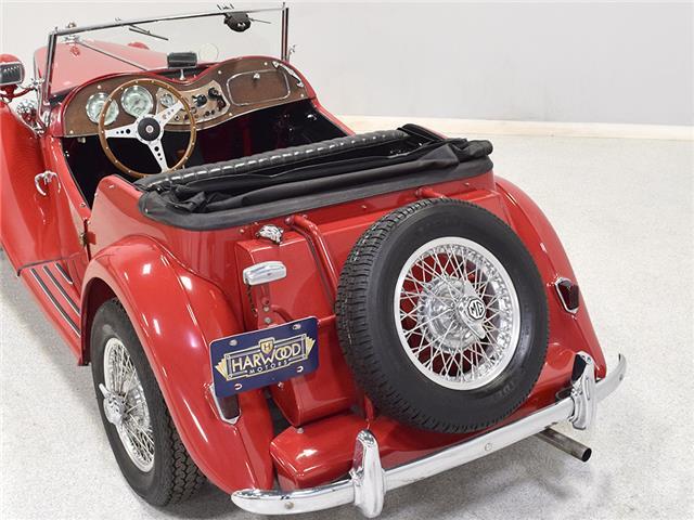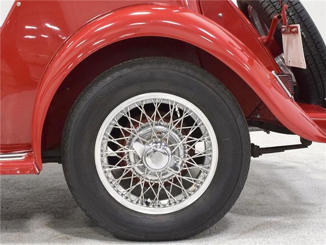 Mechanically, the TD wasn’t all that different from the TC, including the recently rebuilt 1250cc inline-four cylinder engine. It makes a rather sprightly 53 horsepower, but in such a lightweight package it’s plenty energetic and makes wonderful sports car sounds. Fed by a pair of side-draft carburetors breathing through cool competition-style air cleaners, it’s correctly finished and nicely detailed, from the MG Maroon paint on the block itself to the polished aluminum valve cover on top. A cowl-mounted SU fuel pump keeps the carbs fed and a few flashes of color like the yellow cooling fan and ignition wires look racy. During the restoration, it was fully rebuilt to factory specs and it runs superbly, starting easily and running down the road with a gutsy sound that is a big part of the MG experience. It shows a few minor signs of use but again, the quality of the restoration work is evident throughout. This one was built to drive, so it’s not perfect, but you’ll never hesitate to open the hood at shows and show it off a little bit. The updated 5-speed manual gearbox comes from a Ford and offers an overdrive gear that makes it much more useable in the modern world. With light throws, just the right gear ratios, and a wonderfully precise feel, you’ll find yourself shifting just for the sheer joy of it. The engine is torquey enough to pull 3rd gear from very low speeds, but the fun is in running it through the gears with enthusiasm, letting the engine sing its surprisingly deep baritone song through the single tailpipe out back. It’s not fast, not by today’s standards, but the fun is in driving it at 8/10ths and still running at a moderate pace without endangering everyone else on the road. You feel like you’re exercising the car and having a ball doing it. The suspension was upgraded on the TD and the rack-and-pinion steering is a wonderful addition, giving improved precision with less effort. There’s a recent exhaust system, the wood floors are obviously new, and the structural pieces are in excellent condition throughout. Upgraded shocks were included with the TD and the standard drum brakes are plenty powerful with the car’s modest curb weight. 165R15 blackwall radials on shiny wire wheels are grippy enough to be entertaining and look right in the fenders.
