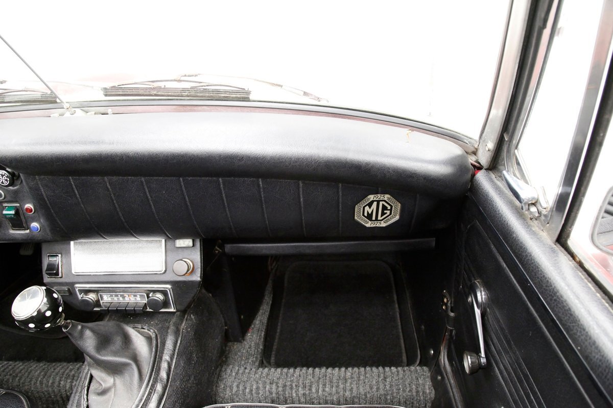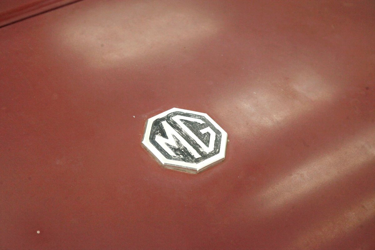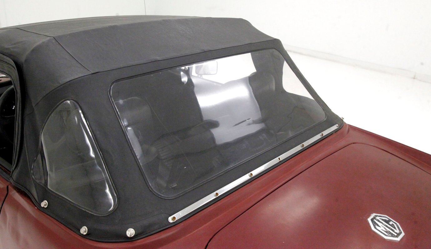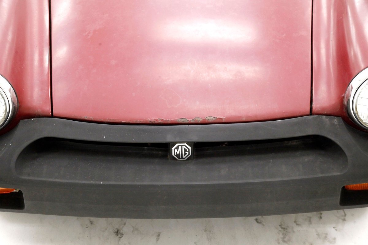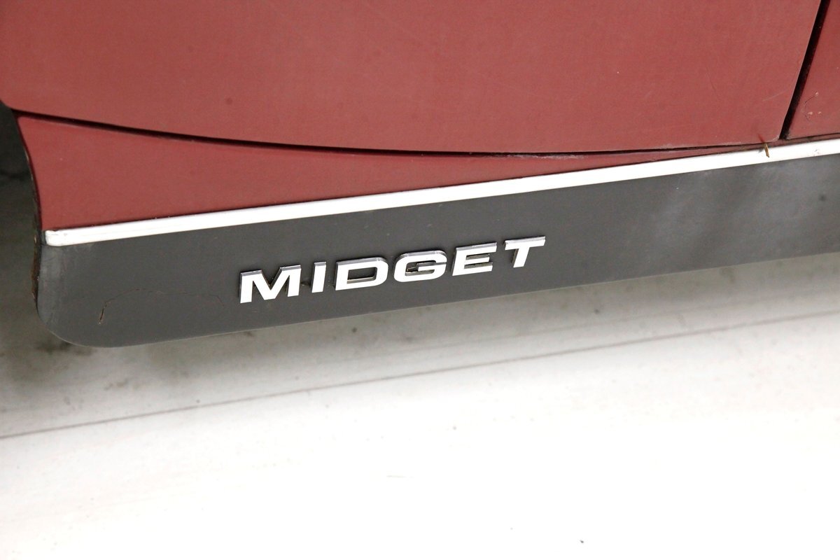 Nice straight steel panels with decently minded gaps are bolted on to a miniature frame, and adorned "Sabrina" rubber crash bumpers and chrome bezels for your visual enjoyment. Faded burgundy paint, quite possibly the original coating, is on to these panels giving an unrestored but alluring finish to the body. Some surface rust, bordering on the invasive end of the spectrum is leading the way at the front of the bonnet and a black rocker painting adds nice contrast to the burgundy and goes with the black convertible top. This top is showing some age but remains tear free and shows virtually no hazing or yellowing for the plastic windows. A simple mouthlike opening is in the front of the large rubber bumper with a centered octagonal MG badge. Sparse but effective trimmings for the side mirrors, window surrounds, rocker trim, and door handles show nicely. On the back is another "Sabrina" mandated crash rear bumper, and large vertical taillights on either corner. Another octagonal MG badge seen on the boot lid. Sporty mag style silver highlighted wheels are on all 4 corners, and all have a black background.