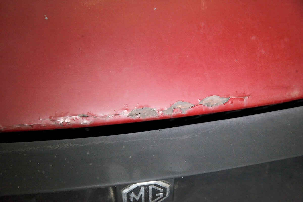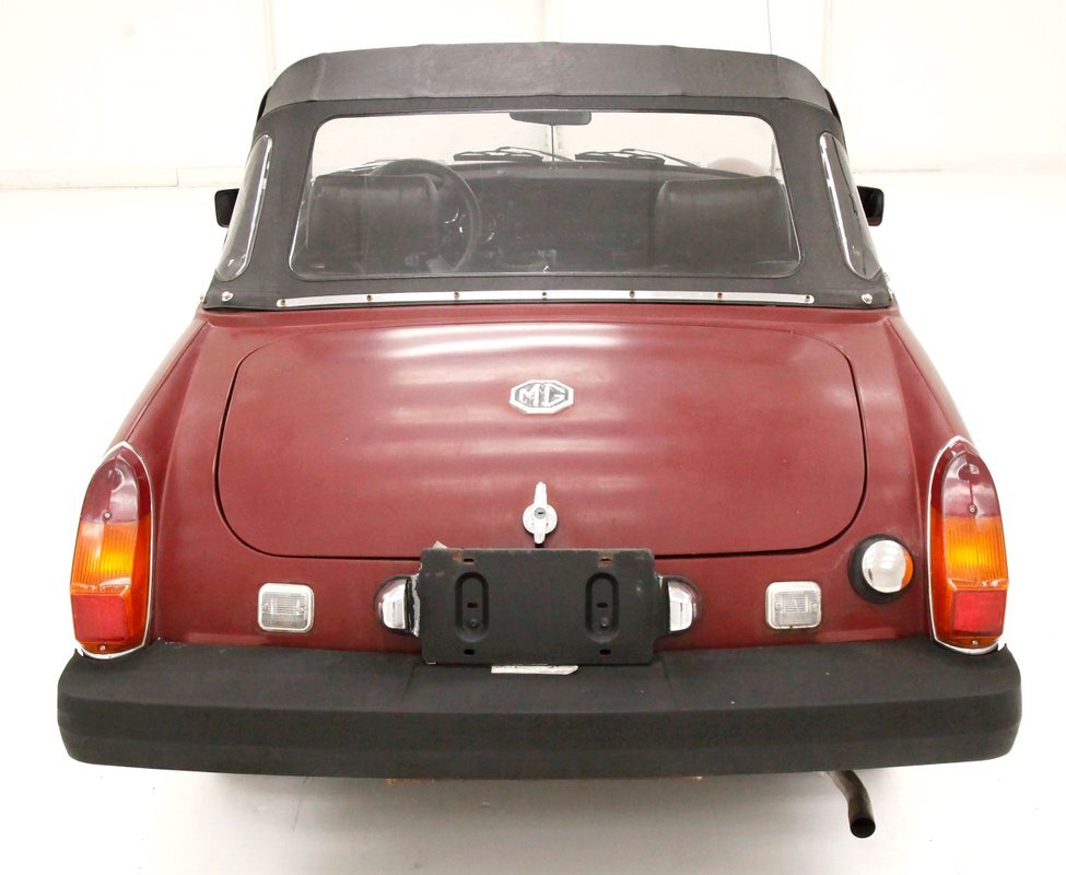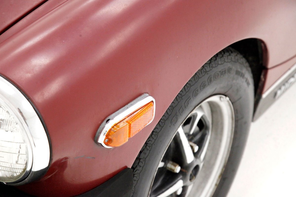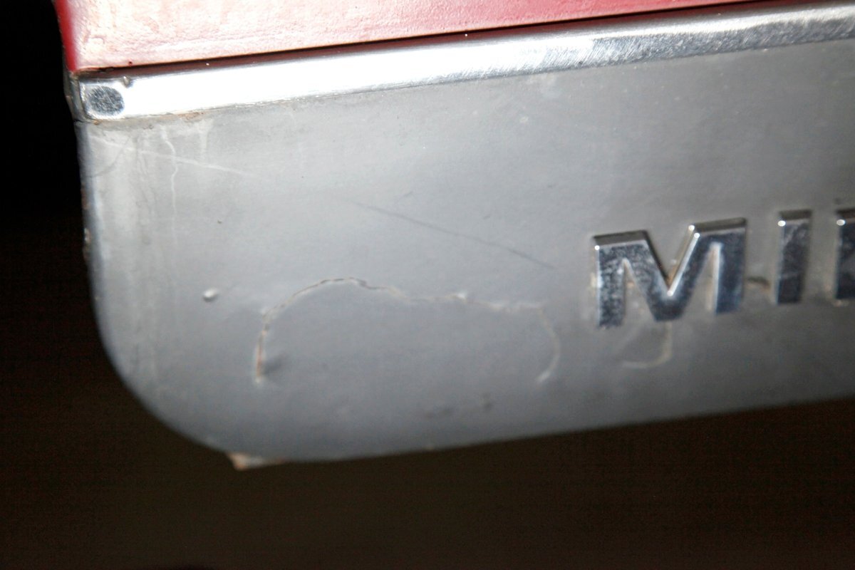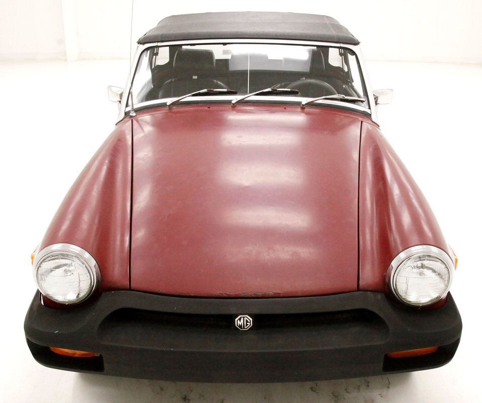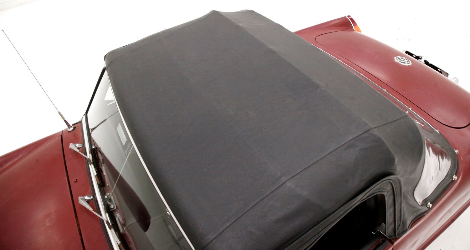 Nice straight steel panels with decently minded gaps are bolted on to a miniature frame, and adorned "Sabrina" rubber crash bumpers and chrome bezels for your visual enjoyment. Faded burgundy paint, quite possibly the original coating, is on to these panels giving an unrestored but alluring finish to the body. Some surface rust, bordering on the invasive end of the spectrum is leading the way at the front of the bonnet and a black rocker painting adds nice contrast to the burgundy and goes with the black convertible top. This top is showing some age but remains tear free and shows virtually no hazing or yellowing for the plastic windows. A simple mouthlike opening is in the front of the large rubber bumper with a centered octagonal MG badge. Sparse but effective trimmings for the side mirrors, window surrounds, rocker trim, and door handles show nicely. On the back is another "Sabrina" mandated crash rear bumper, and large vertical taillights on either corner. Another octagonal MG badge seen on the boot lid. Sporty mag style silver highlighted wheels are on all 4 corners, and all have a black background.