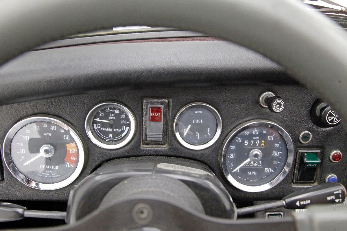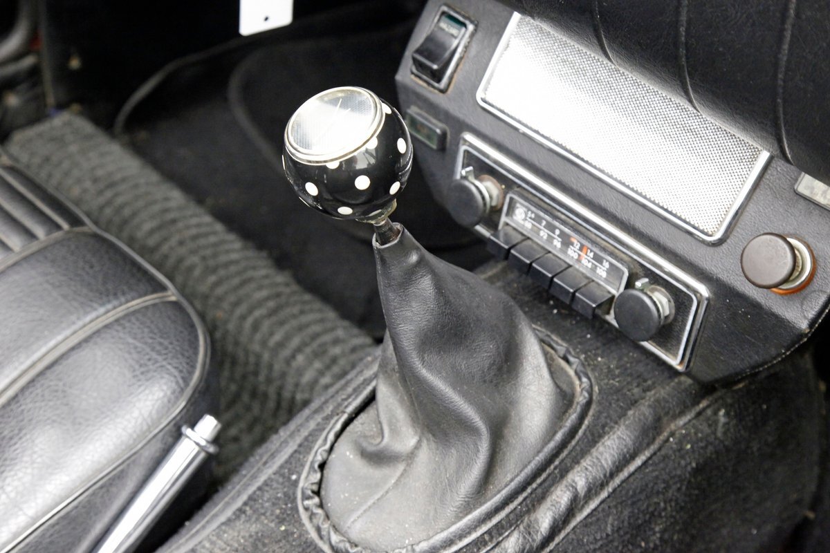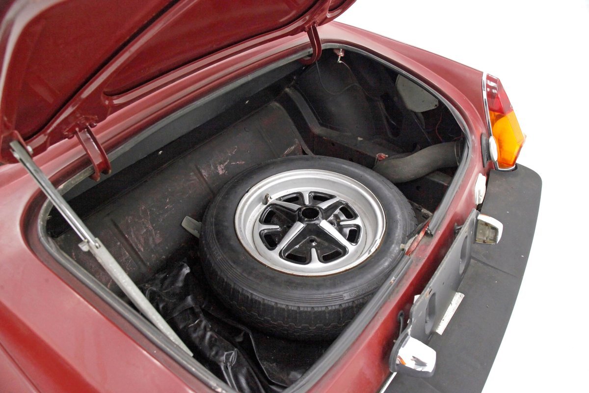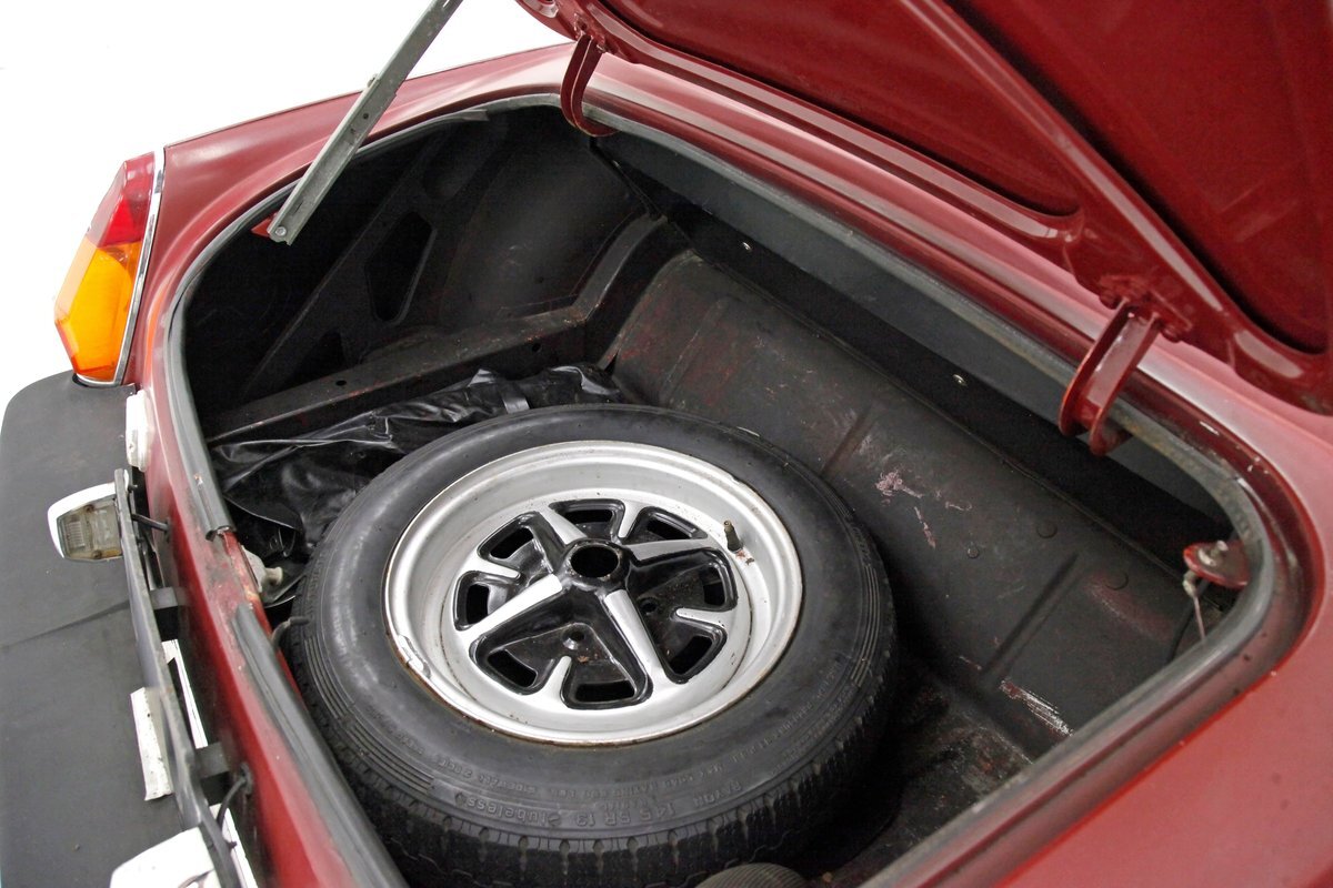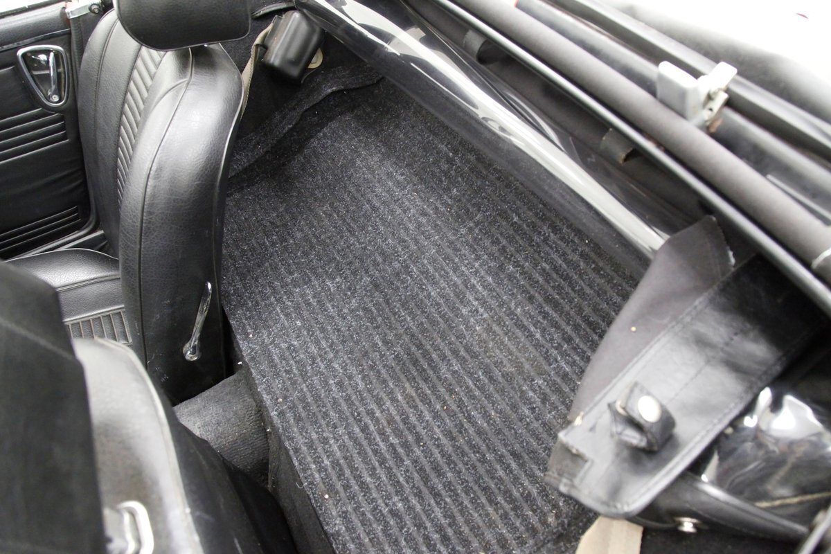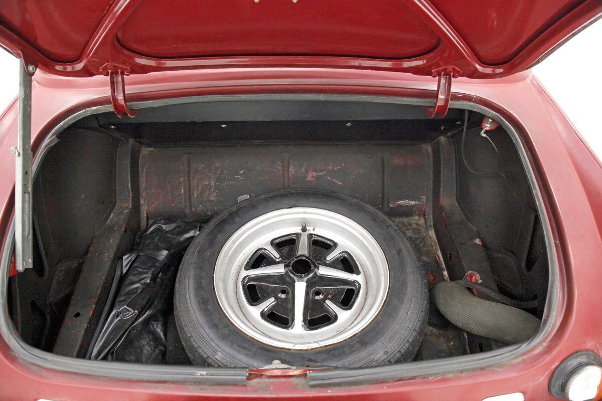 A swing of the doors and we have black vinyl for the door panels. This is showing a bit wrinkled and is peppered with black knobs and chrome pulls with a fabricated auxiliary door release. The buckets are in black vinyl with a central ribbed pattern to compliment the textured grain. The original dash is upfront and in splendid condition. Overall, in very nice condition with original gauges and a nice center console in black with an ashtray and the shift lever with a watch like knob topper. The factory AM/FM radio hangs below the chrome trimmed and mesh grilled speaker. Lightly faded black carpet covers the floors, and nice black mats cover the carpet. A peek into the trunk shows an original and unrestored stowage area that holds the spare 5 spoke MG rally style wheel and tire.
