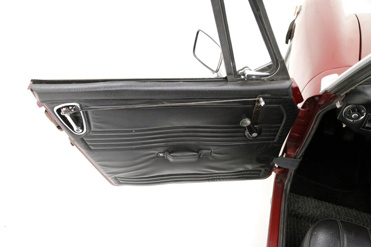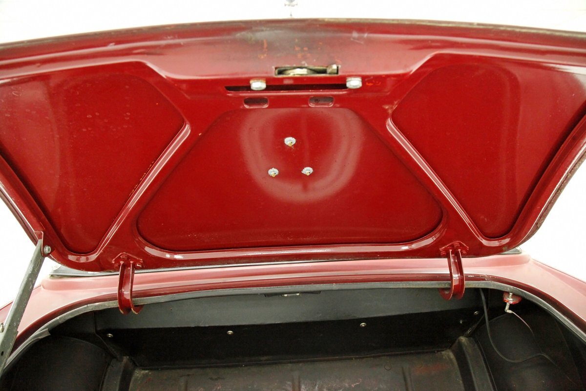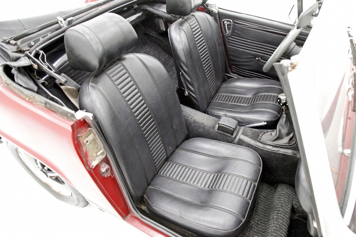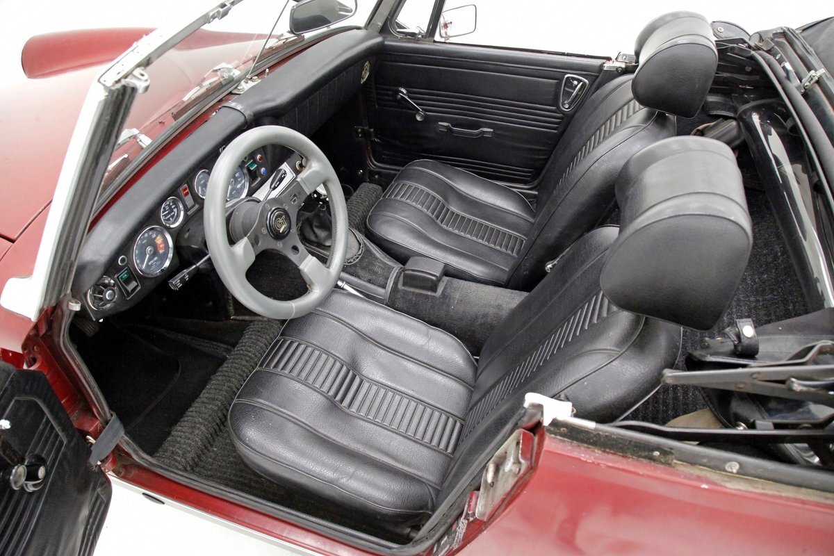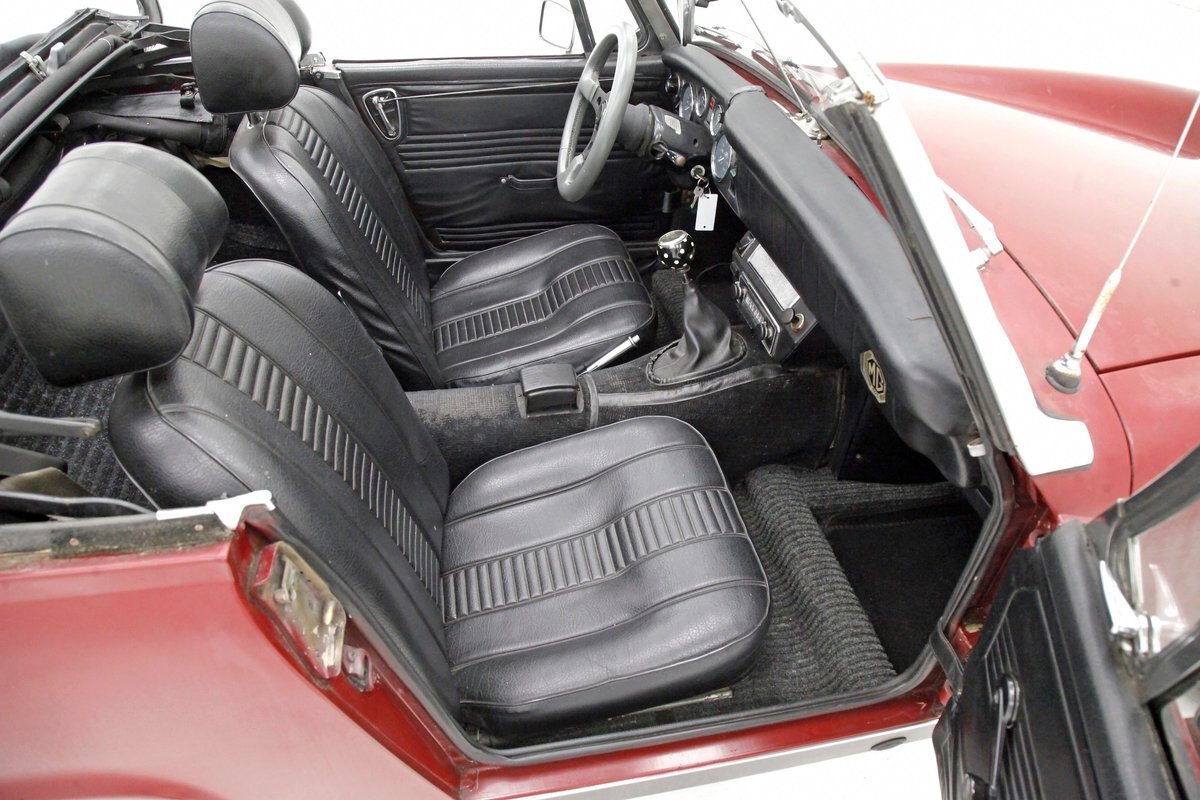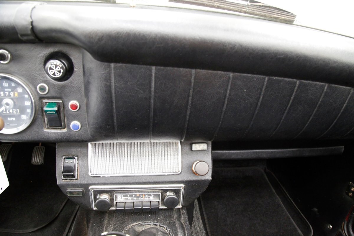 A swing of the doors and we have black vinyl for the door panels. This is showing a bit wrinkled and is peppered with black knobs and chrome pulls with a fabricated auxiliary door release. The buckets are in black vinyl with a central ribbed pattern to compliment the textured grain. The original dash is upfront and in splendid condition. Overall, in very nice condition with original gauges and a nice center console in black with an ashtray and the shift lever with a watch like knob topper. The factory AM/FM radio hangs below the chrome trimmed and mesh grilled speaker. Lightly faded black carpet covers the floors, and nice black mats cover the carpet. A peek into the trunk shows an original and unrestored stowage area that holds the spare 5 spoke MG rally style wheel and tire.