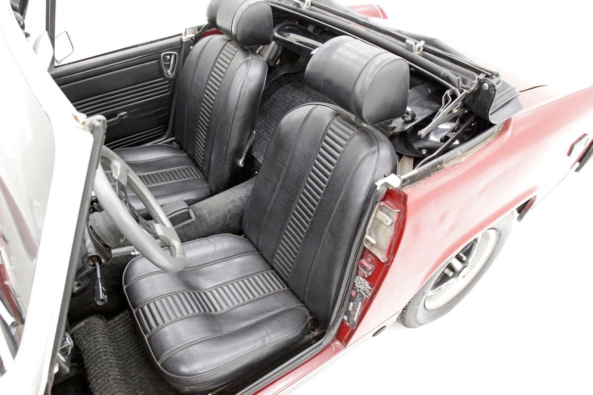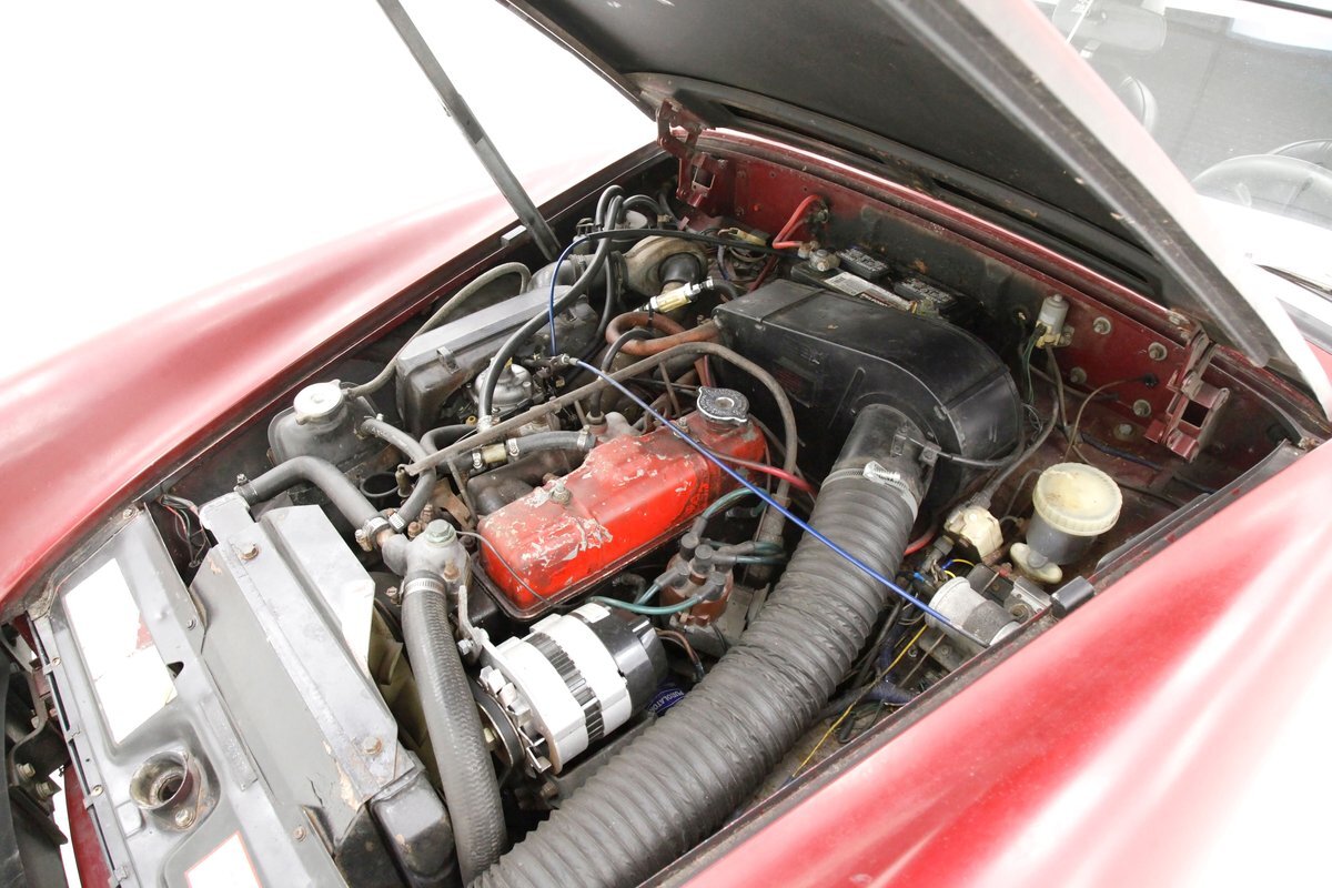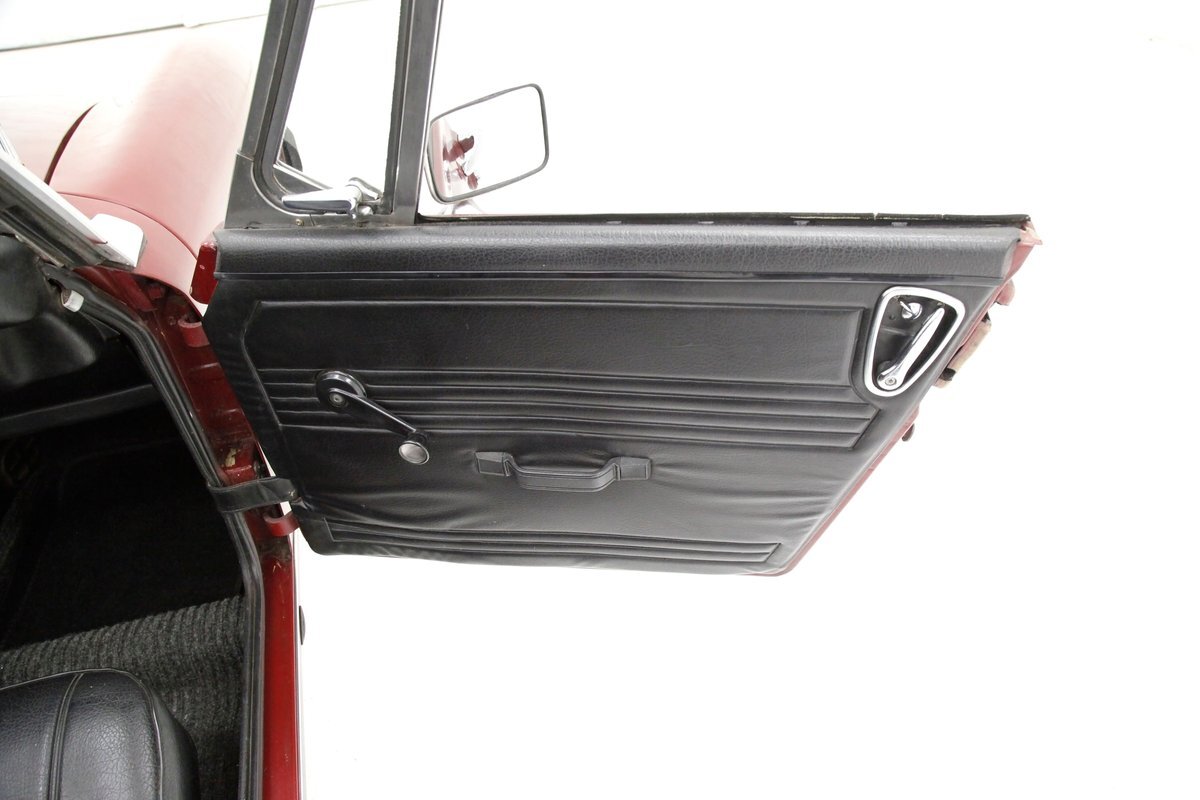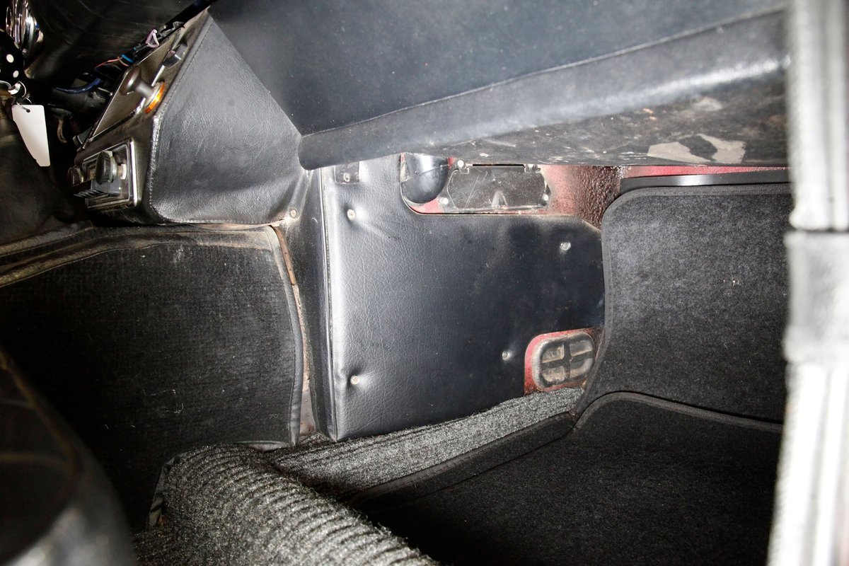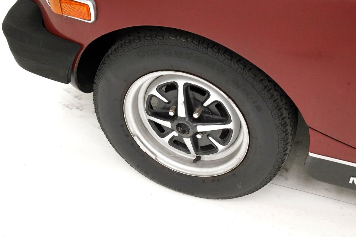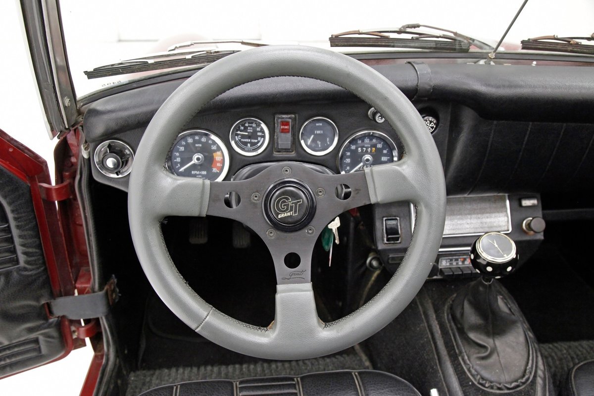 A swing of the doors and we have black vinyl for the door panels. This is showing a bit wrinkled and is peppered with black knobs and chrome pulls with a fabricated auxiliary door release. The buckets are in black vinyl with a central ribbed pattern to compliment the textured grain. The original dash is upfront and in splendid condition. Overall, in very nice condition with original gauges and a nice center console in black with an ashtray and the shift lever with a watch like knob topper. The factory AM/FM radio hangs below the chrome trimmed and mesh grilled speaker. Lightly faded black carpet covers the floors, and nice black mats cover the carpet. A peek into the trunk shows an original and unrestored stowage area that holds the spare 5 spoke MG rally style wheel and tire.