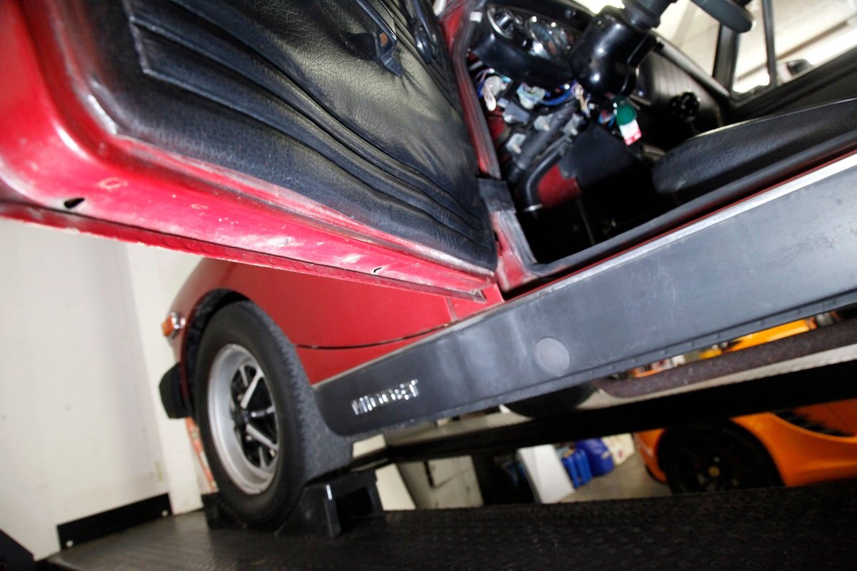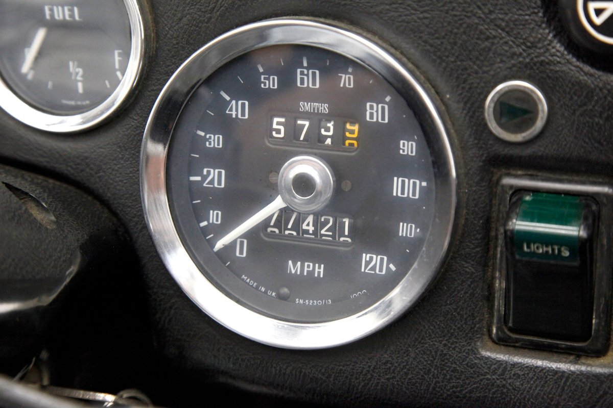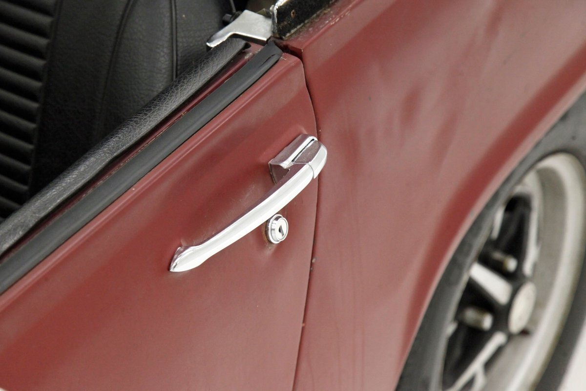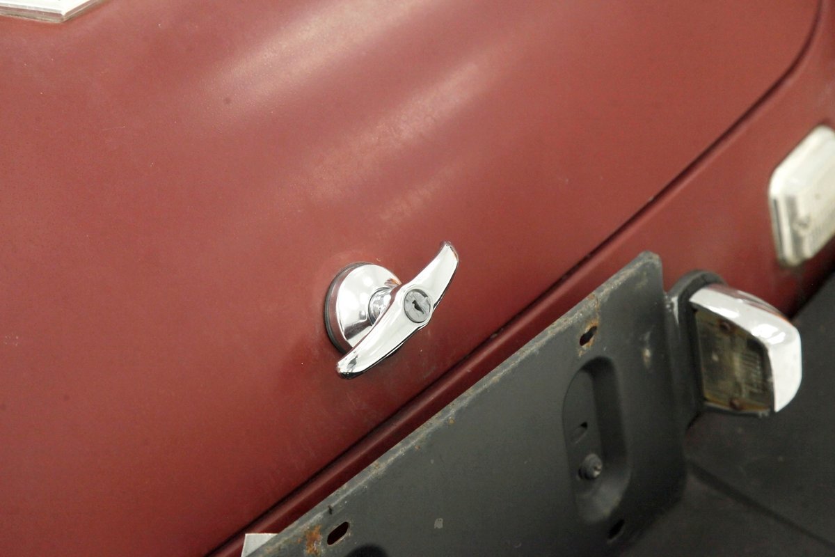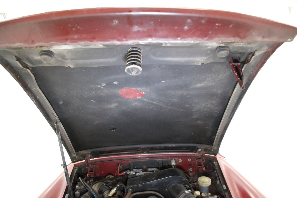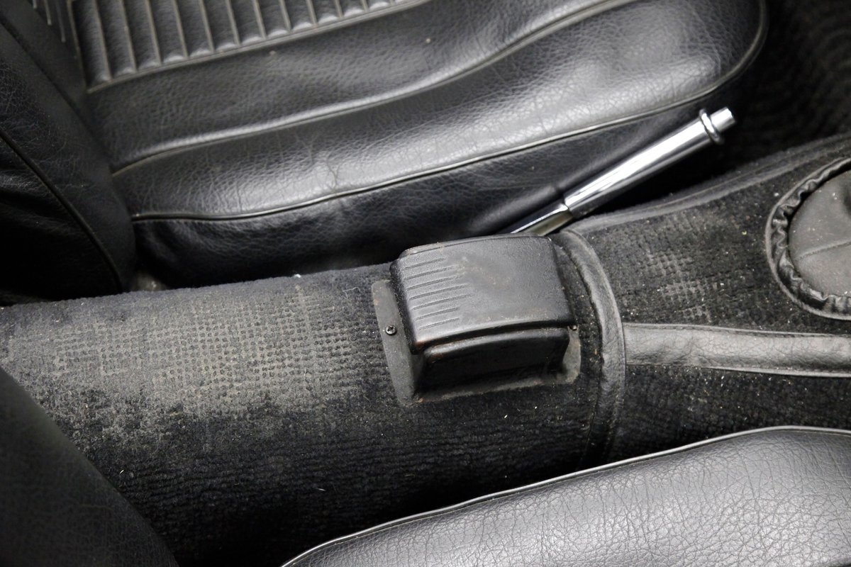A swing of the doors and we have black vinyl for the door panels. This is showing a bit wrinkled and is peppered with black knobs and chrome pulls with a fabricated auxiliary door release. The buckets are in black vinyl with a central ribbed pattern to compliment the textured grain. The original dash is upfront and in splendid condition. Overall, in very nice condition with original gauges and a nice center console in black with an ashtray and the shift lever with a watch like knob topper. The factory AM/FM radio hangs below the chrome trimmed and mesh grilled speaker. Lightly faded black carpet covers the floors, and nice black mats cover the carpet. A peek into the trunk shows an original and unrestored stowage area that holds the spare 5 spoke MG rally style wheel and tire.