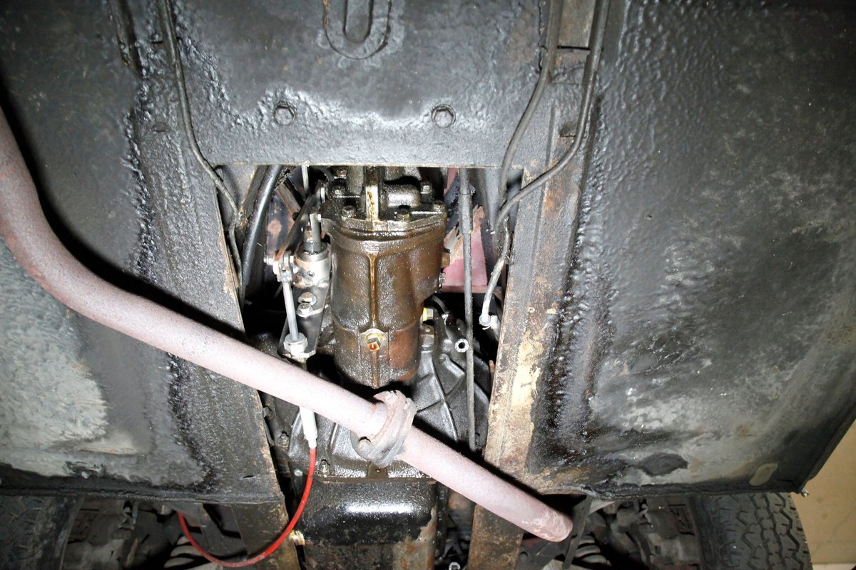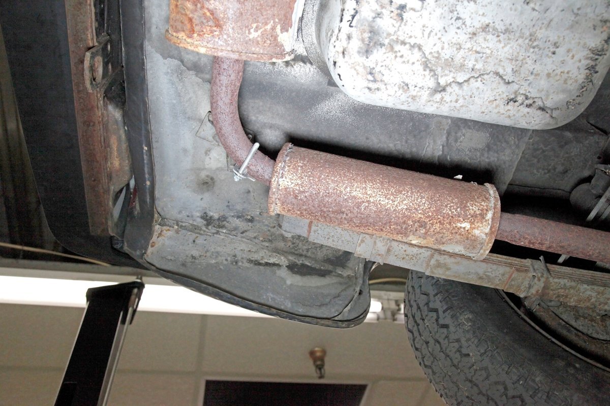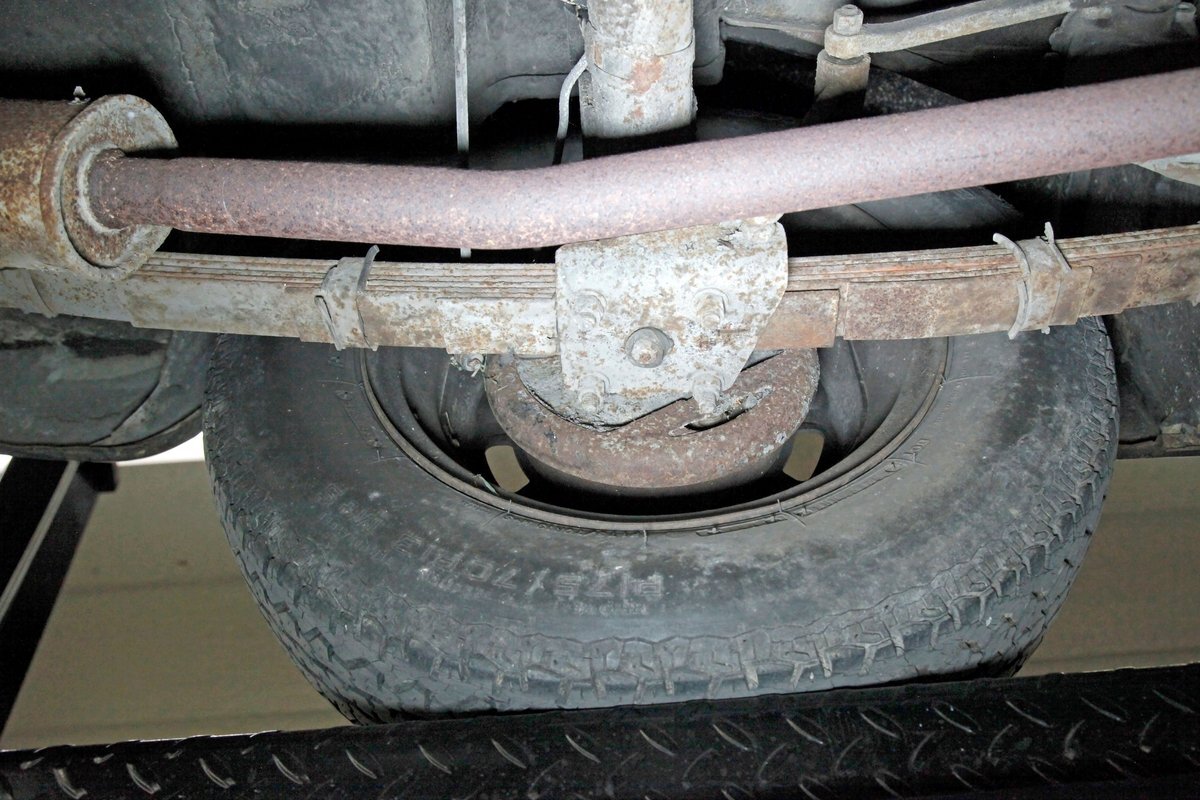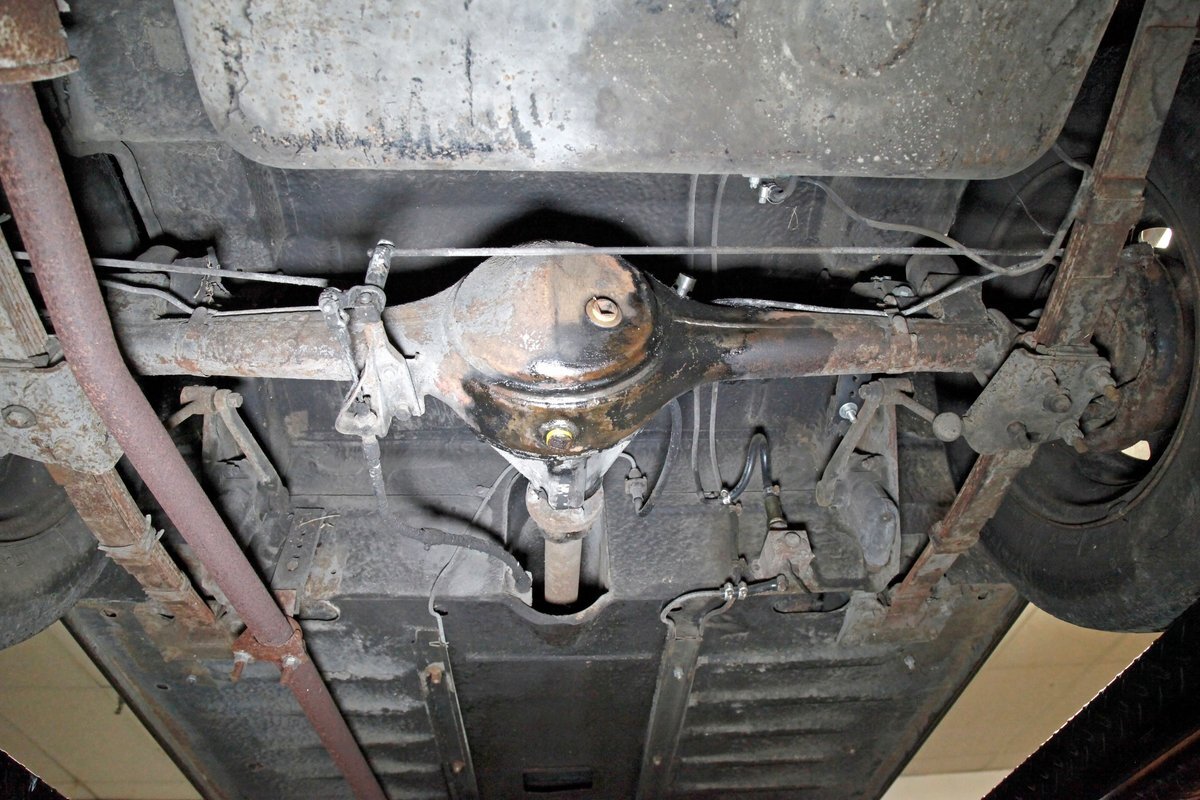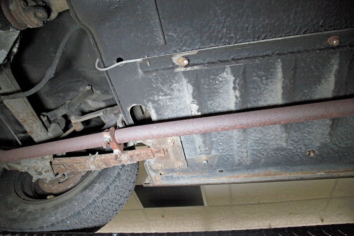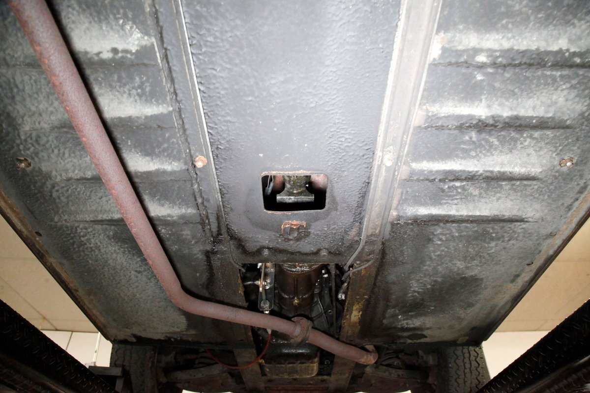 Underneath we note some surface rust, on suspension parts and the edges of the unibody where the floor pans and rockers meet. Front disc brakes are on with drums in the rear and the exhaust has a stock style muffler. Providing the sporty and surefooted ride is an independent coil spring front suspension that works with a leaf spring suspension in the rear. New fuel lines have been installed and are looking just cracking amid the patina finished undercarriage.
