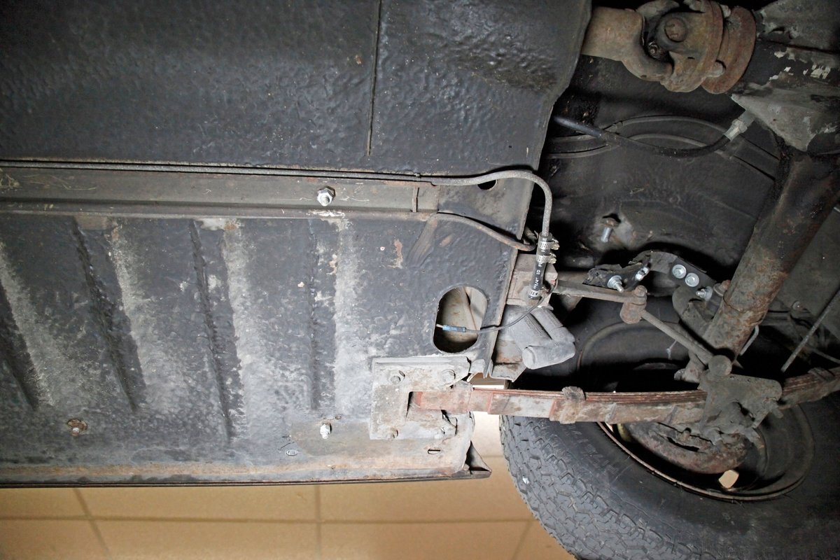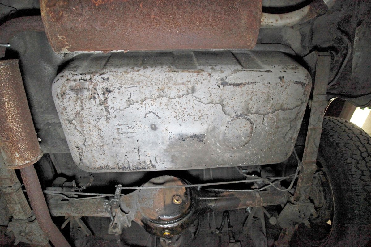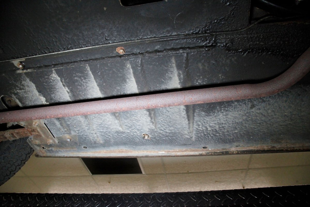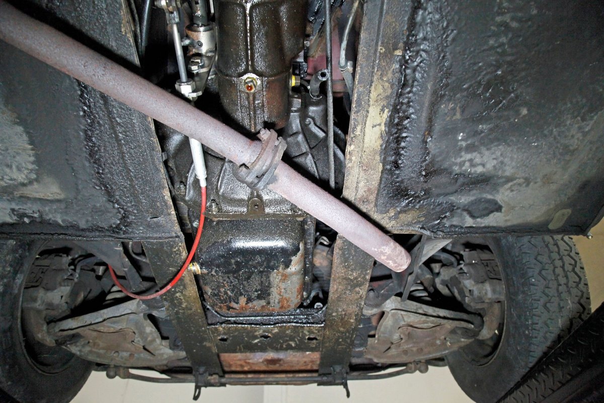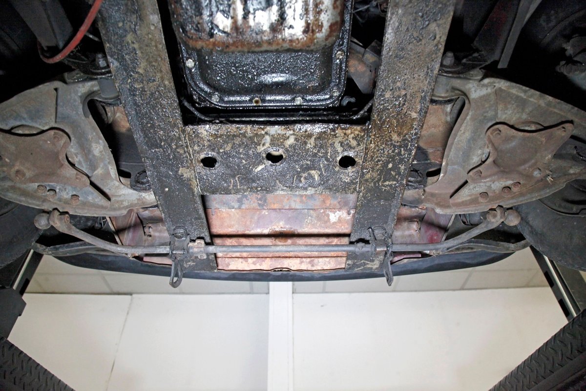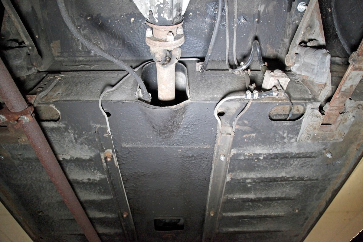Underneath we note some surface rust, on suspension parts and the edges of the unibody where the floor pans and rockers meet. Front disc brakes are on with drums in the rear and the exhaust has a stock style muffler. Providing the sporty and surefooted ride is an independent coil spring front suspension that works with a leaf spring suspension in the rear. New fuel lines have been installed and are looking just cracking amid the patina finished undercarriage.
