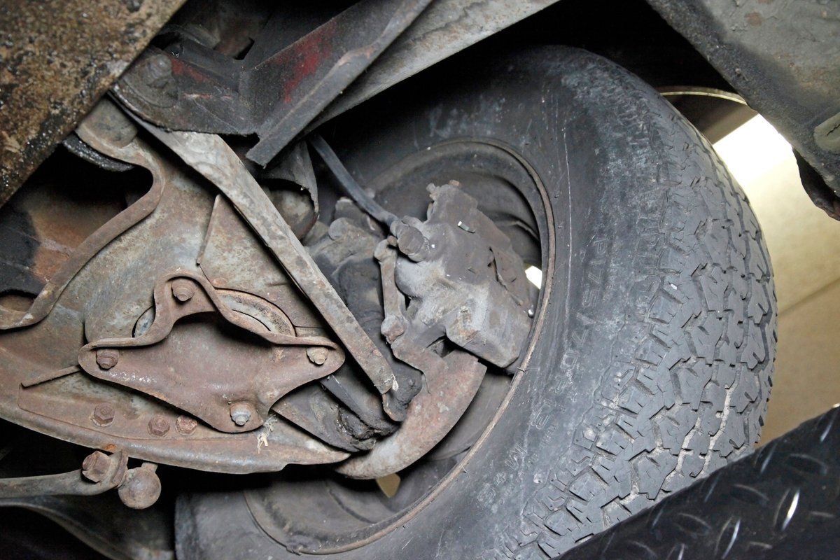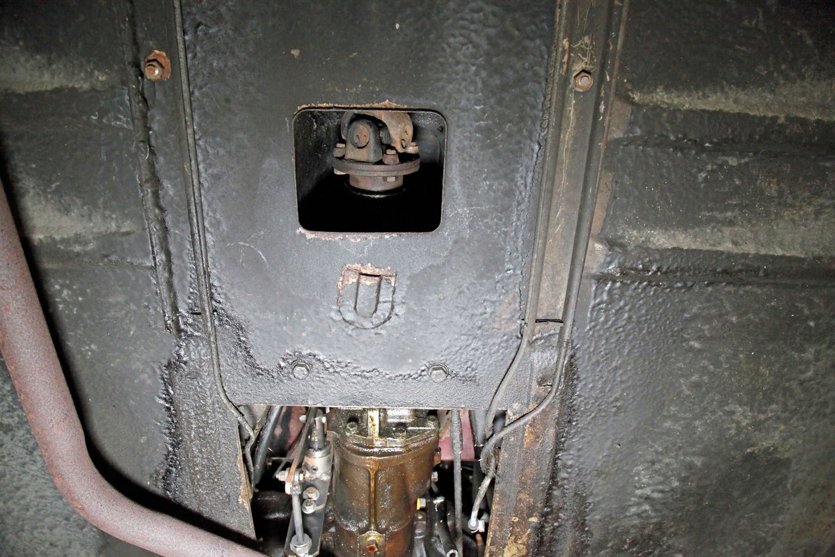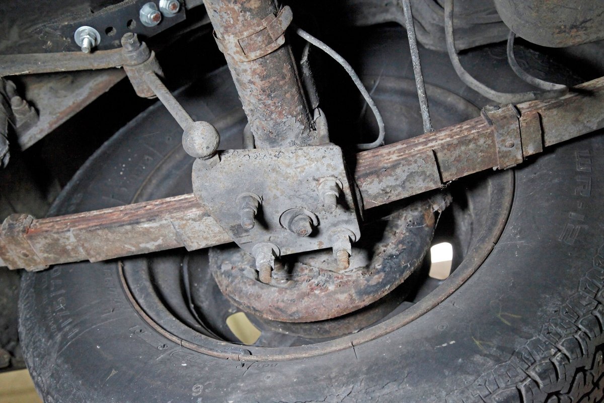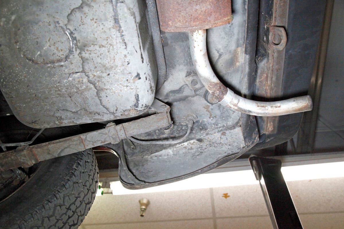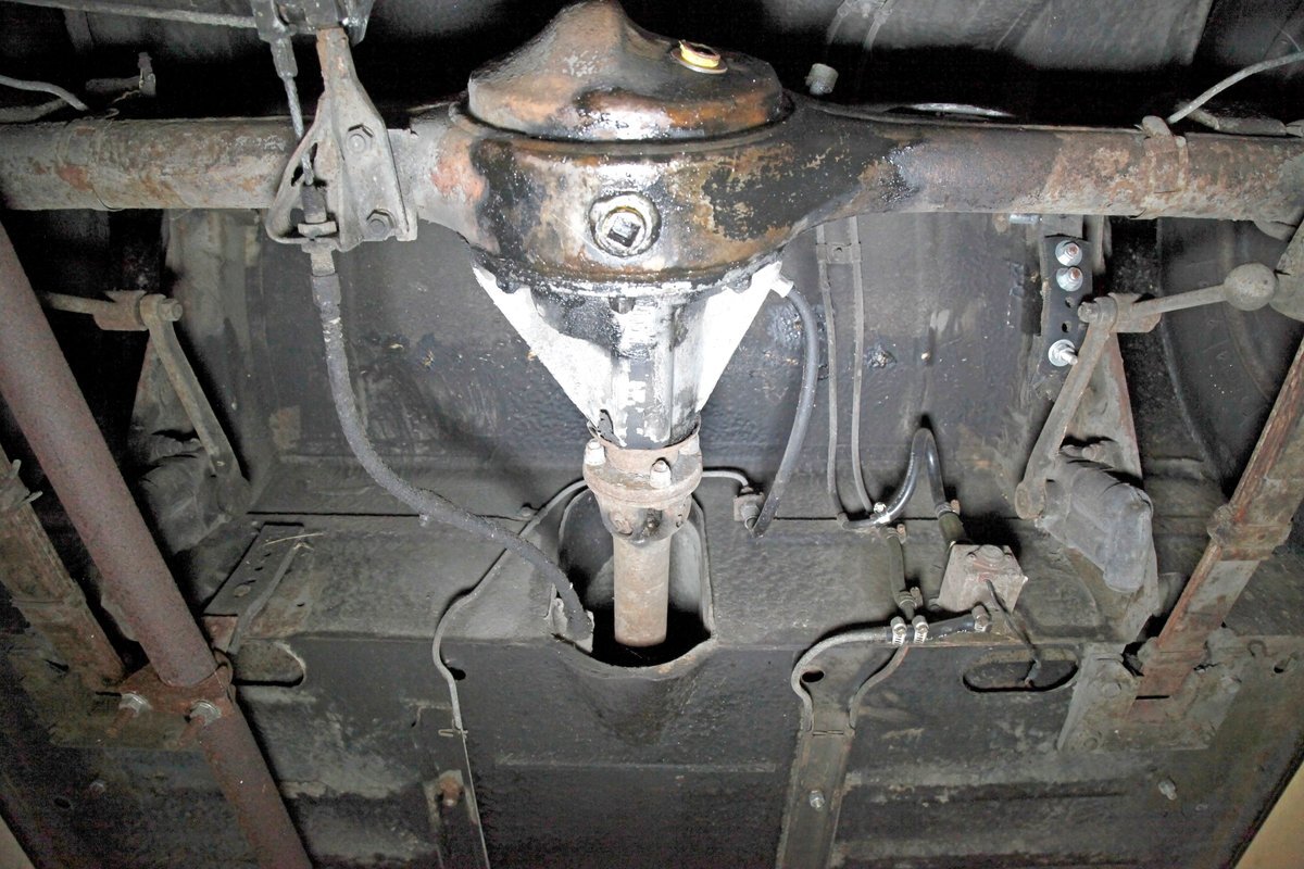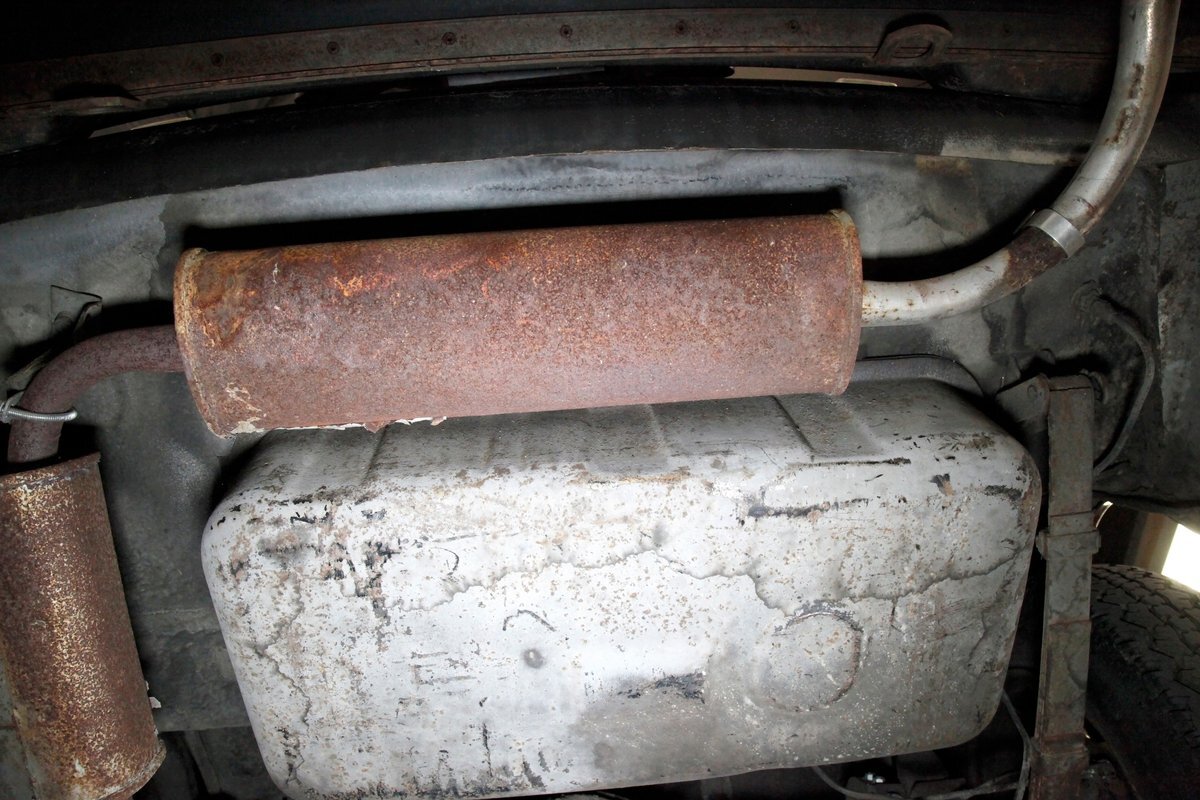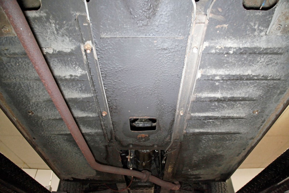 Underneath we note some surface rust, on suspension parts and the edges of the unibody where the floor pans and rockers meet. Front disc brakes are on with drums in the rear and the exhaust has a stock style muffler. Providing the sporty and surefooted ride is an independent coil spring front suspension that works with a leaf spring suspension in the rear. New fuel lines have been installed and are looking just cracking amid the patina finished undercarriage.