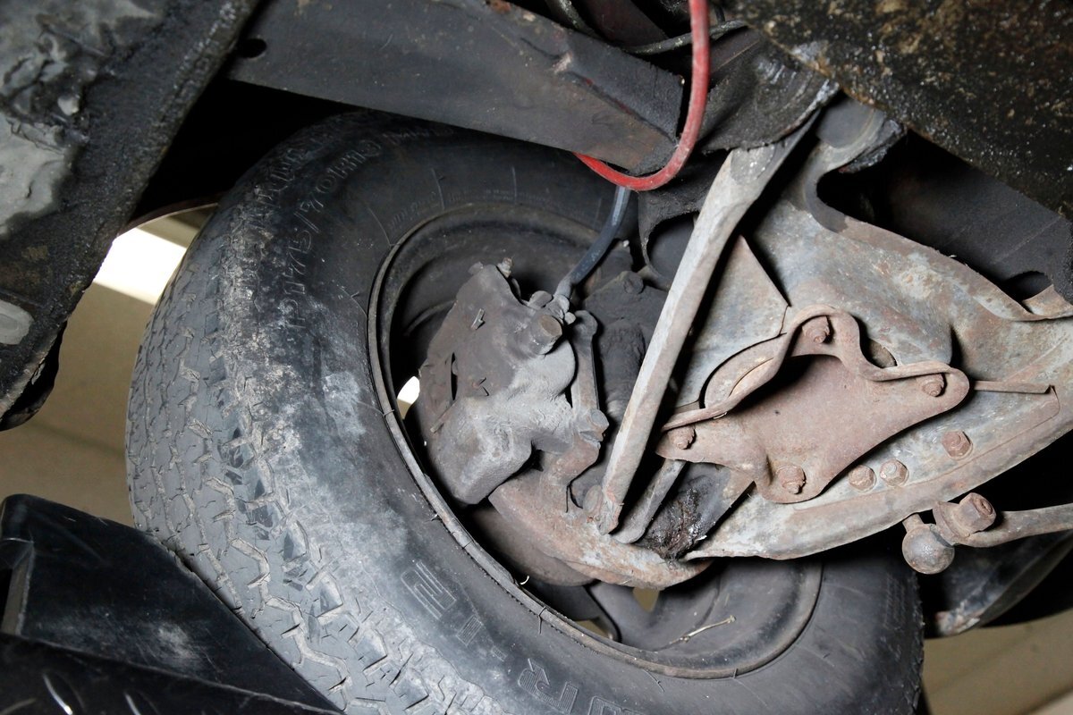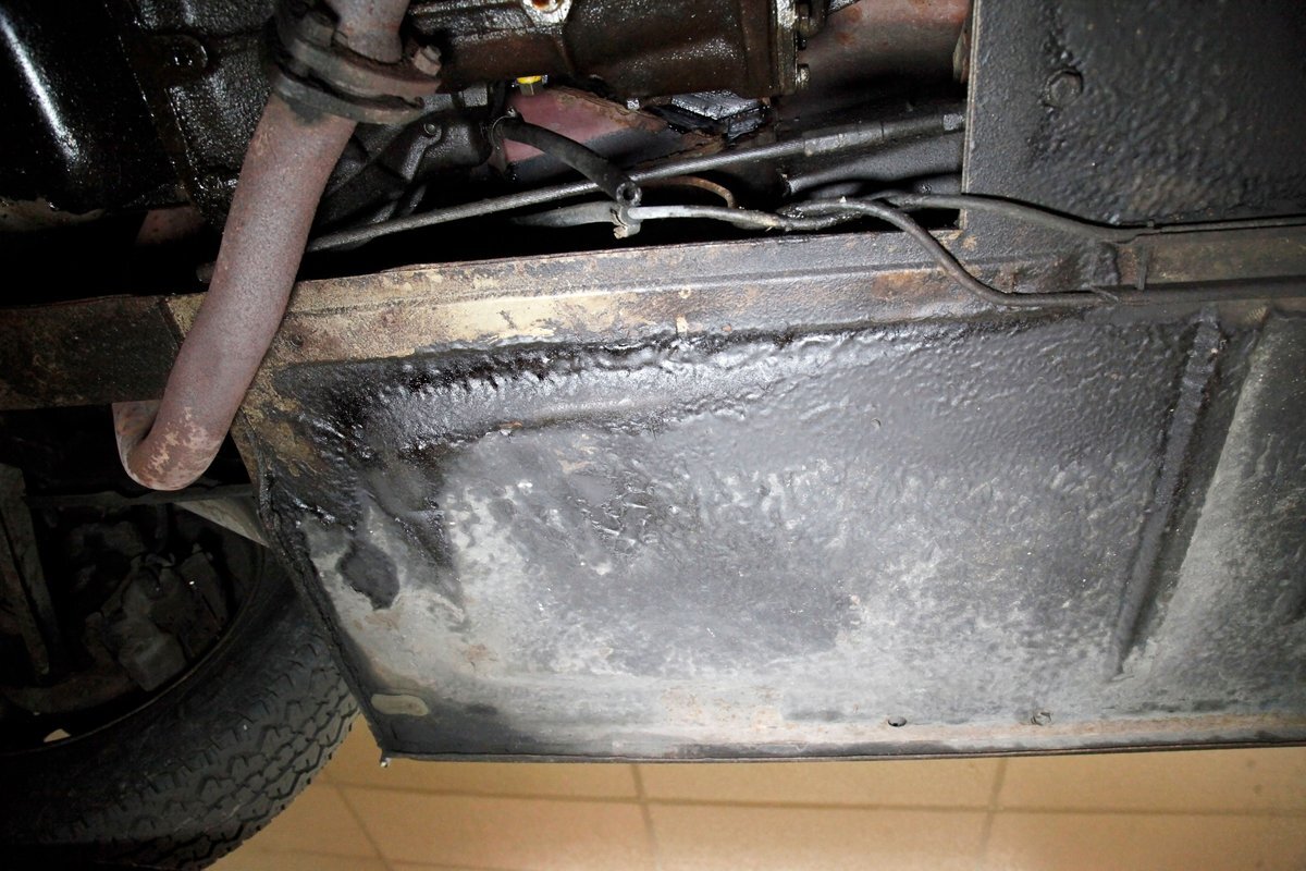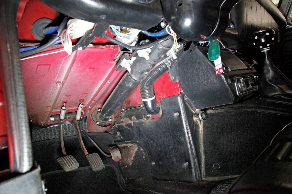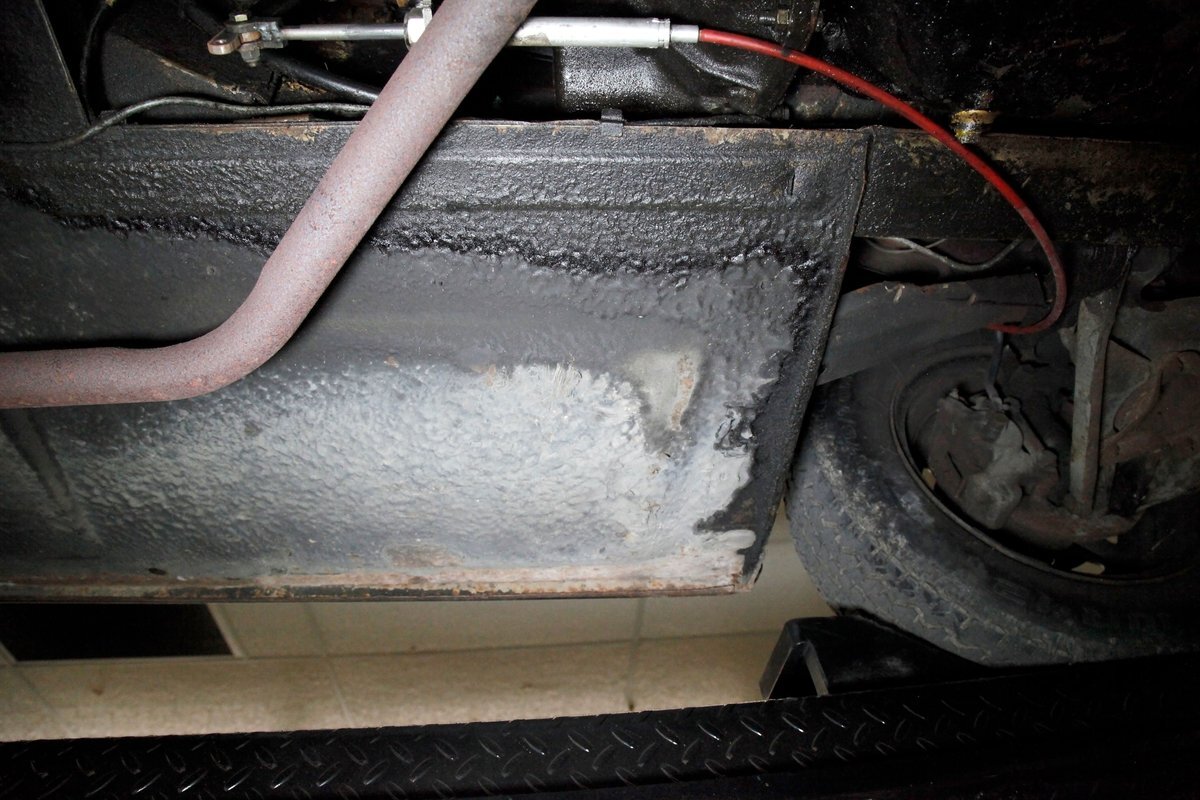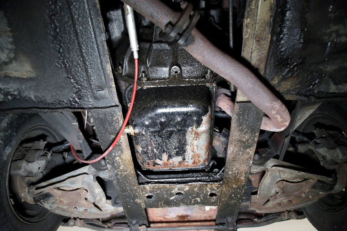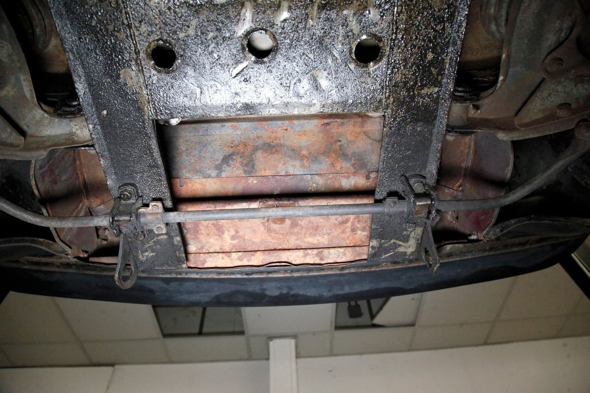 Underneath we note some surface rust, on suspension parts and the edges of the unibody where the floor pans and rockers meet. Front disc brakes are on with drums in the rear and the exhaust has a stock style muffler. Providing the sporty and surefooted ride is an independent coil spring front suspension that works with a leaf spring suspension in the rear. New fuel lines have been installed and are looking just cracking amid the patina finished undercarriage.