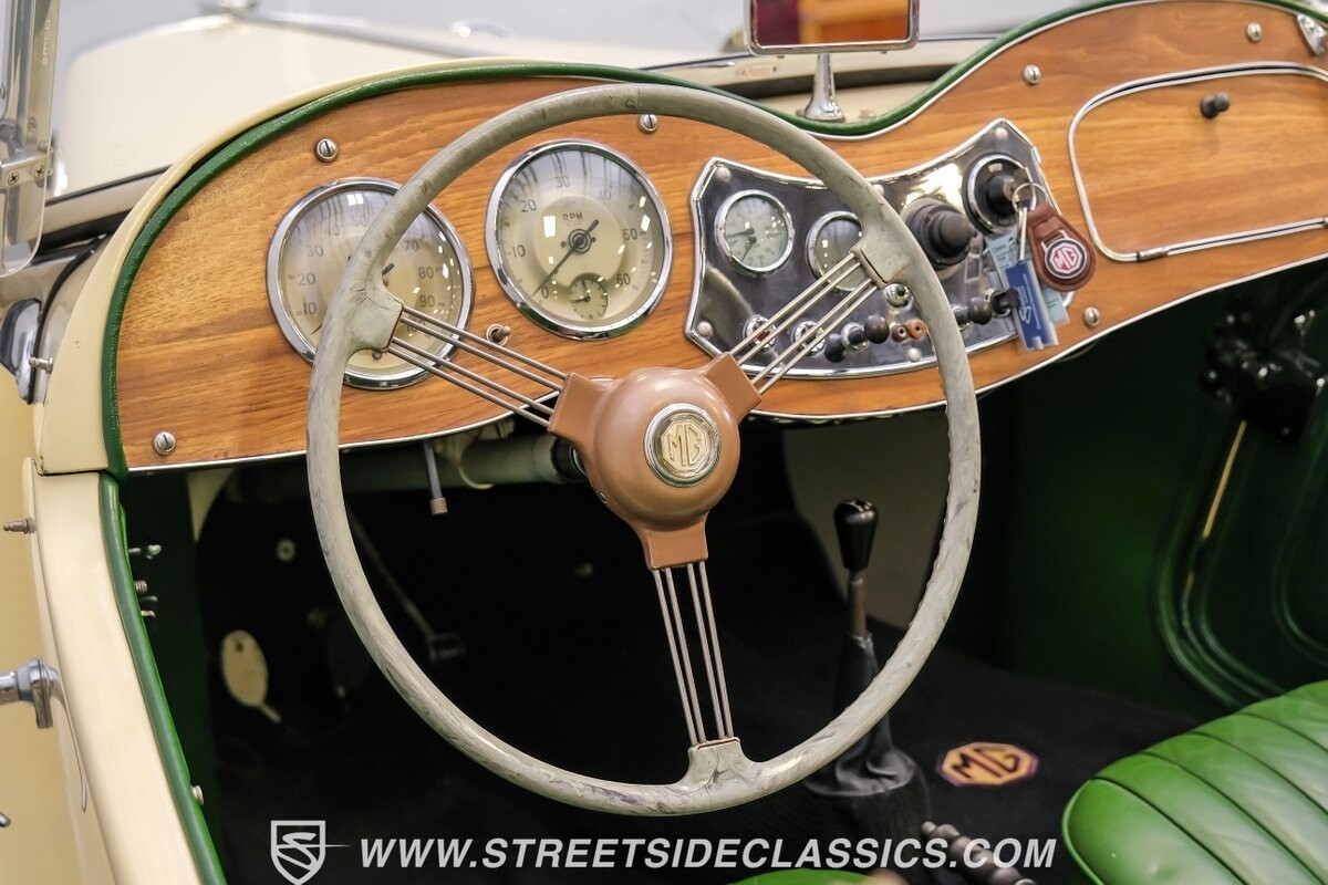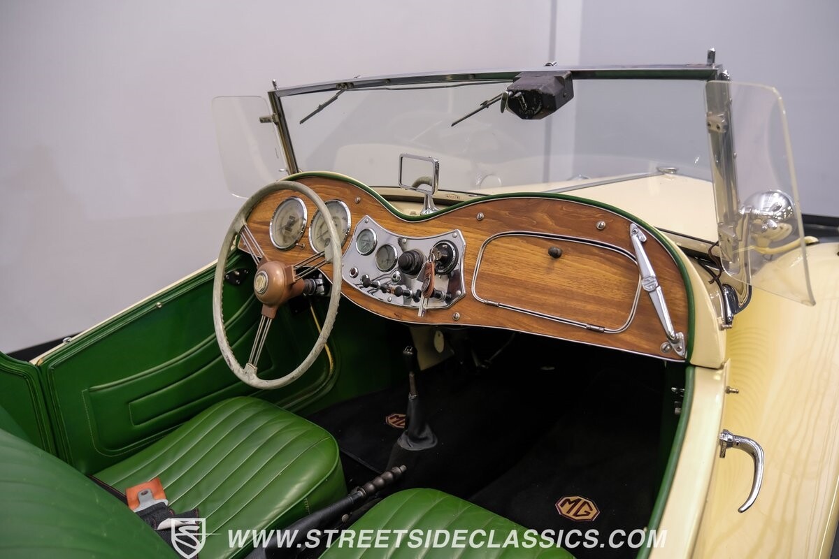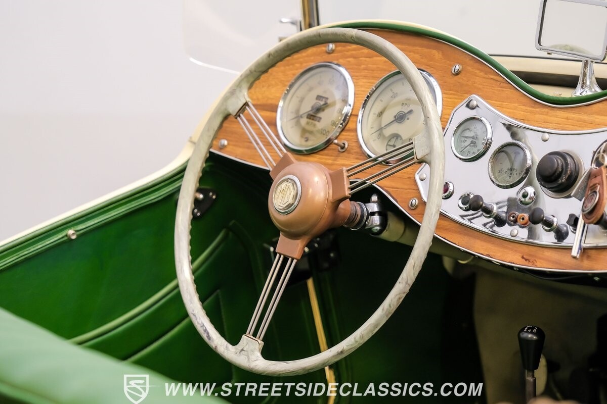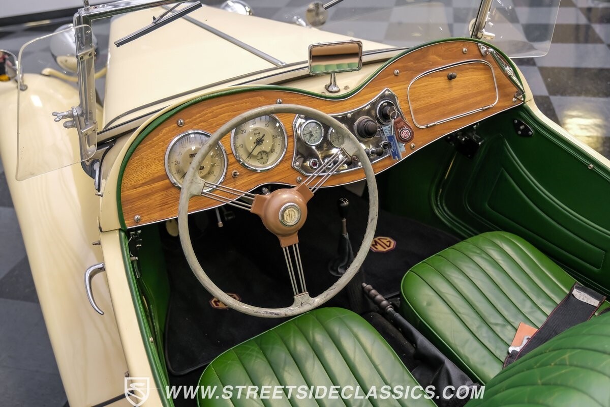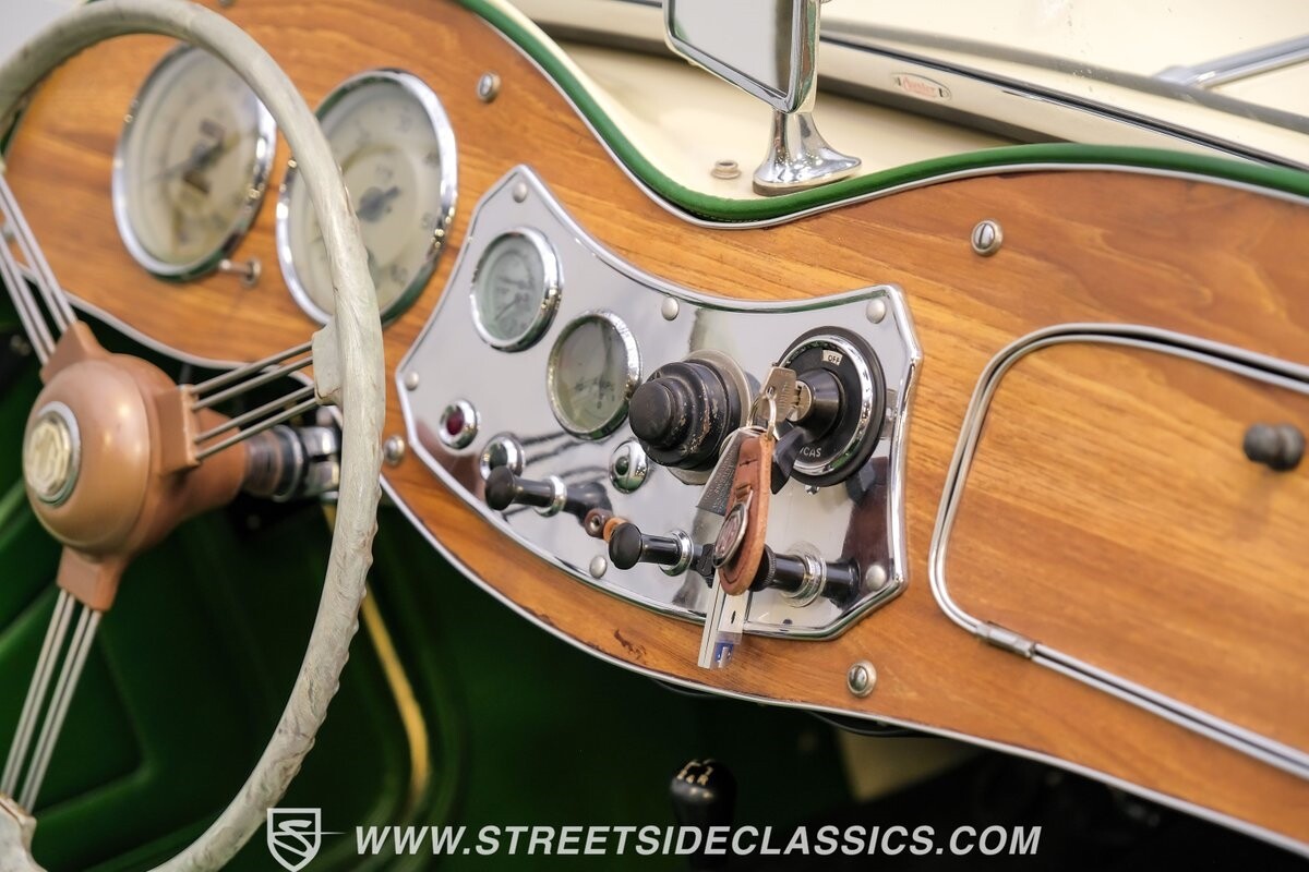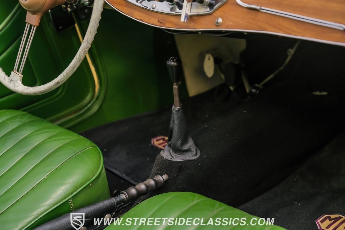 Inside, the green leather bucket seats and floor shifter invite you to partake in the visceral driving experience only a classic can offer. The dash, a real wood masterpiece housing Jaeger gauges, stands as a testament to craftsmanship and the era's luxury. Despite showing light signs of use, the interior remains a well-preserved capsule of automotive history. Every turn of the wheel and shift of the gears in this MG TD offers a tactile connection to a bygone era, free of power steering and air conditioning, focusing solely on the pure, unadulterated joy of driving.