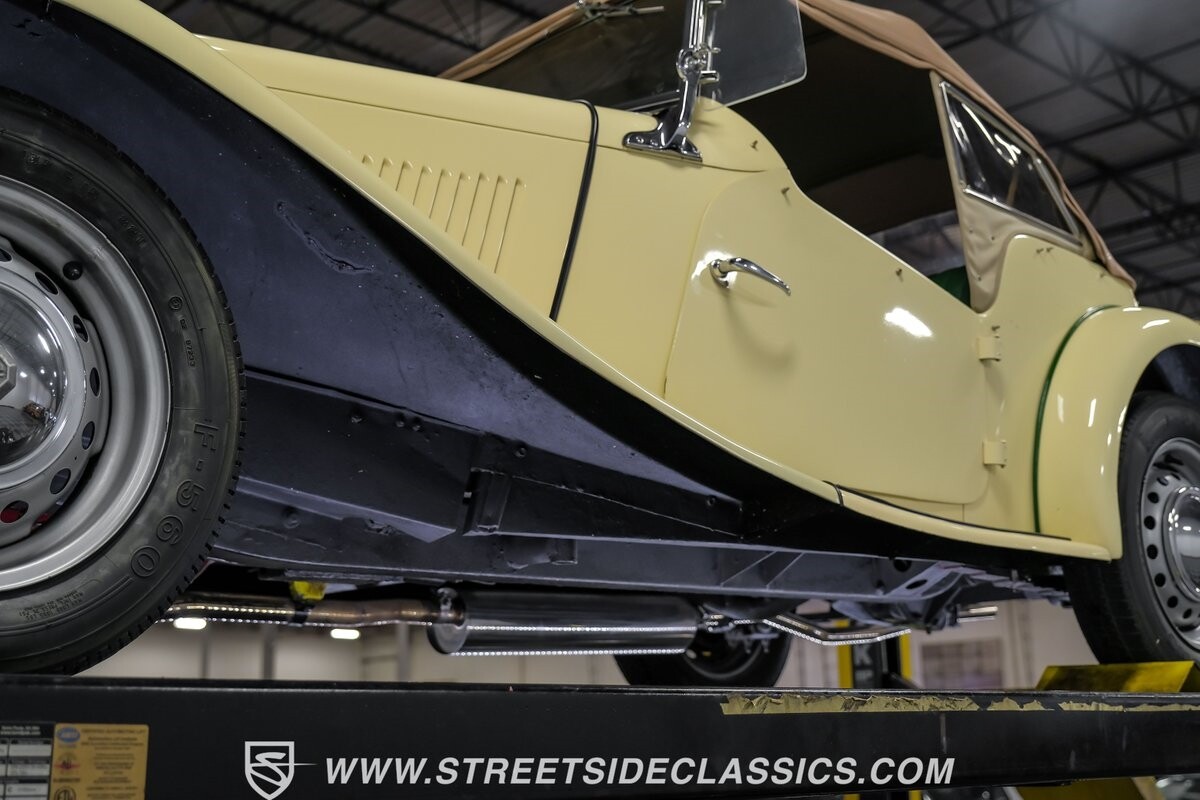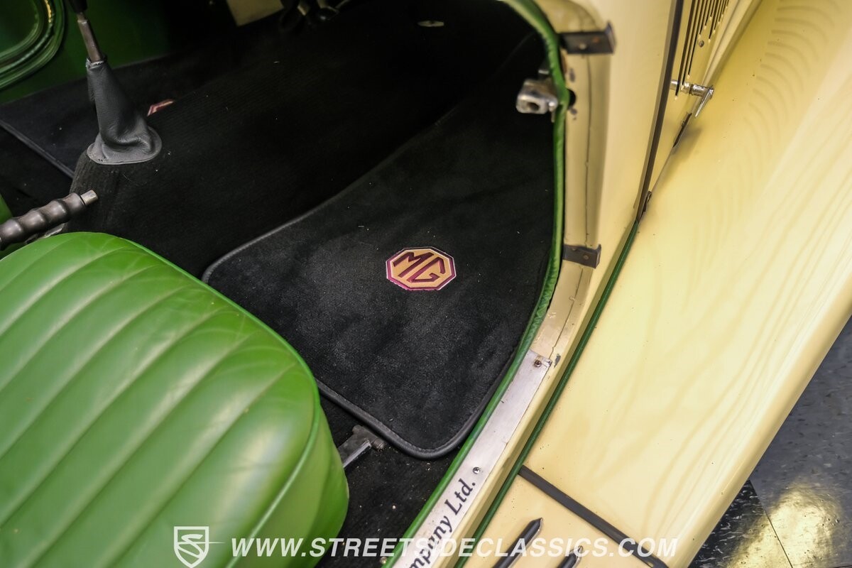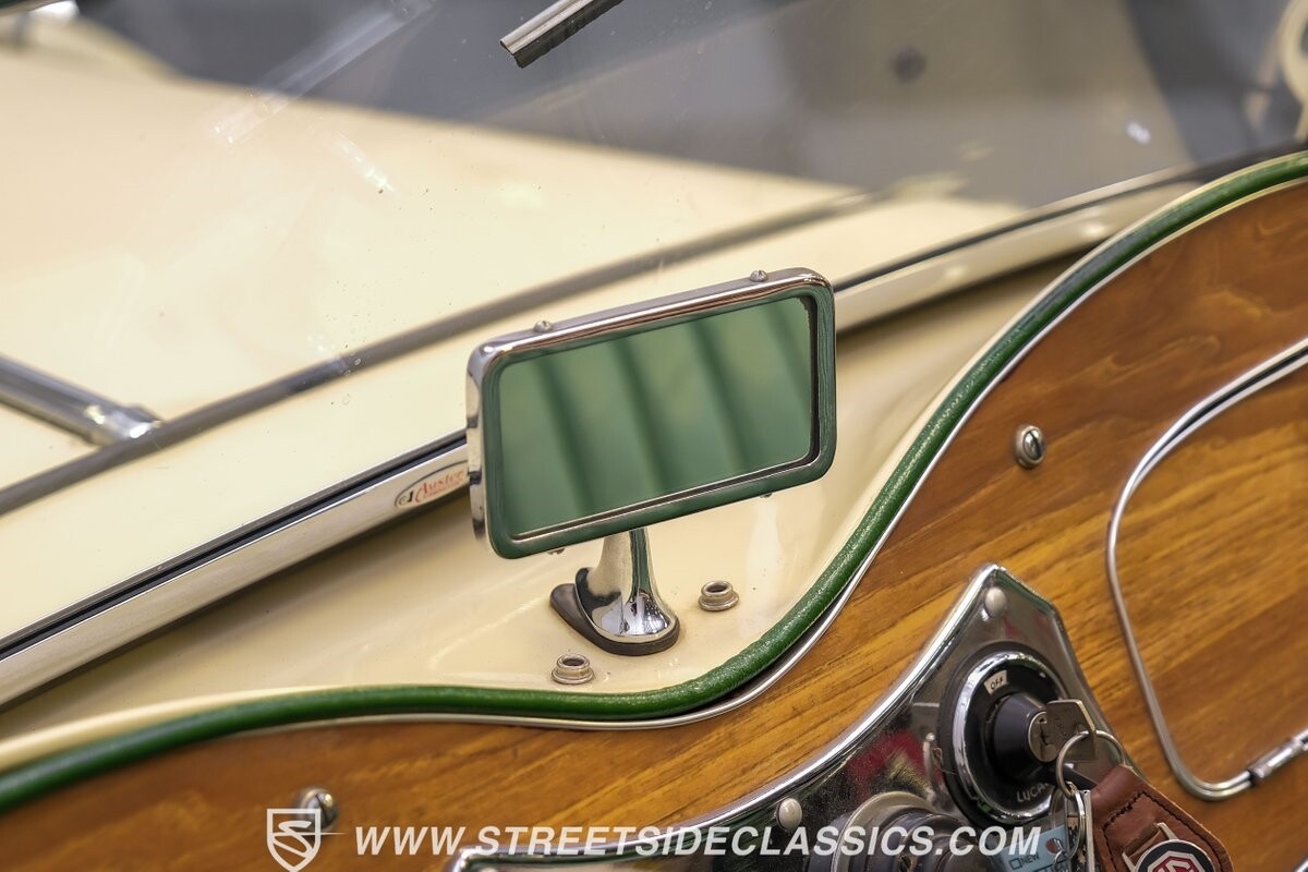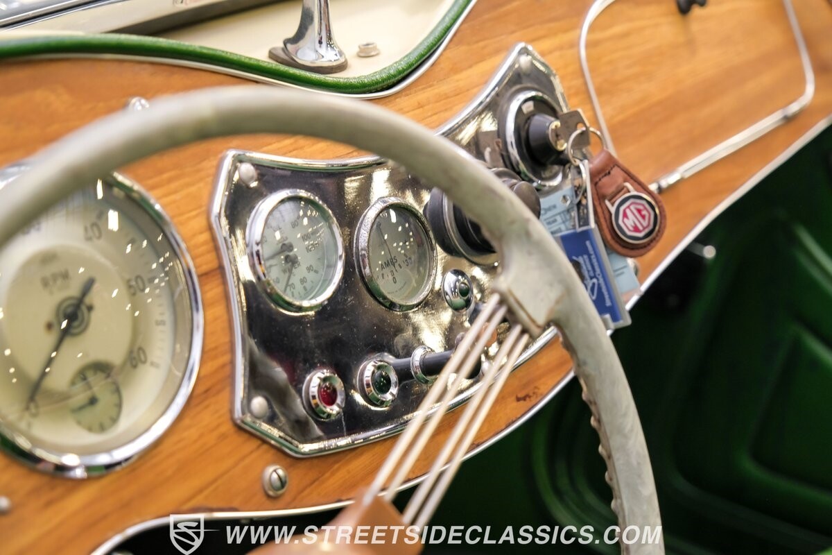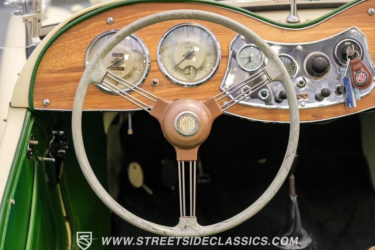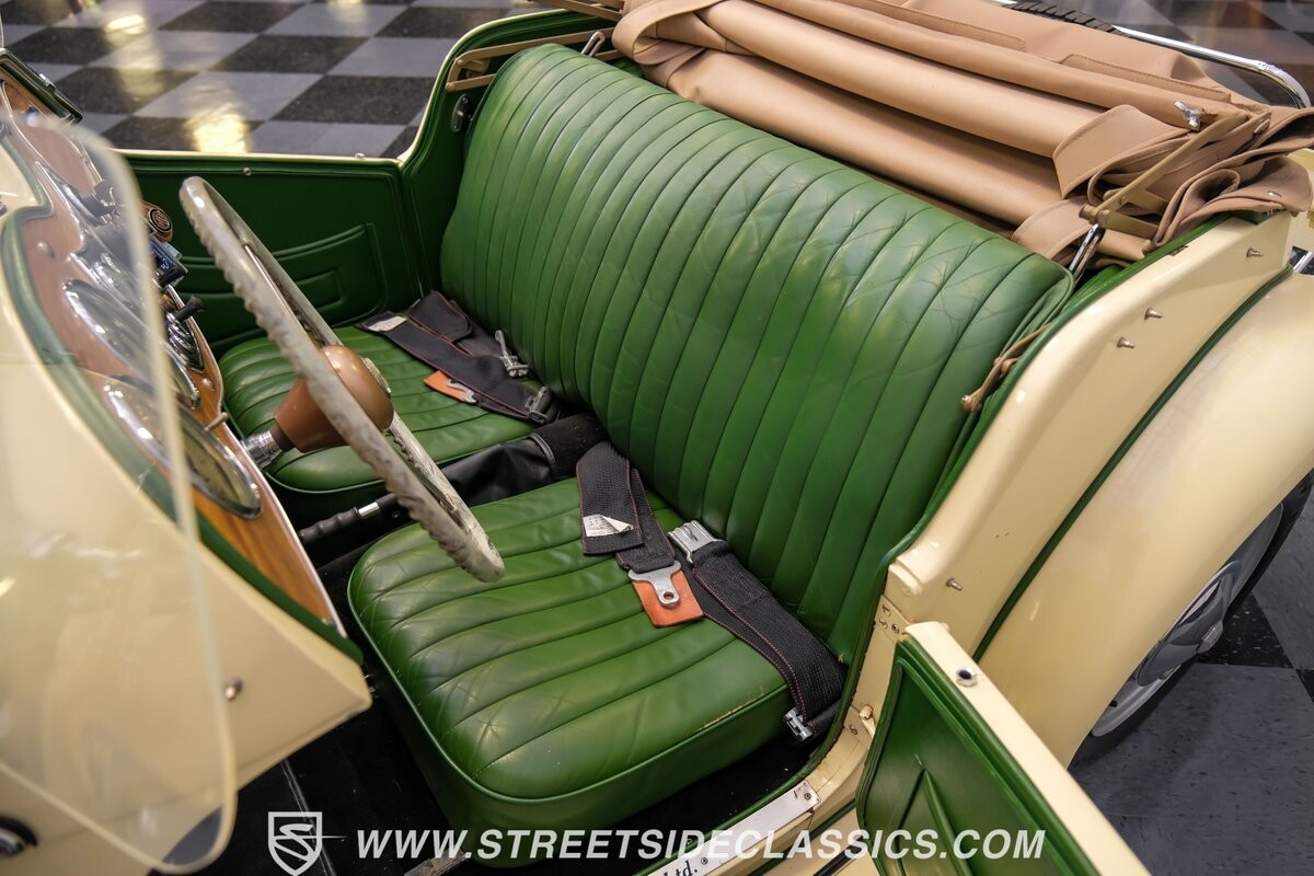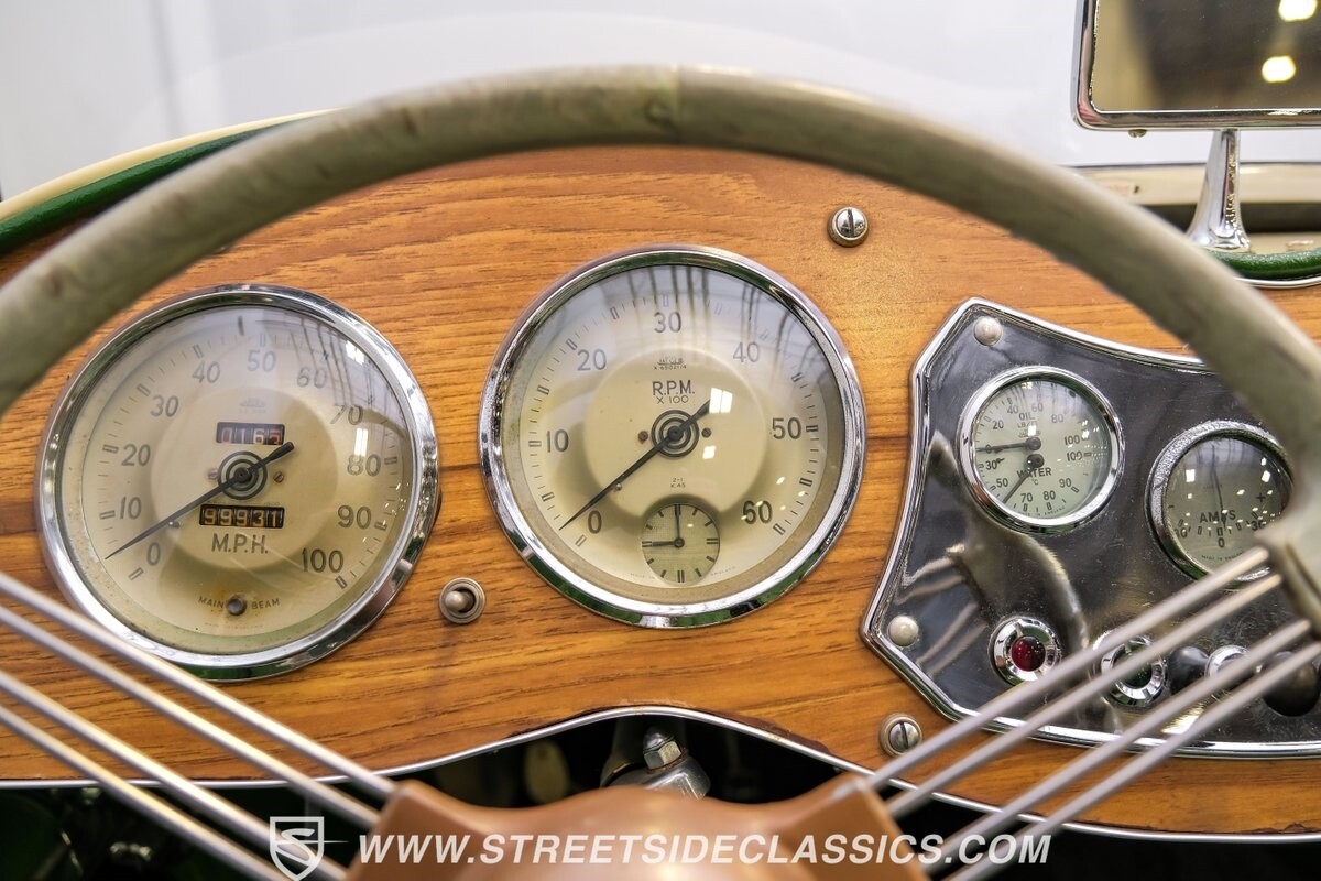 Inside, the green leather bucket seats and floor shifter invite you to partake in the visceral driving experience only a classic can offer. The dash, a real wood masterpiece housing Jaeger gauges, stands as a testament to craftsmanship and the era's luxury. Despite showing light signs of use, the interior remains a well-preserved capsule of automotive history. Every turn of the wheel and shift of the gears in this MG TD offers a tactile connection to a bygone era, free of power steering and air conditioning, focusing solely on the pure, unadulterated joy of driving.