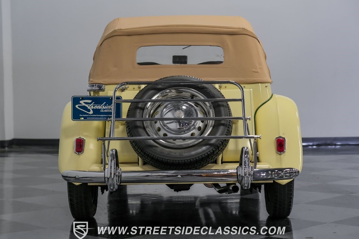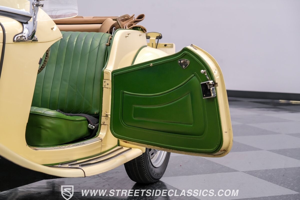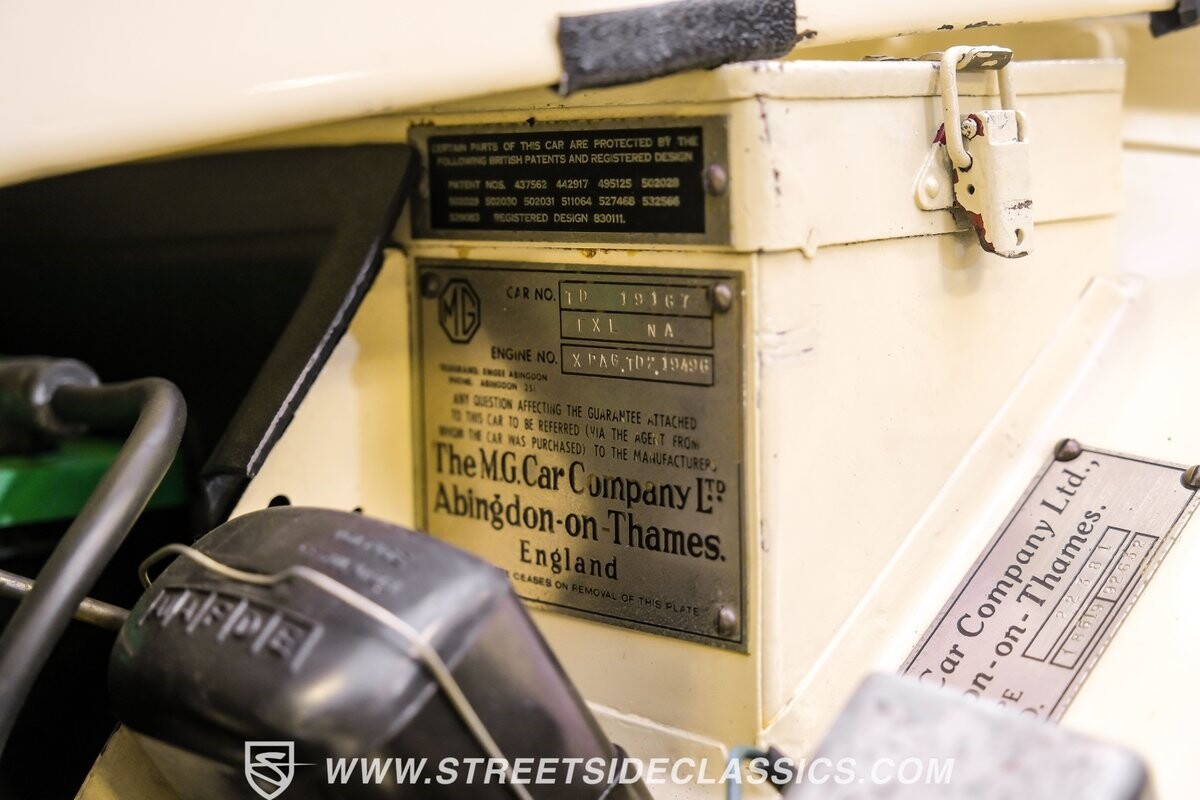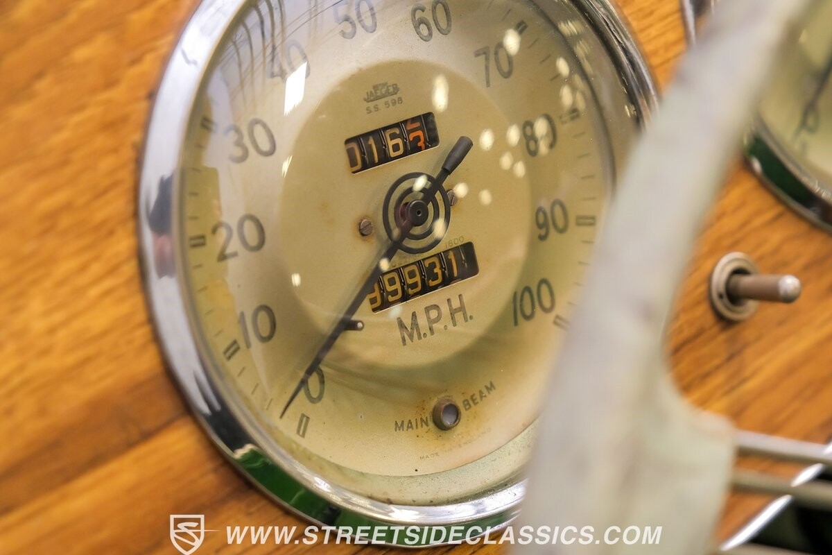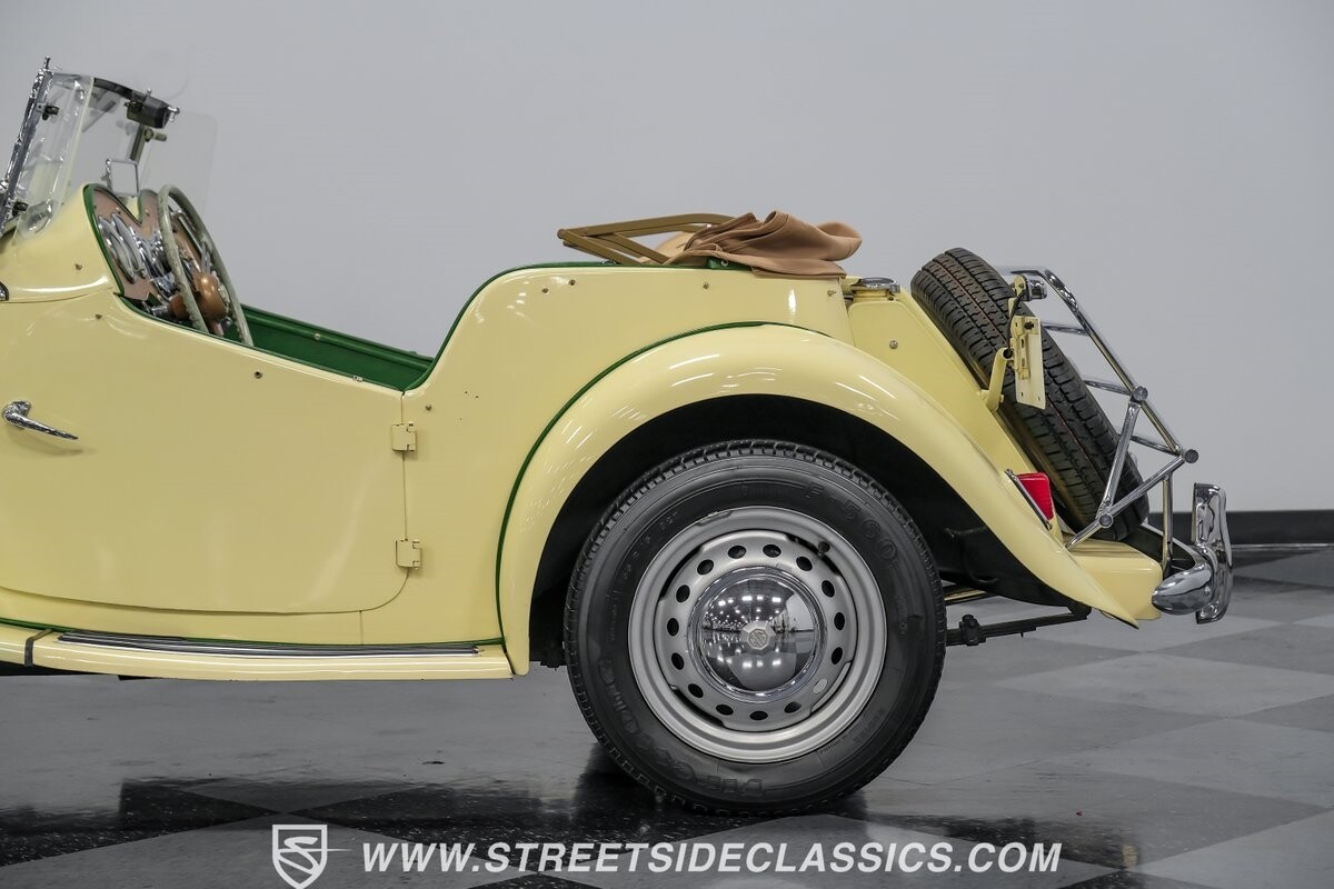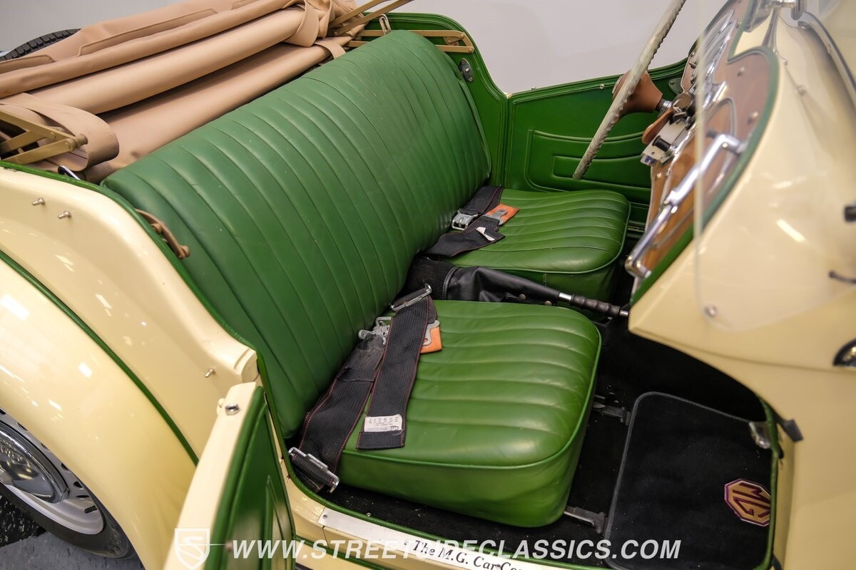 Inside, the green leather bucket seats and floor shifter invite you to partake in the visceral driving experience only a classic can offer. The dash, a real wood masterpiece housing Jaeger gauges, stands as a testament to craftsmanship and the era's luxury. Despite showing light signs of use, the interior remains a well-preserved capsule of automotive history. Every turn of the wheel and shift of the gears in this MG TD offers a tactile connection to a bygone era, free of power steering and air conditioning, focusing solely on the pure, unadulterated joy of driving.