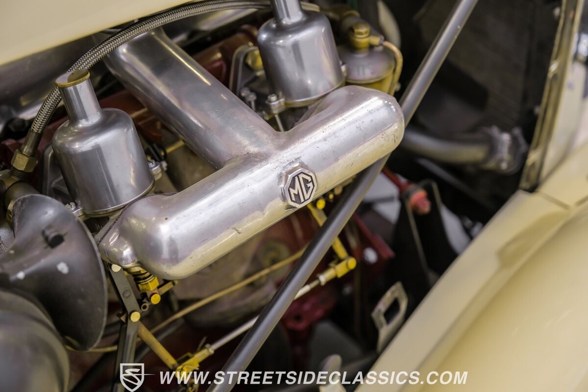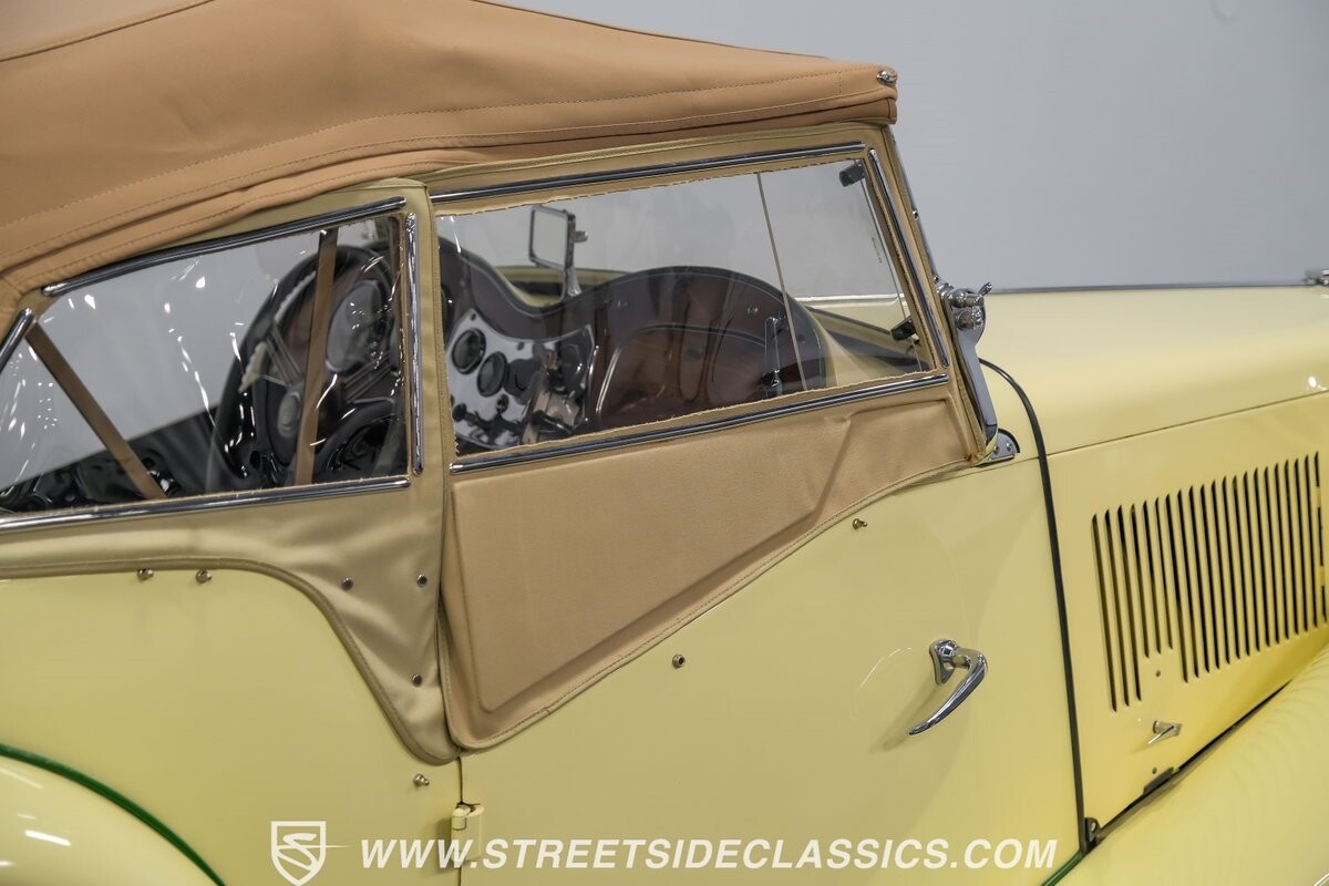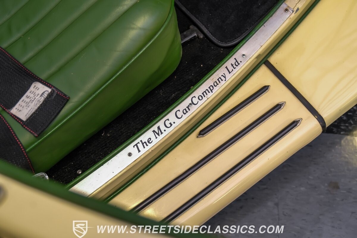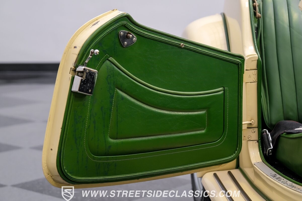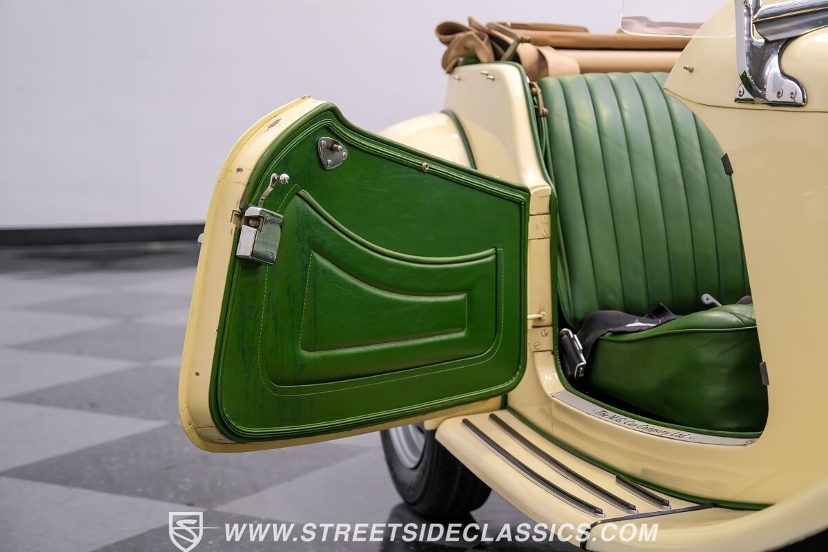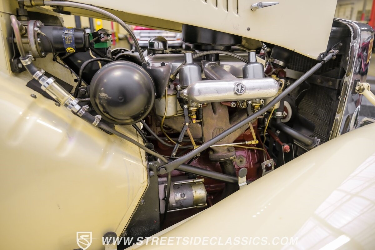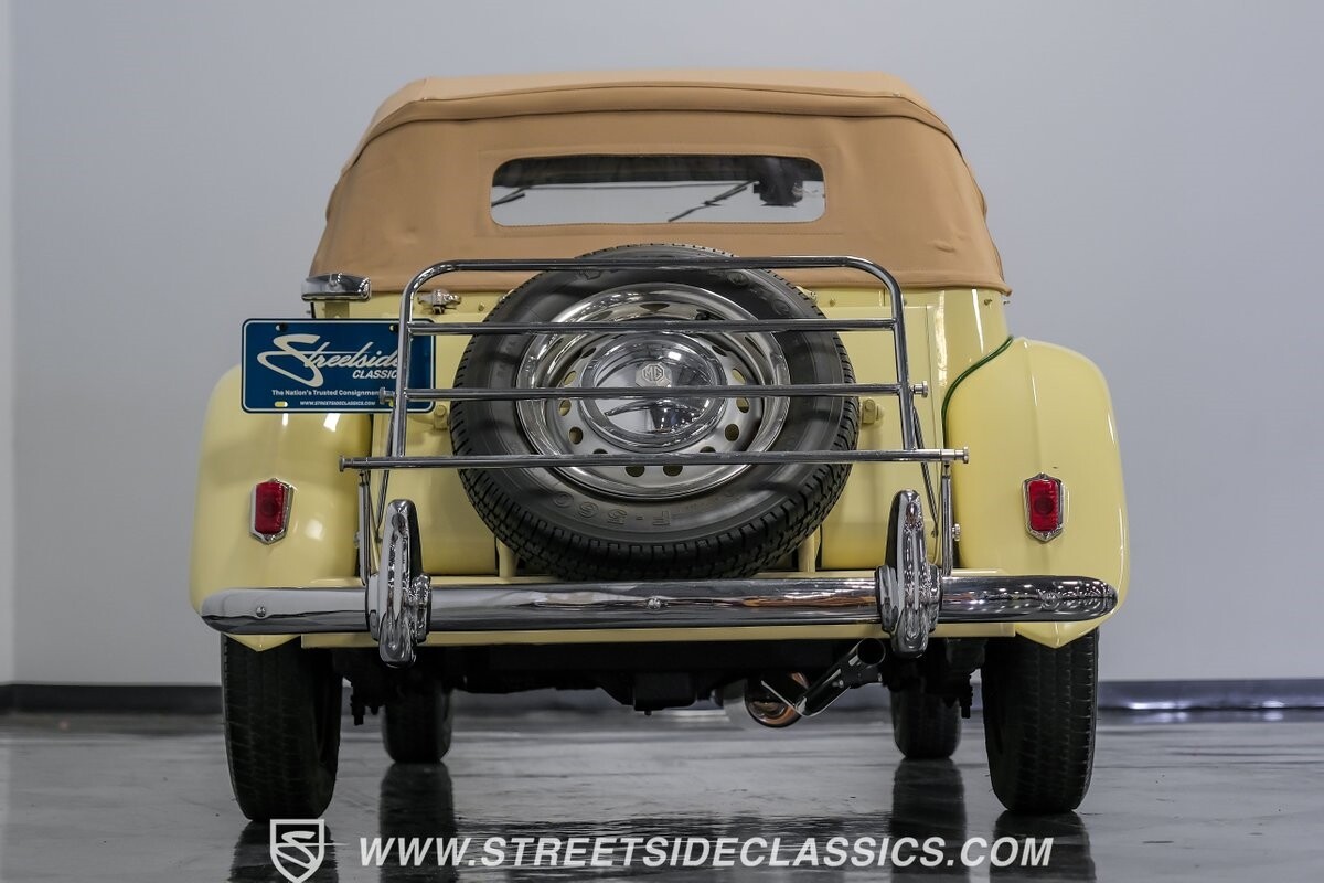 Inside, the green leather bucket seats and floor shifter invite you to partake in the visceral driving experience only a classic can offer. The dash, a real wood masterpiece housing Jaeger gauges, stands as a testament to craftsmanship and the era's luxury. Despite showing light signs of use, the interior remains a well-preserved capsule of automotive history. Every turn of the wheel and shift of the gears in this MG TD offers a tactile connection to a bygone era, free of power steering and air conditioning, focusing solely on the pure, unadulterated joy of driving.