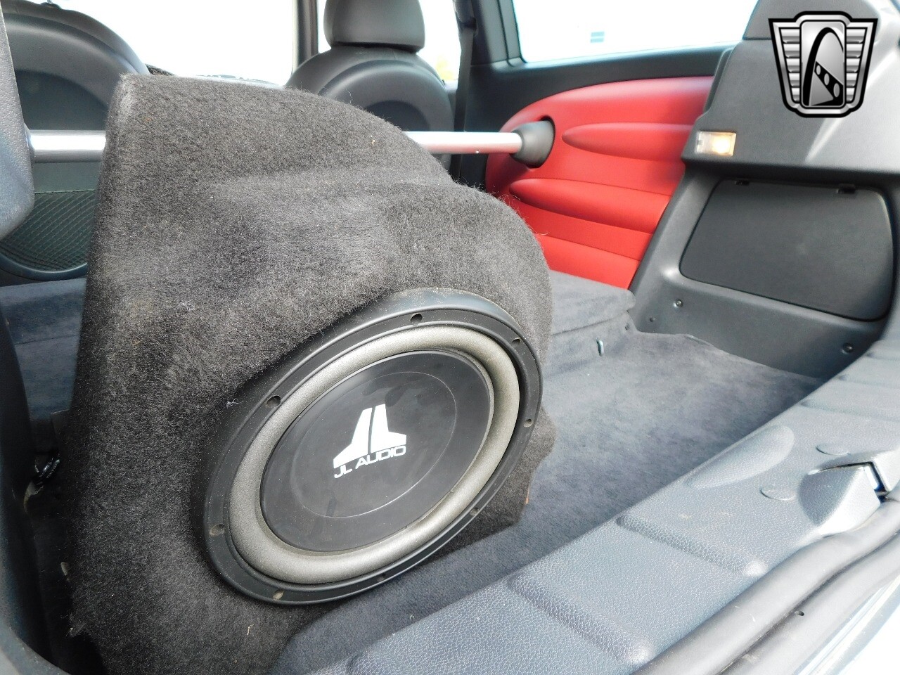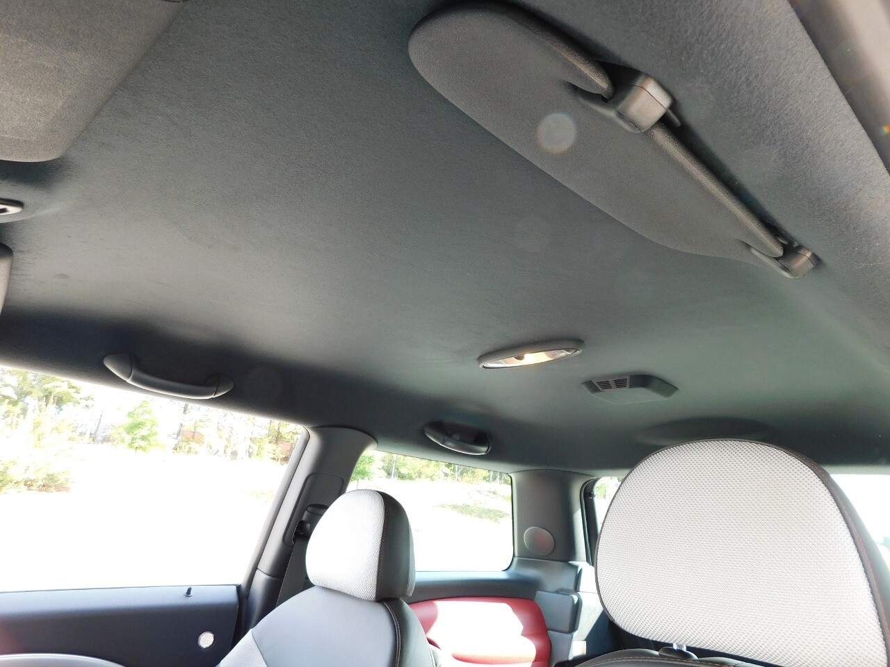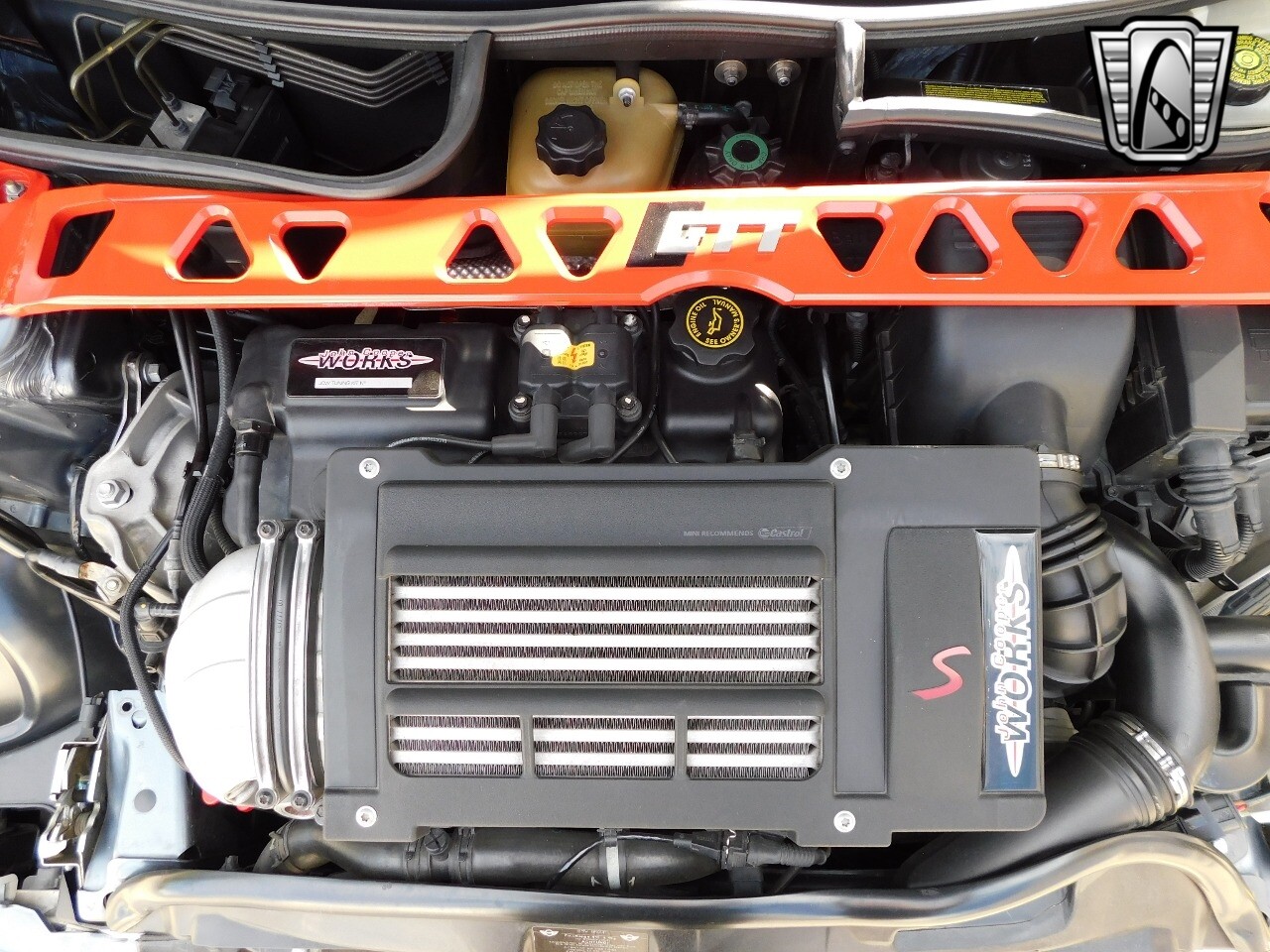 Features include a JCW aero kit, carbon fiber rear spoiler, sport tuned suspension, aluminum trailing arms, 18" wheels, unique exterior badging, an increased capacity intercooler and paint protection film. Modifications include a Tarett Engineering adjustable sway bar, additional suspension bracing, Ireland Engineering fixed camber plates, an ATI Performance crank pulley, and a Helix Motorsports short shift kit, strut tower brace from GT Tuning. Other modifications include a JCW Alcantara wrapped steering wheel, aftermarket pedals, an Ian Cull auto up window circuit. The aftermarket sound system is a Kenwood DVD head unit, Audison and JL amplifiers, Focal speakers and a JL Audio Stealthbox subwoofer.