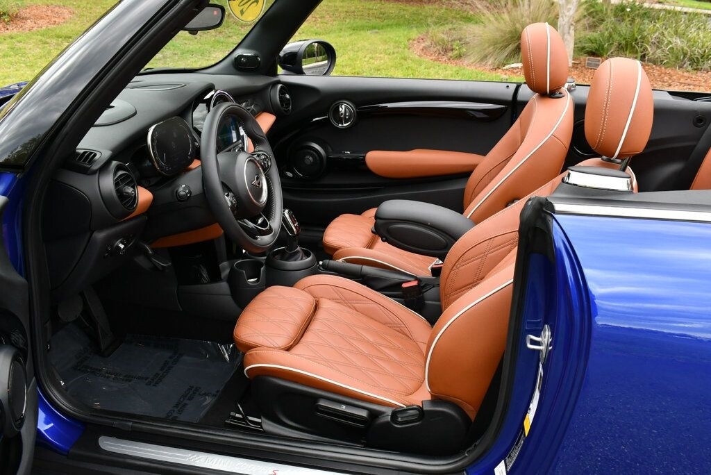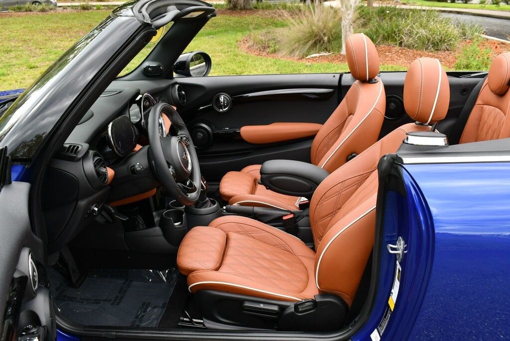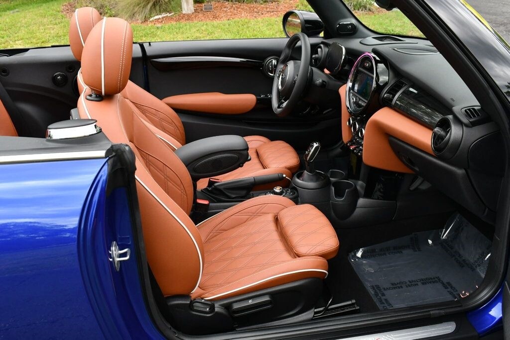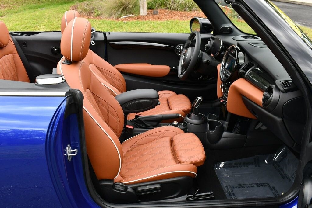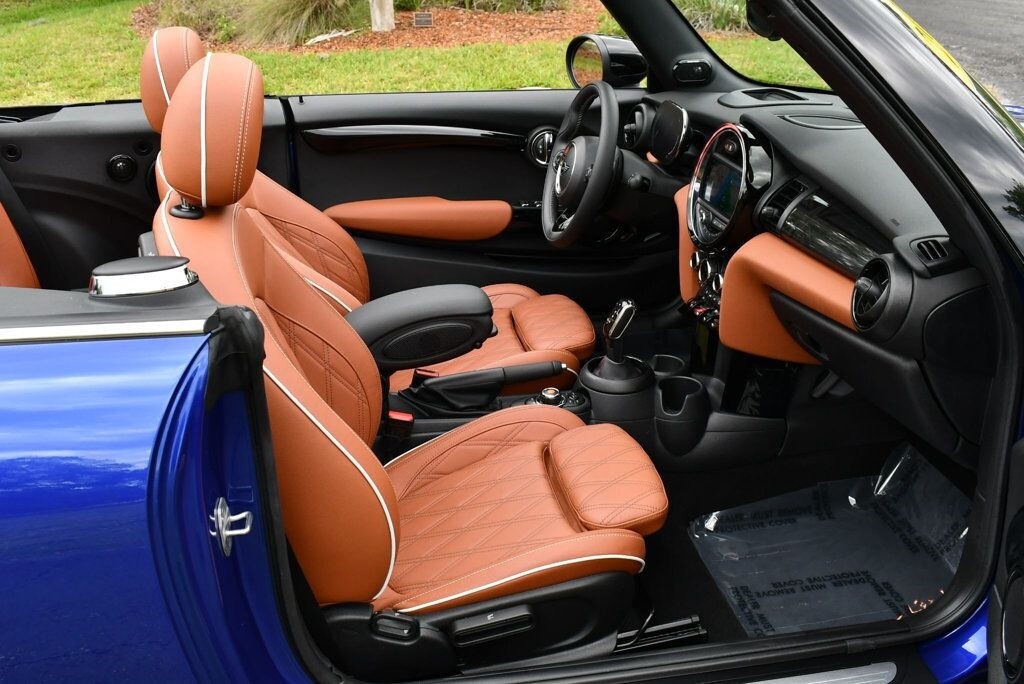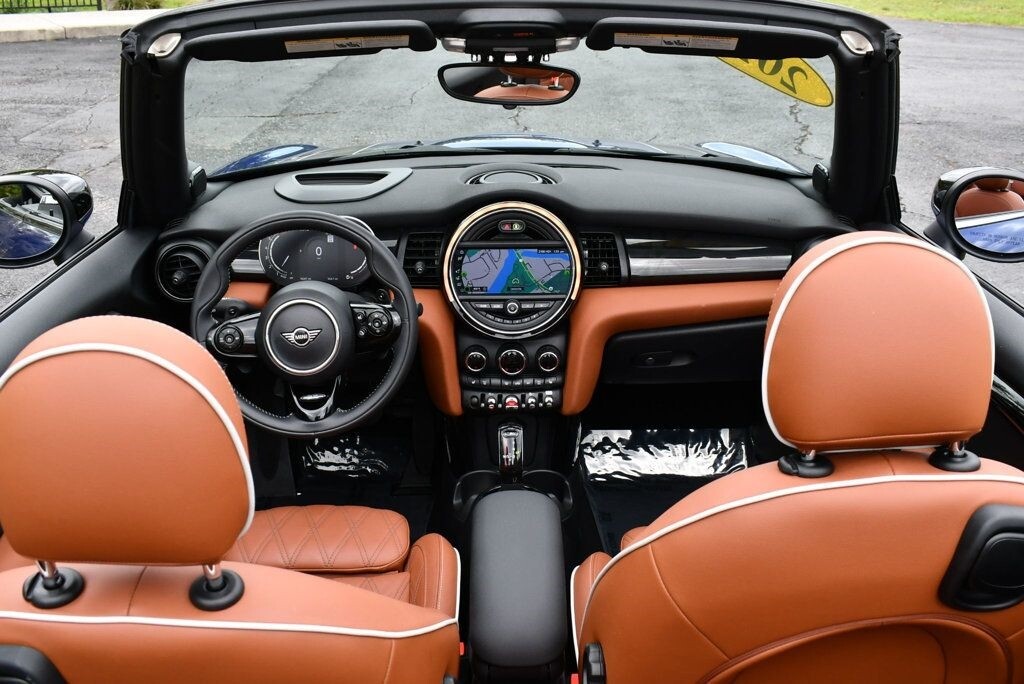 This 2021 MINI Cooper S Convertible 2dr with Iconic Trim Package and Touch Screen Navigation features a 2.0L 4 CYLINDER 4cyl Gasoline engine. It is equipped with a 7 Speed Automatic transmission. The vehicle is Starlight Blue Metallic with a Malt Brown Leather interior. It is offered with the remaining factory warranty. - Air Conditioning, Climate Control, Dual Zone Climate Control, Cruise Control, Power Steering, Power Windows, Power Door Locks, Power Mirrors, Leather Steering Wheel, Clock, Tachometer, Digital Info Center, Tilt Steering Wheel, Telescoping Steering Wheel, Steering Wheel Radio Controls, Sunroof, Moonroof, Driver Airbag, Passenger Airbag, Side Airbags, Keyless Entry, Rear Defogger, Fog Lights, Intermittent Wipers, AM/FM, Leather Interior Surface, Apple CarPlay, Aux. Audio Input, Bluetooth, Carbon Fiber Trim, Center Arm Rest, Daytime Running Lights, Front Heated Seats, Heads Up Display, Heated Mirrors, Navigation System, Overhead Console, Parking Sensors, Power Brakes, Premium Alloy Wheels, Premium Sound, Rain Sensing Wipers, Rear Fog Lamps, Reverse Camera, Roll Stability Control, Sport Seats, Tire Pressure Monitor, Vanity Mirrors -