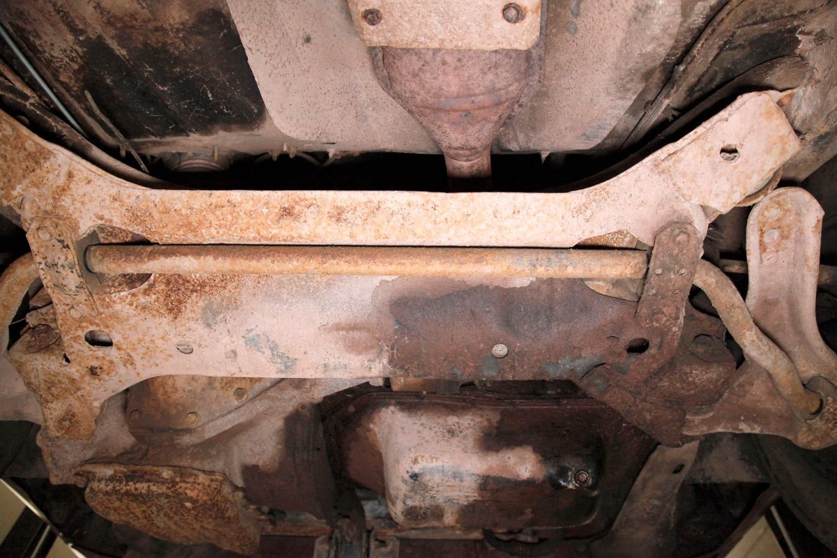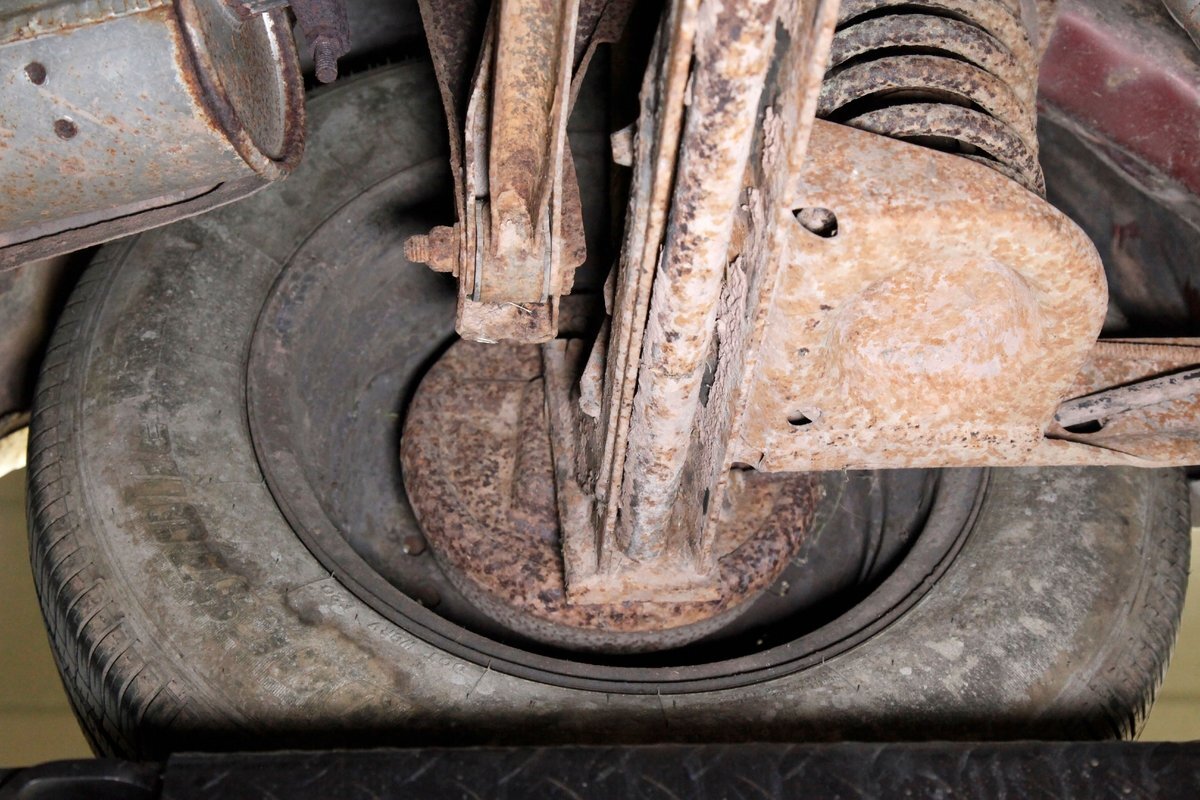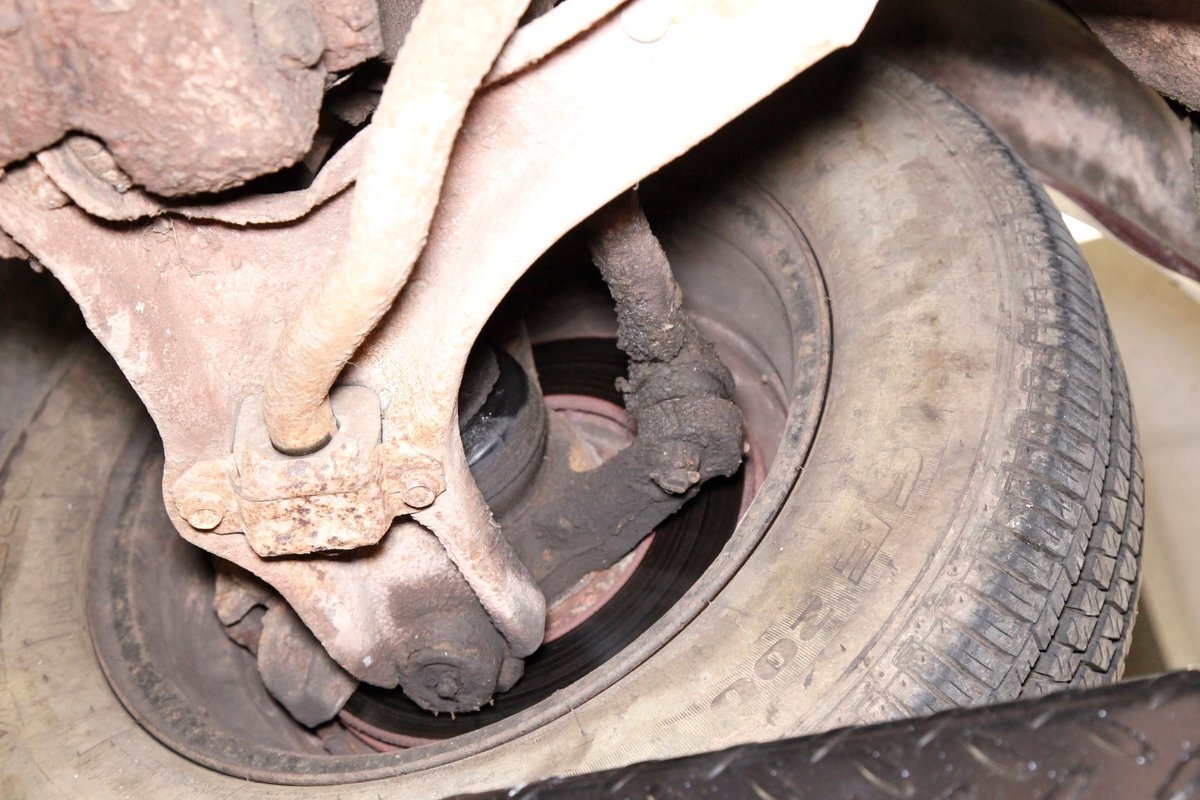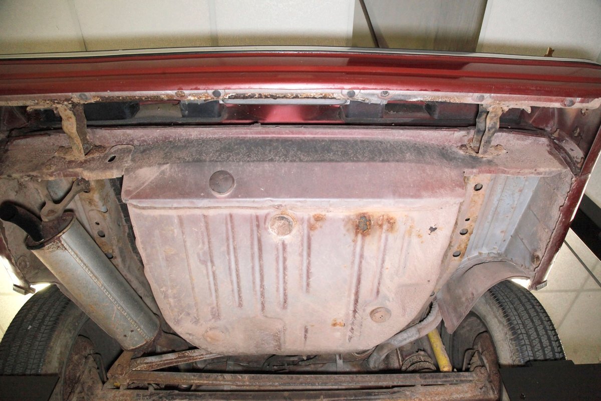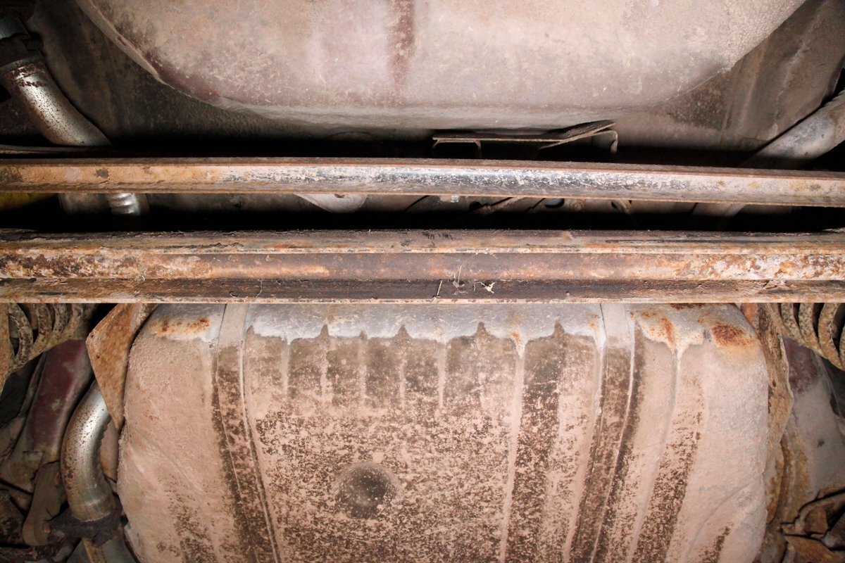Plenty of aged patina, and some surface rust cover all the undercarriage surfaces. Heavy surface rust is on springs, gas tank and brake housings as well as suspension parts. Speaking of which includes independent Macpherson struts for the front, and coil springs for the back. Power disc braking is on front, and power drums are on the back.