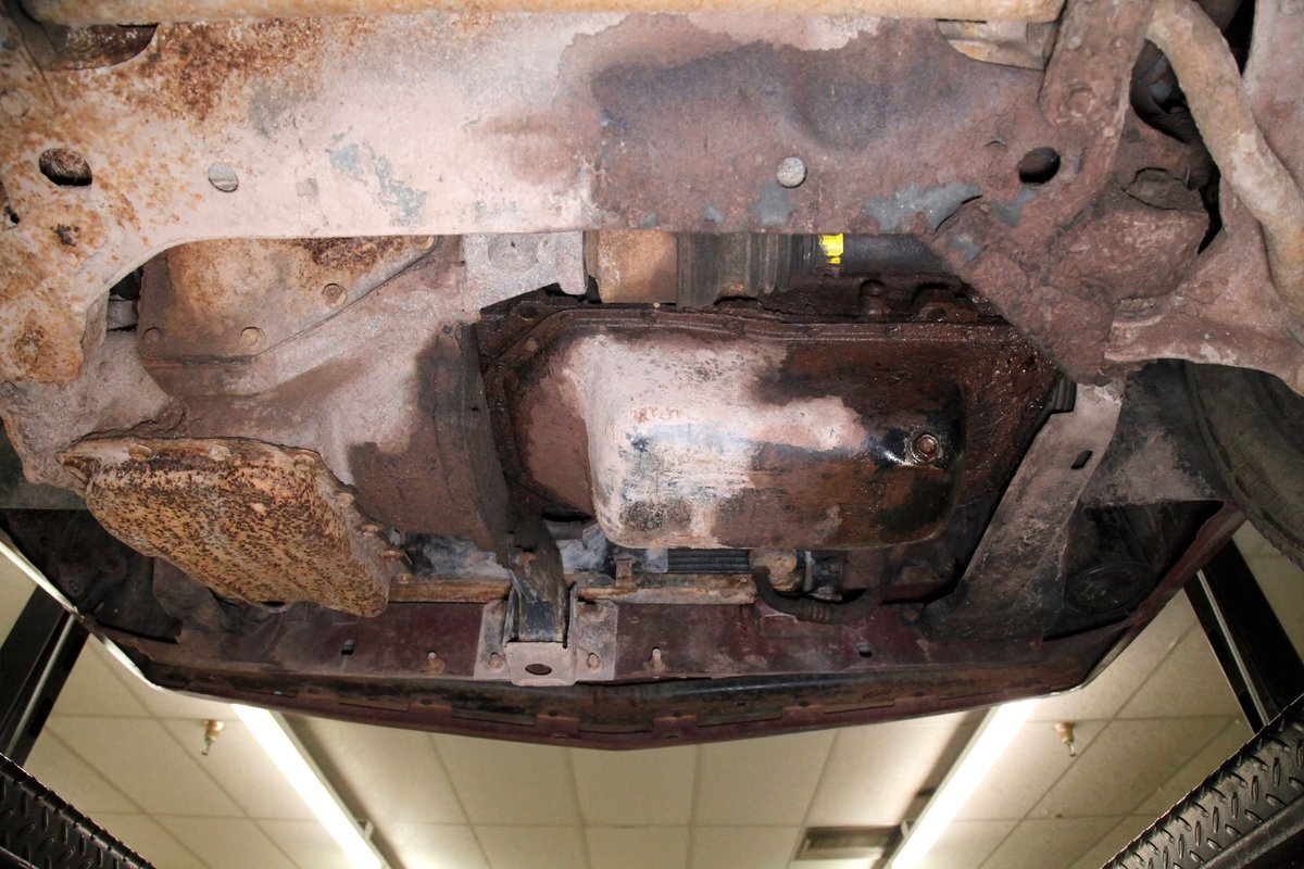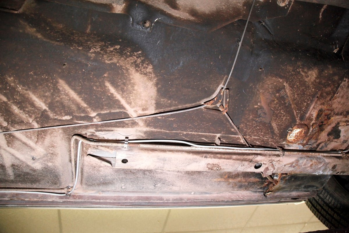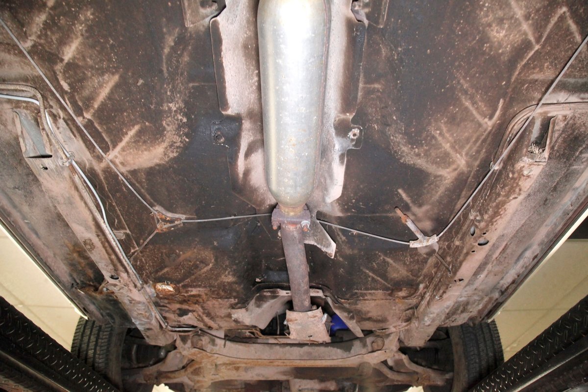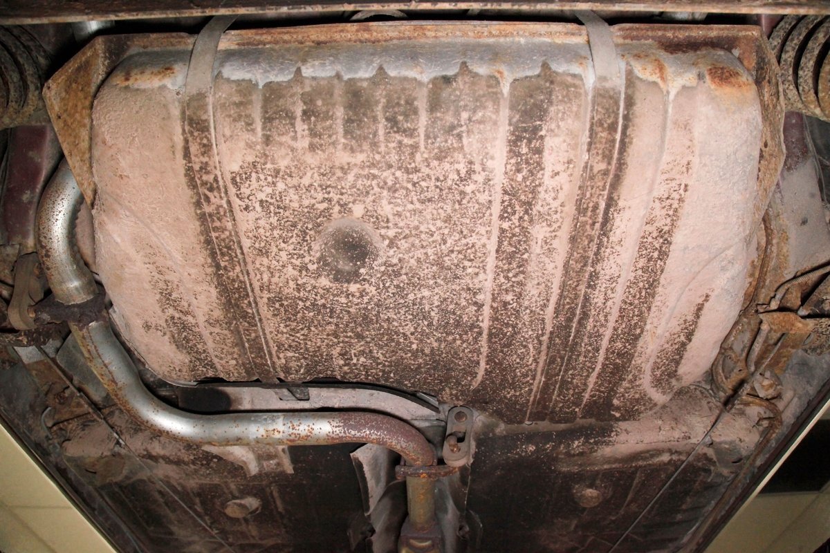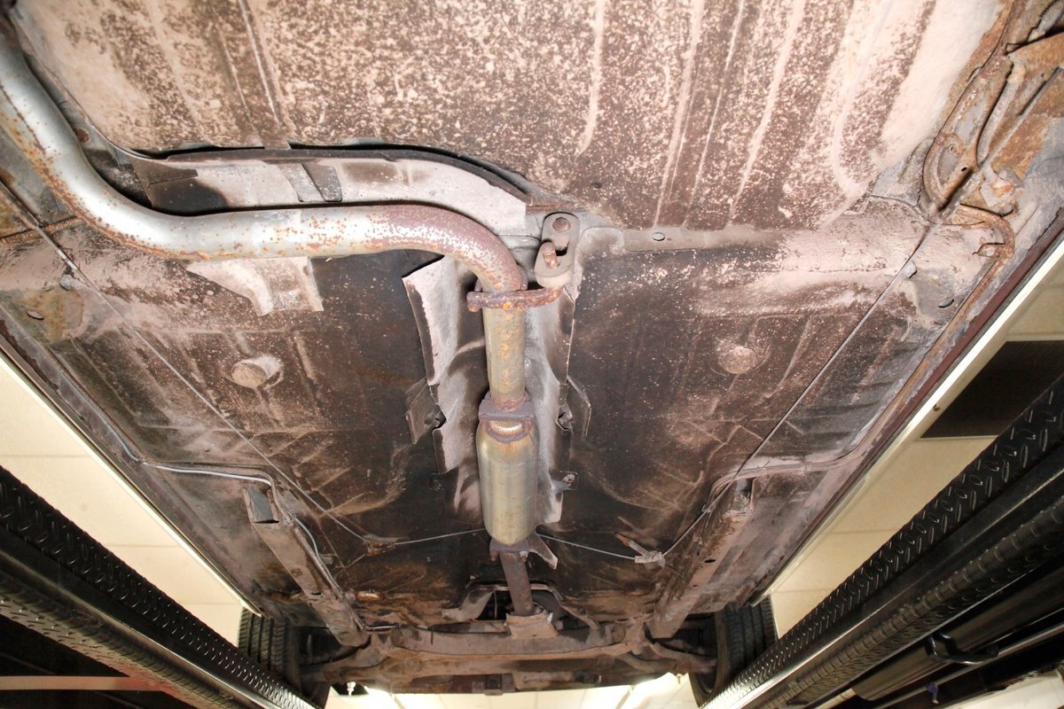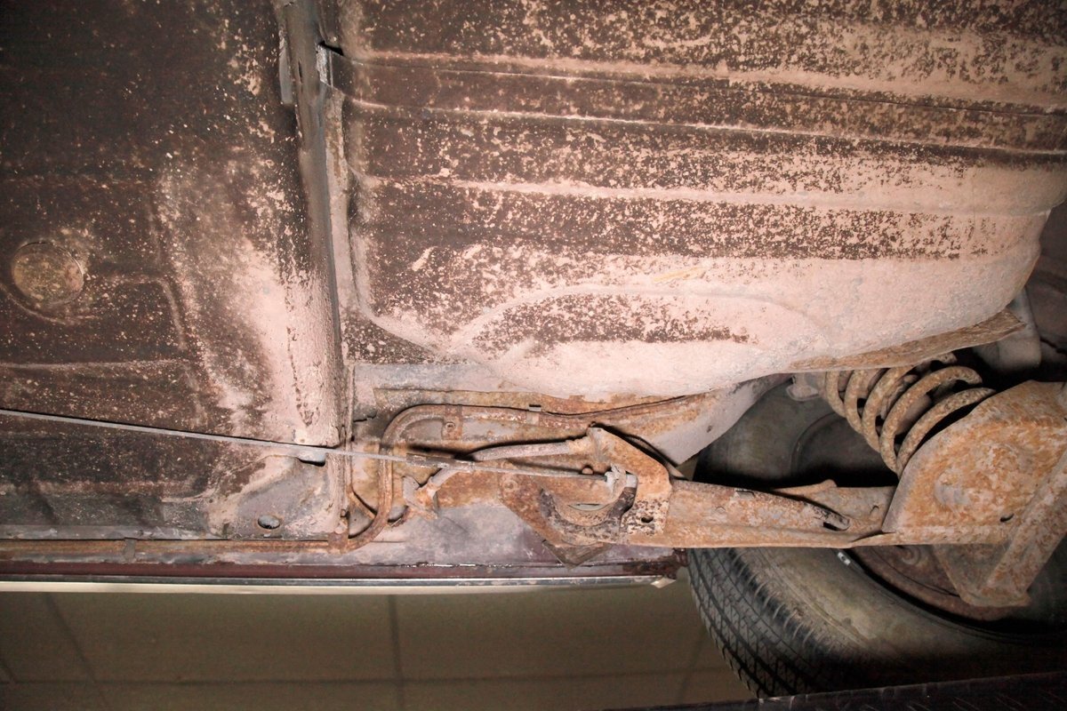 Plenty of aged patina, and some surface rust cover all the undercarriage surfaces. Heavy surface rust is on springs, gas tank and brake housings as well as suspension parts. Speaking of which includes independent Macpherson struts for the front, and coil springs for the back. Power disc braking is on front, and power drums are on the back.
