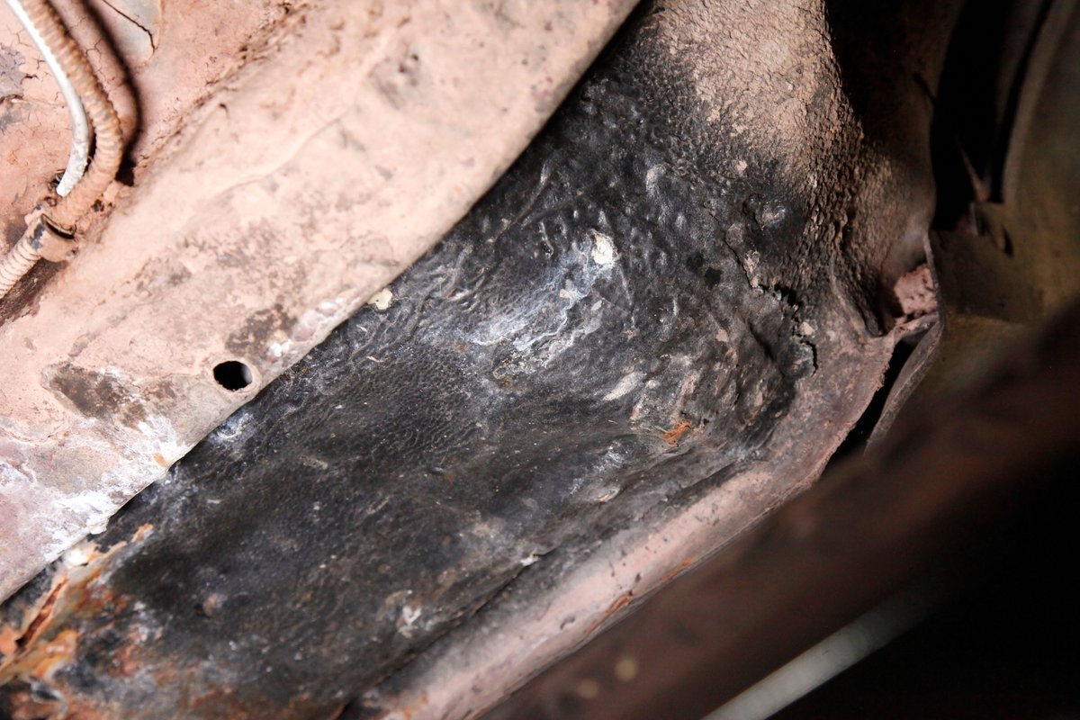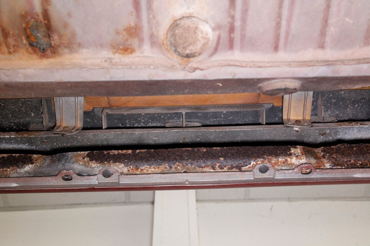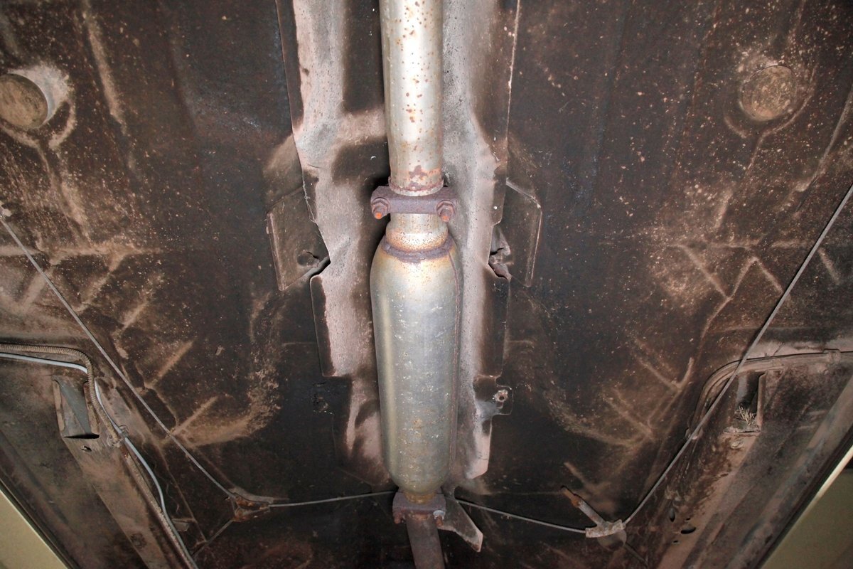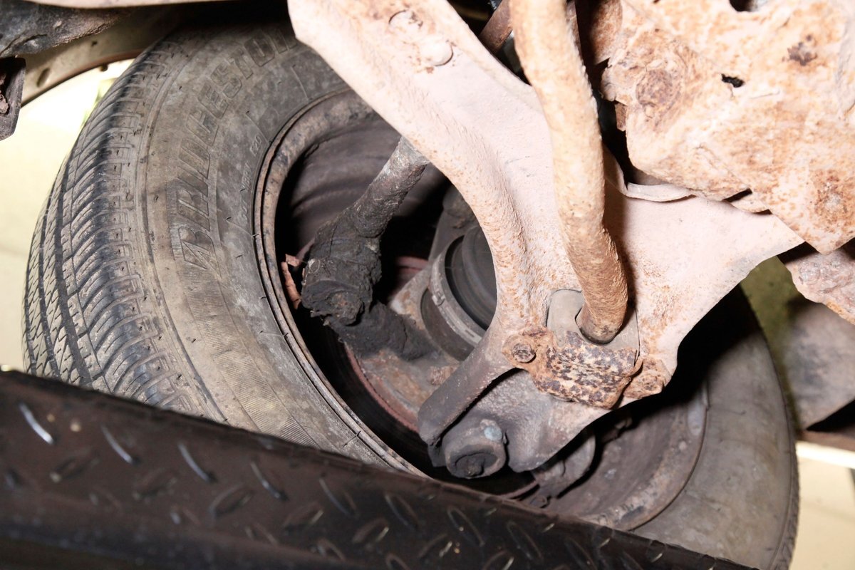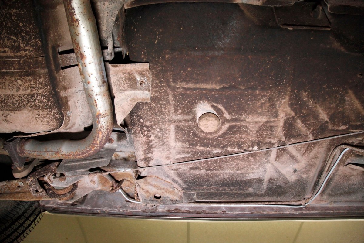 Plenty of aged patina, and some surface rust cover all the undercarriage surfaces. Heavy surface rust is on springs, gas tank and brake housings as well as suspension parts. Speaking of which includes independent Macpherson struts for the front, and coil springs for the back. Power disc braking is on front, and power drums are on the back.