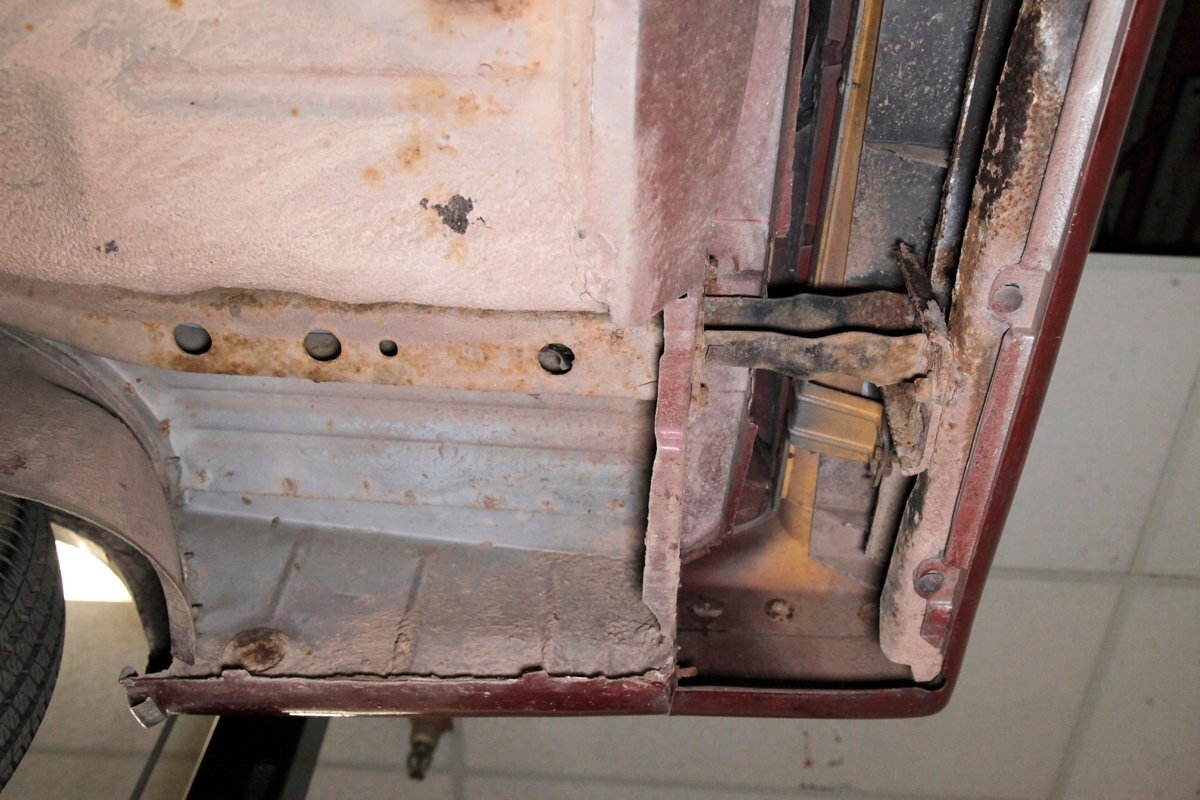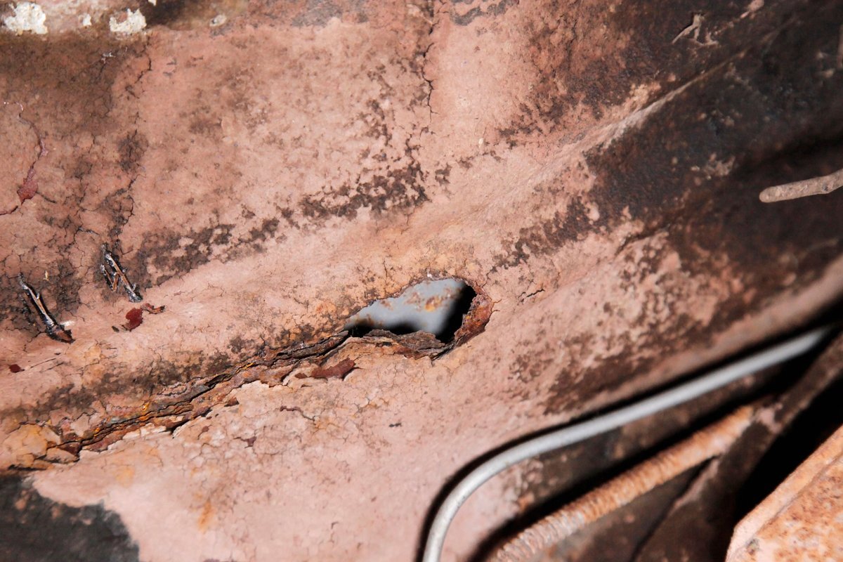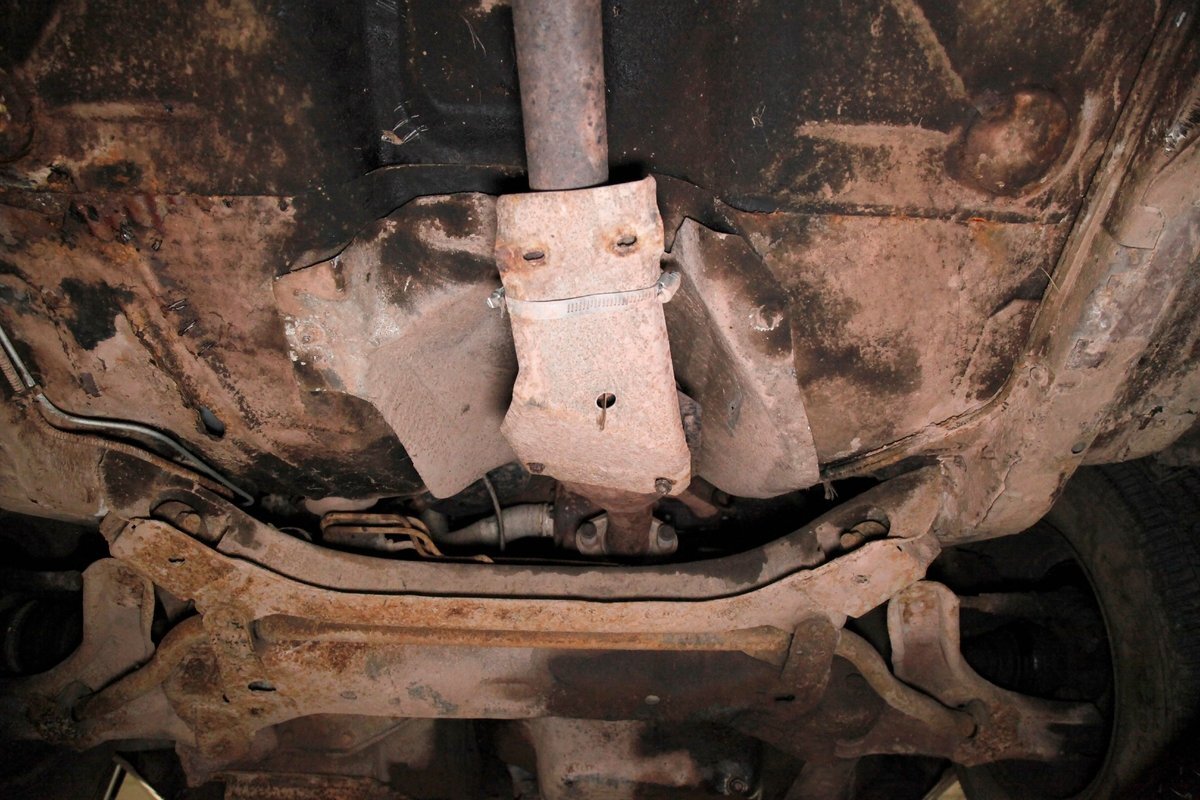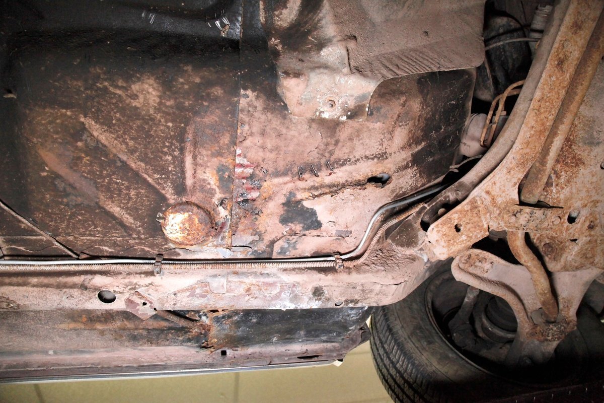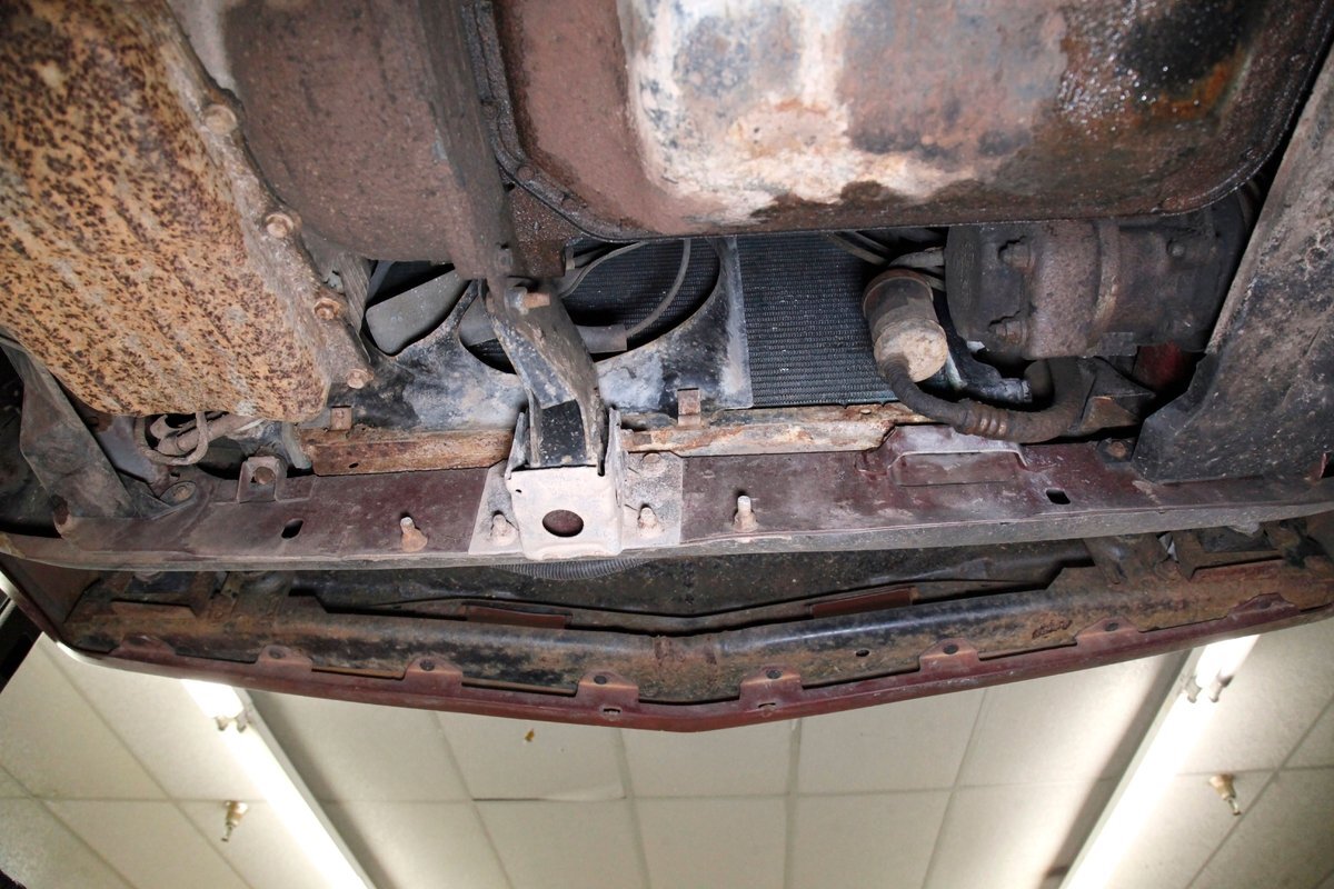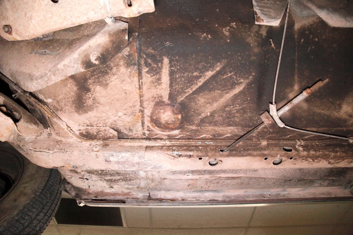 Plenty of aged patina, and some surface rust cover all the undercarriage surfaces. Heavy surface rust is on springs, gas tank and brake housings as well as suspension parts. Speaking of which includes independent Macpherson struts for the front, and coil springs for the back. Power disc braking is on front, and power drums are on the back.